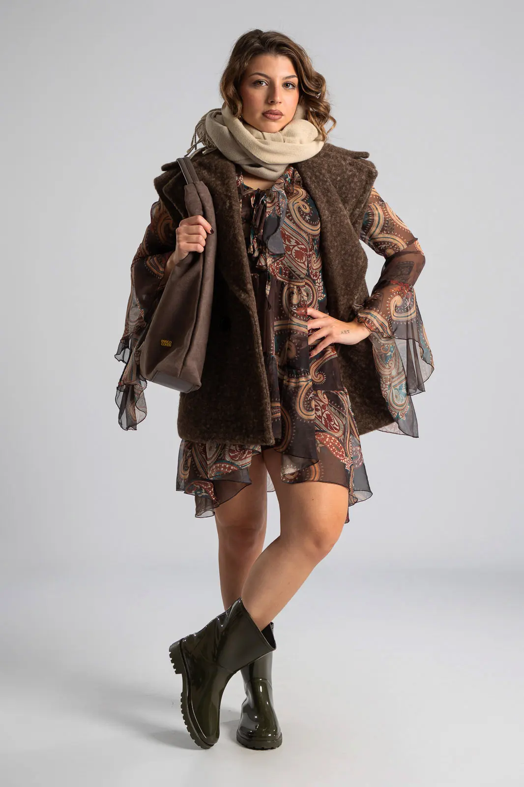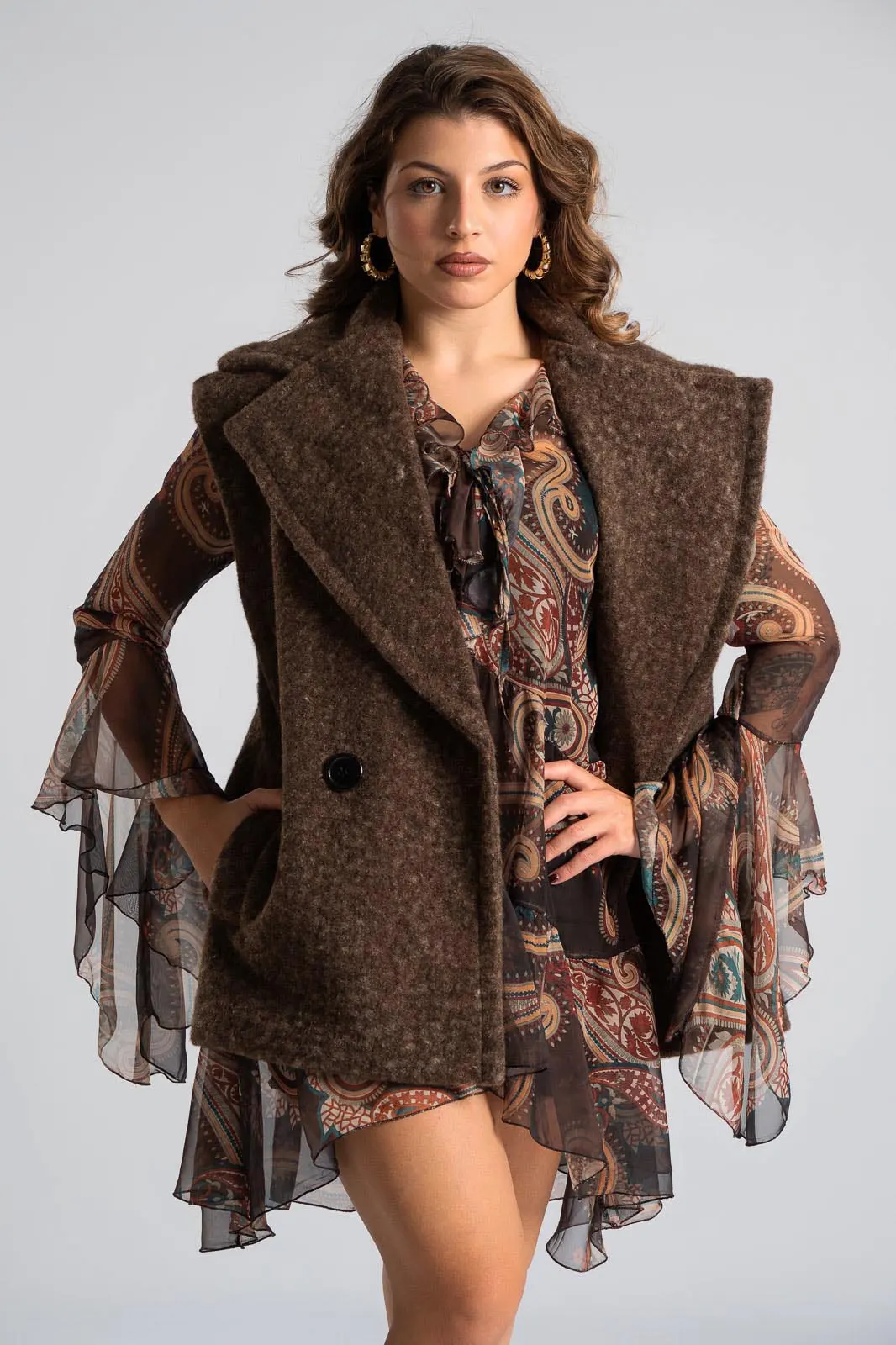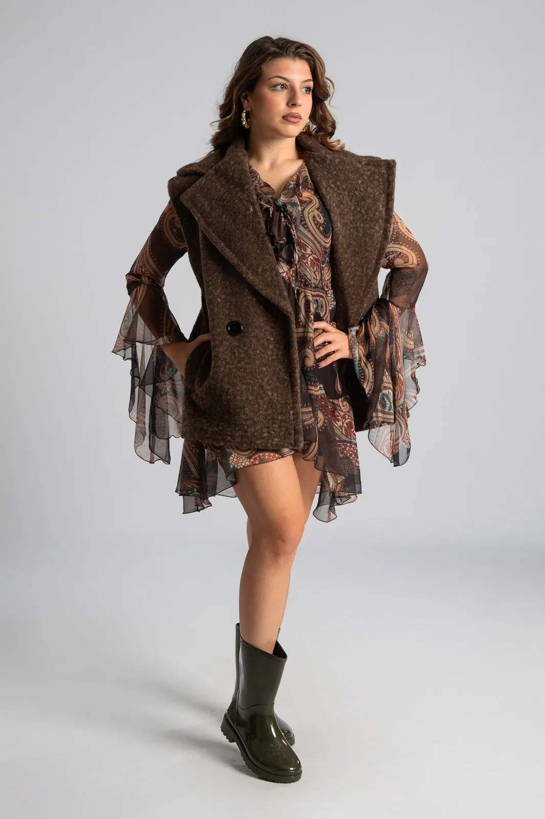 Sleeveless vest melange. It has a collar and lapels. It fastens with a button and has a decorative detail on the inside. It has side pockets. It has a fluffy texture all over. The measurements were taken with the buttons closed and it is lined on the inside. The measurements in the table are representative for each code. 100% polyester.