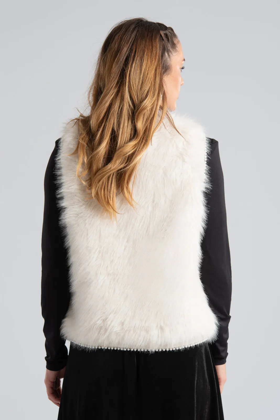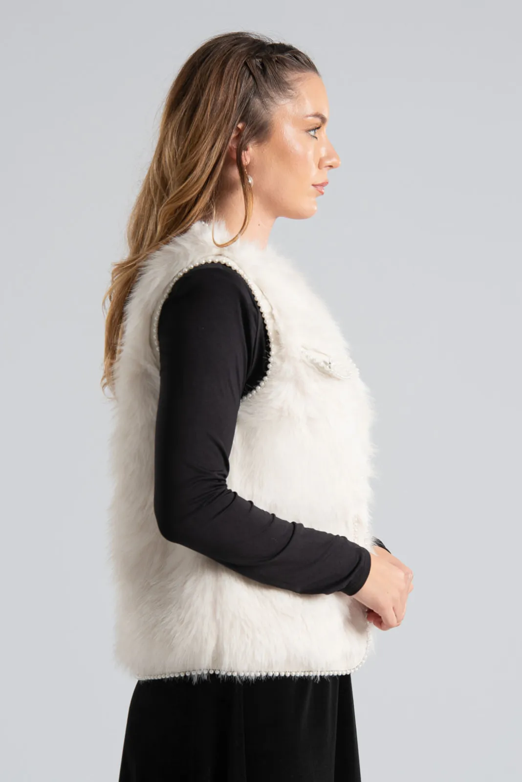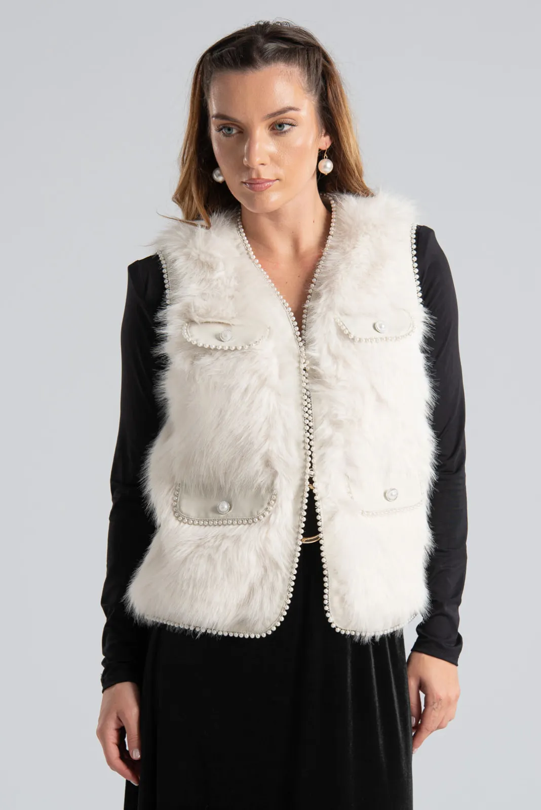 Γιλέκο δερματίνη με λεπτομέρειες από συνθετική γούνα. Περιμετρικά στο γιλέκο και στους ώμους διαθέτει διακοσμητικές πέρλες. Στο μπροστινό μέρος διαθέτει 4 μπροστινές τσέπες, 2 εικονικές και 2 κανονικές. Εσωτερικά είναι φοδραρισμένο. Είναι σε ίσια γραμμή και κλείνει με γάντζο. Οι μετρήσεις του πίνακα είναι αντιπροσωπευτικές για κάθε κωδικό. 100% polyester.