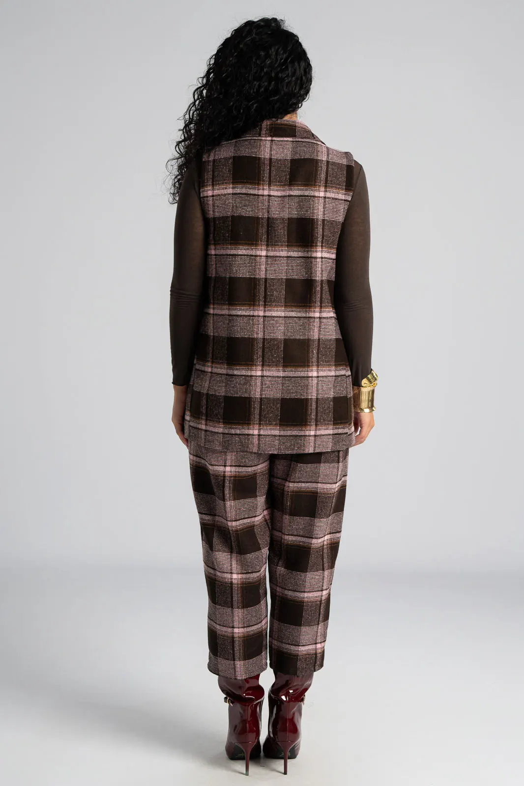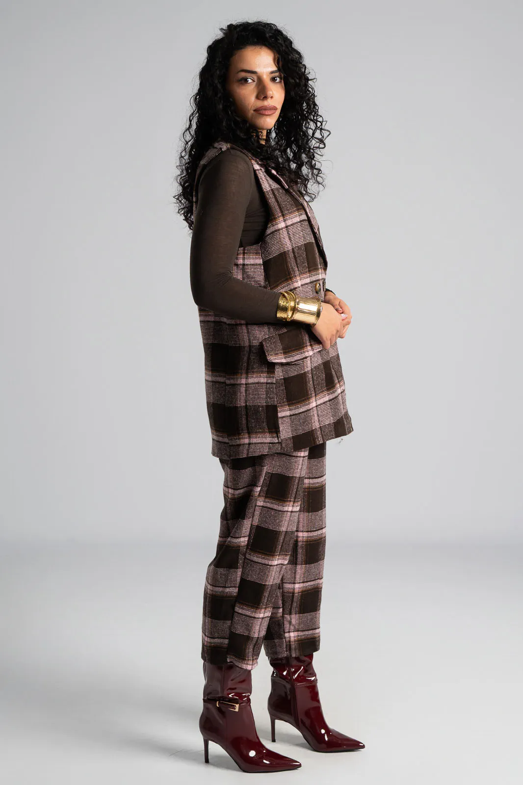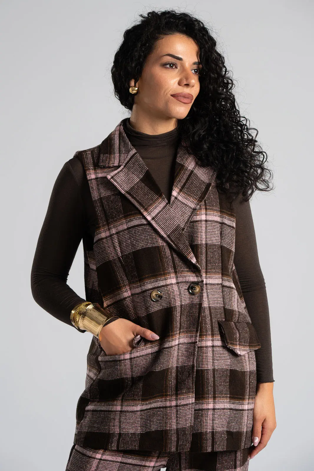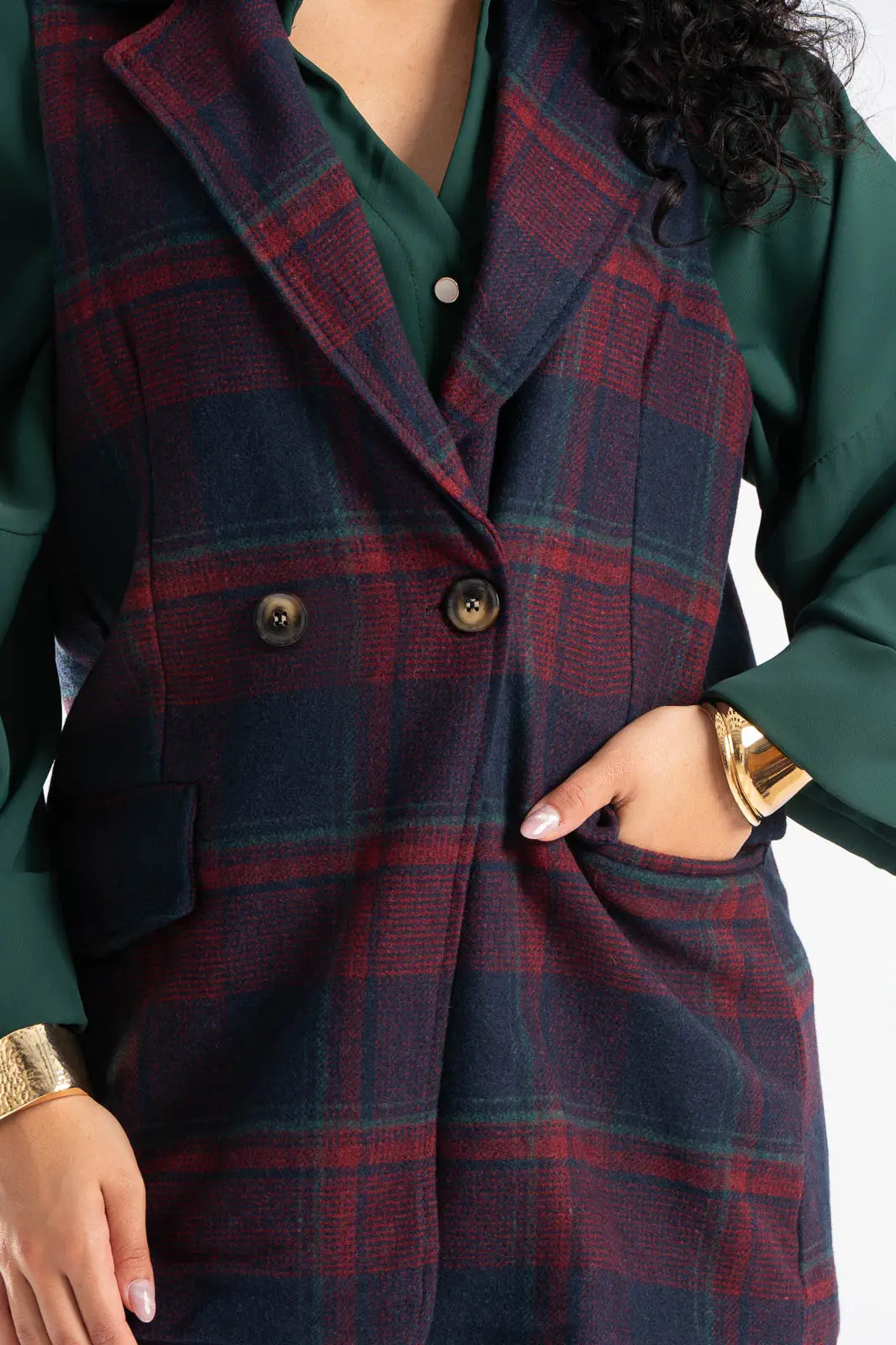 Γιλέκο με καρώ print. Είναι αμάνικο και έχει παρτούς ώμους. Διαθέτει γιακά και πέτο. Στο μπροστινό μέρος έχει τσέπες με καπάκι. Κλείνει με ένα κουμπί και ένα διακοσμητικό. Εσωτερικά είναι φοδραρισμένο. Έχει μάλλινη υφή. Οι μετρήσεις του πίνακα είναι αντιπροσωπευτικές για κάθε προϊόν. 90% polyester, 10% elastan.