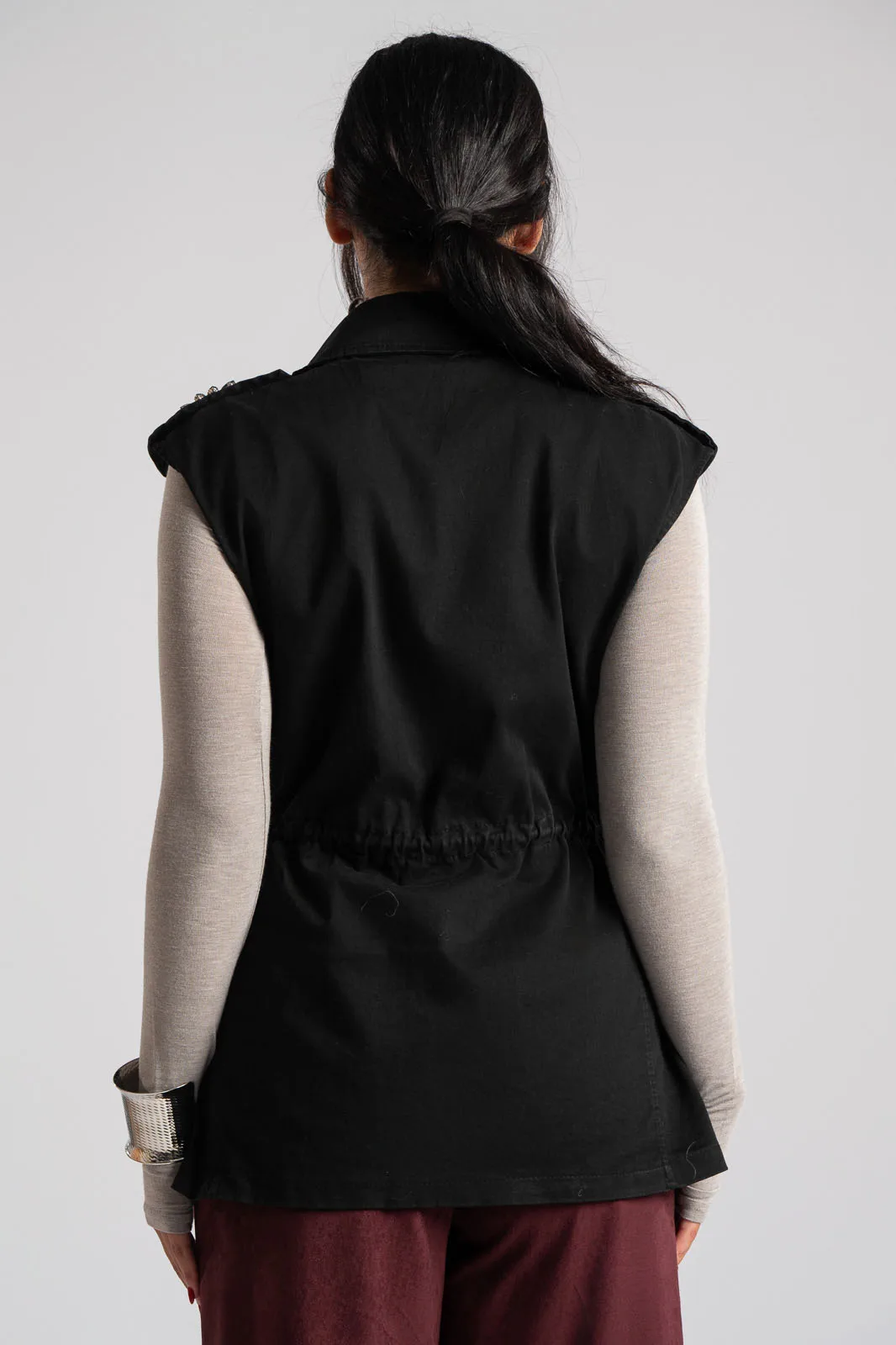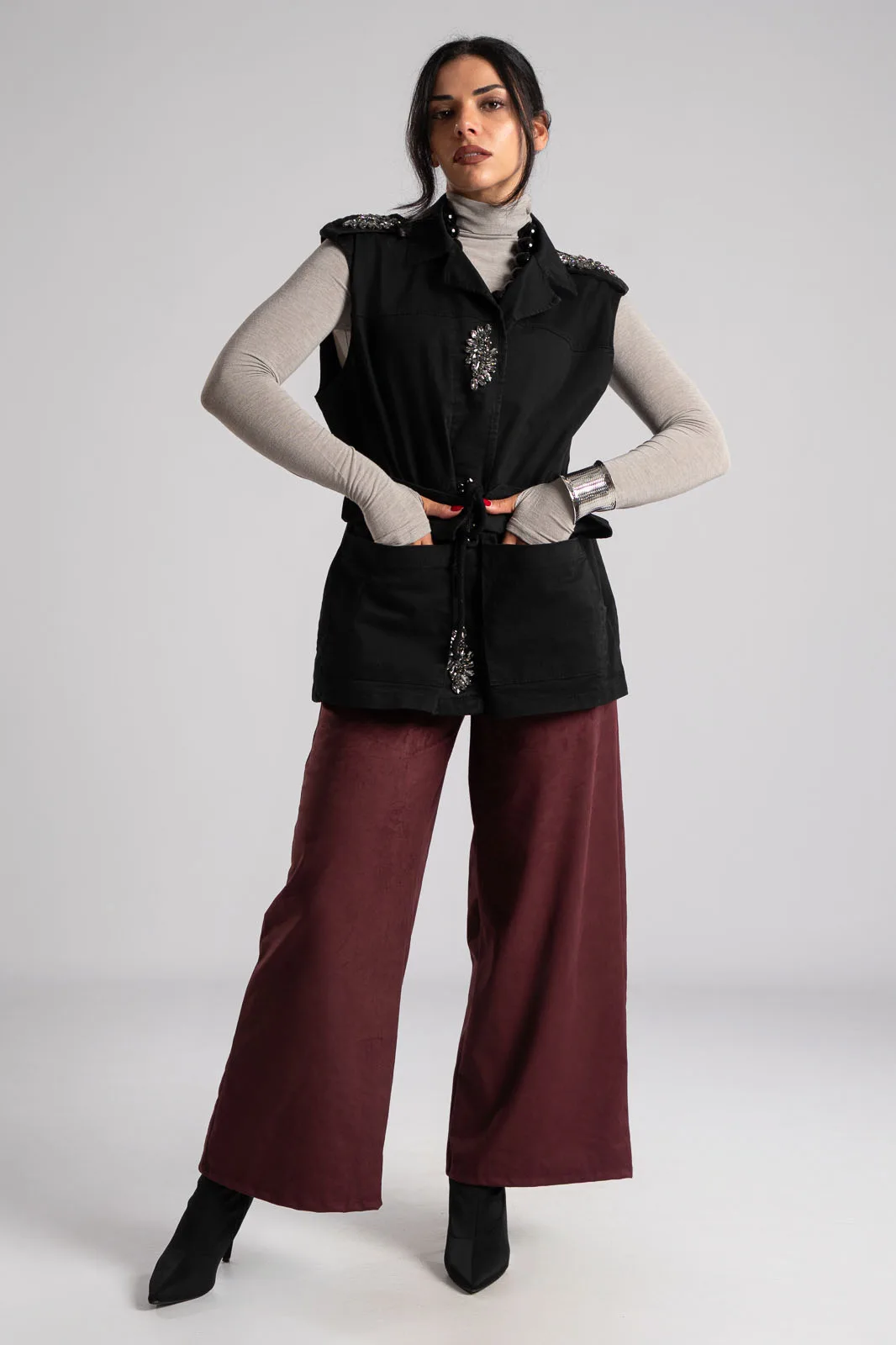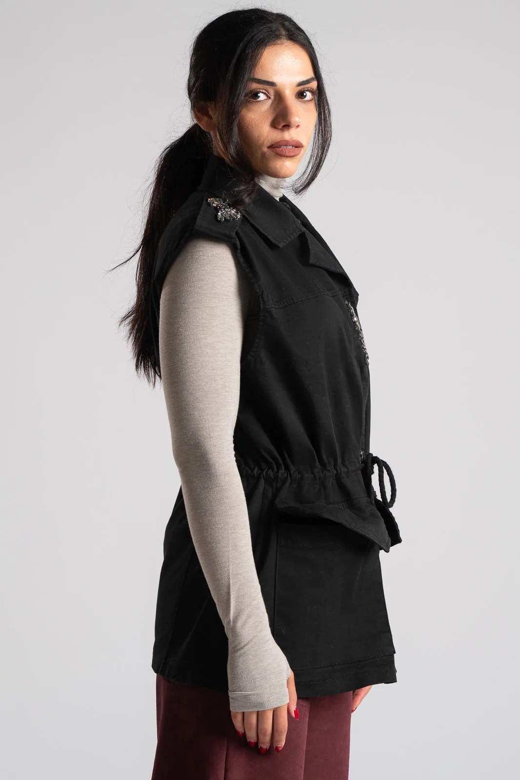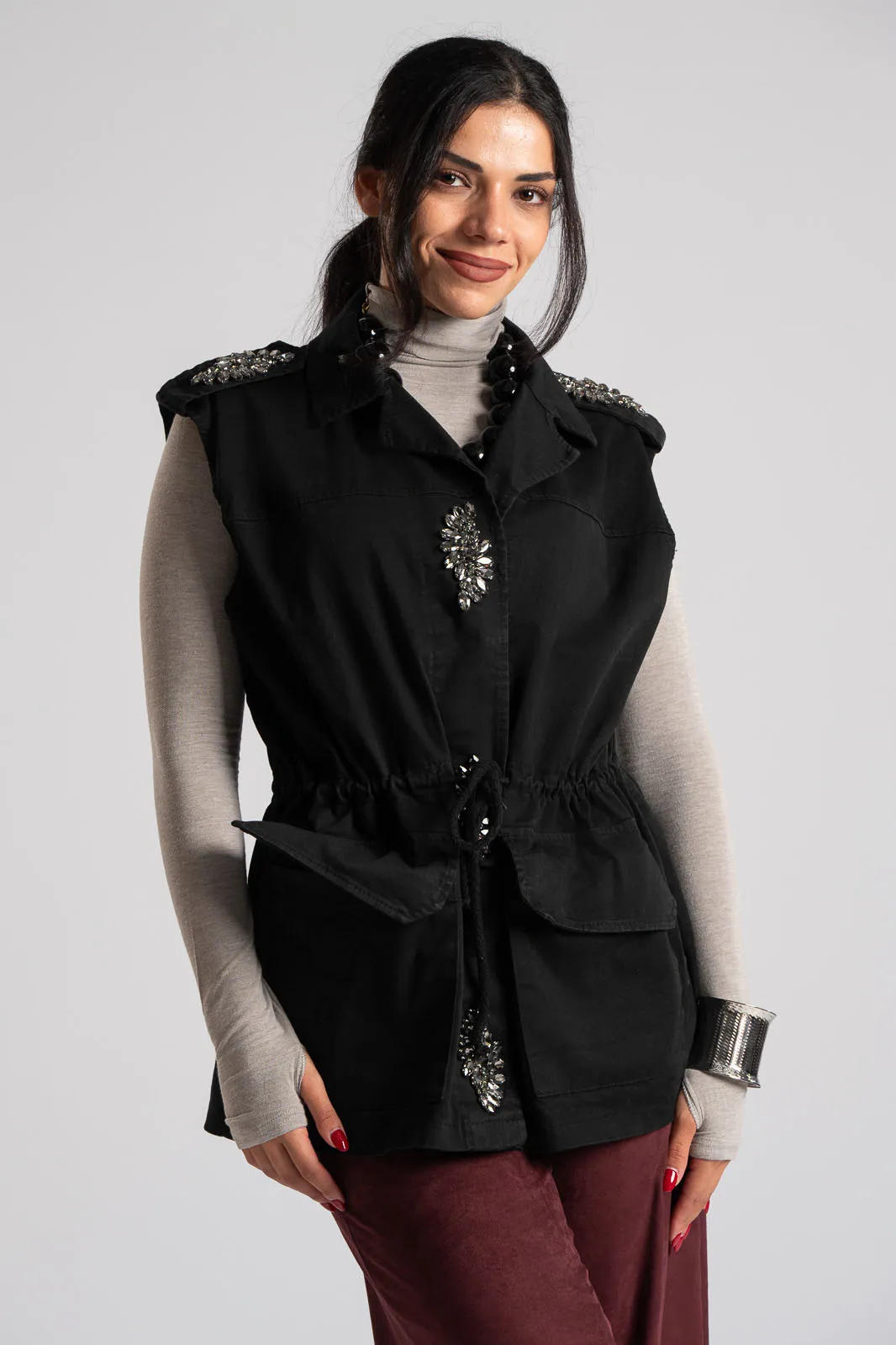 Γιλέκο με γιακά. Διαθέτει στις επωμίδες διακοσμητικά στρας. Στο μπροστινό μέρος έχει τσέπες τετράγωνες με καπάκι. Στη μέση έχει εσωτερικό κορδόνι που δένει στο μπροστινό μέρος. Κλείνει με κουμπιά που είναι καλυμμένα με πατιλέτα η οποία είναι διακοσμημένη με στρας. Οι μετρήσεις του πίνακα είναι αντιπροσωπευτικές για κάθε κωδικό. 95% polyester, 5% elastan.