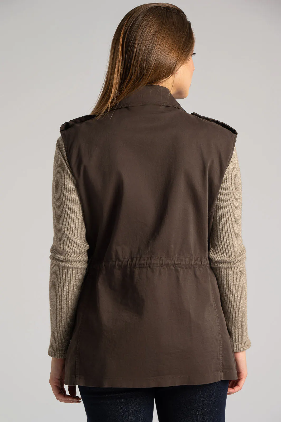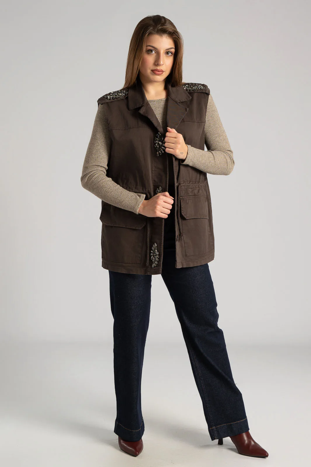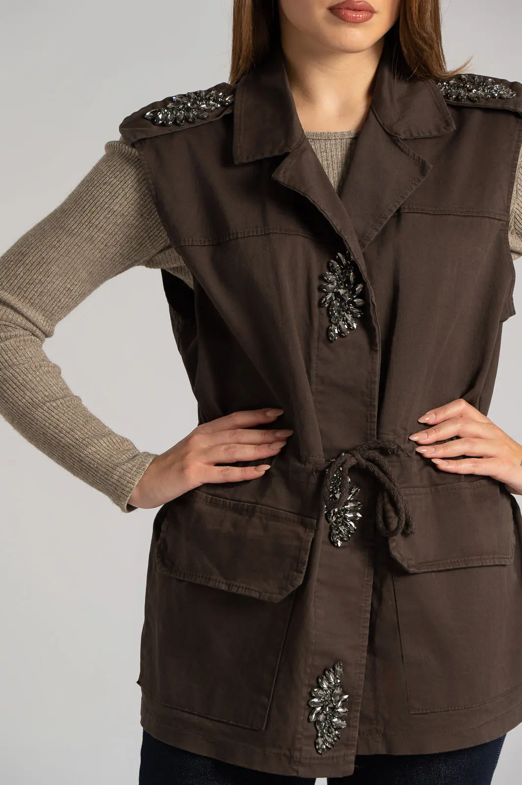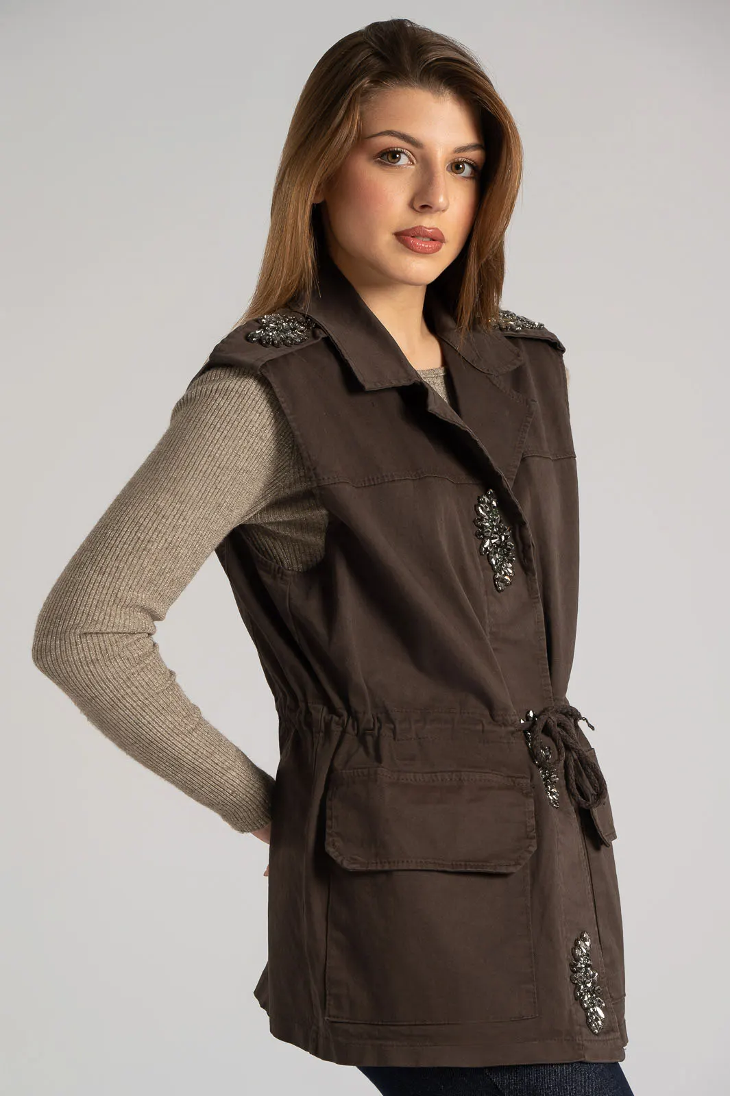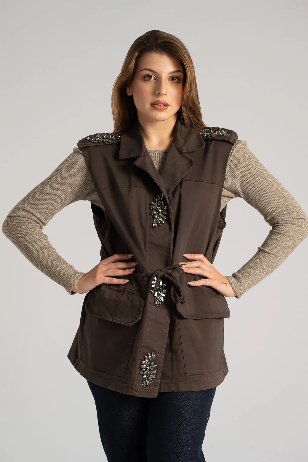 Γιλέκο με γιακά. Διαθέτει στις επωμίδες διακοσμητικά στρας. Στο μπροστινό μέρος έχει τσέπες τετράγωνες με καπάκι. Στη μέση έχει εσωτερικό κορδόνι που δένει στο μπροστινό μέρος. Κλείνει με κουμπιά που είναι καλυμμένα με πατιλέτα η οποία είναι διακοσμημένη με στρας. Οι μετρήσεις του πίνακα είναι αντιπροσωπευτικές για κάθε κωδικό. 95% polyester, 5% elastan.