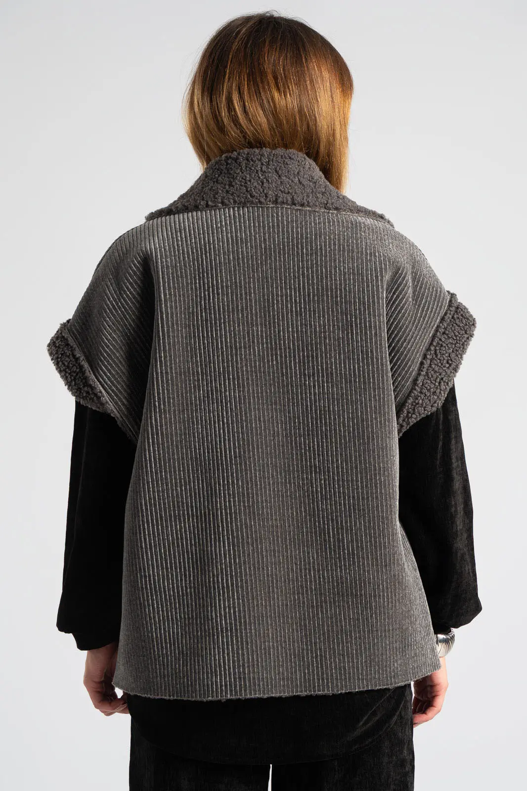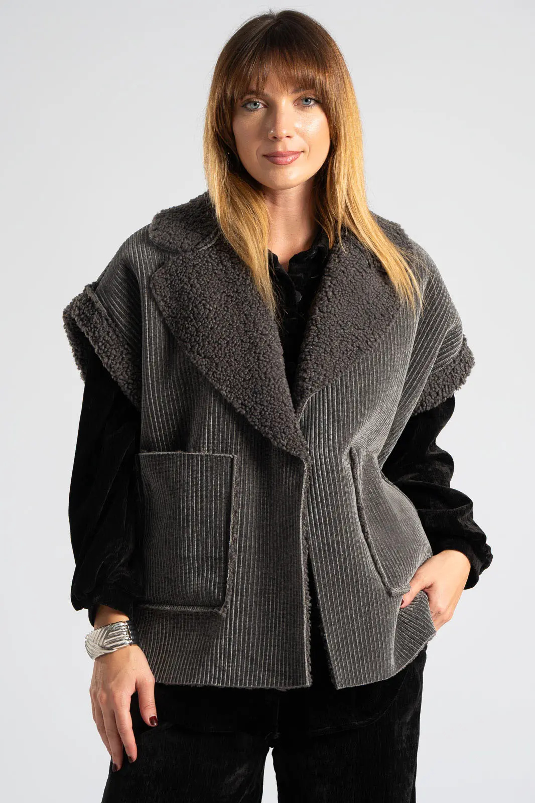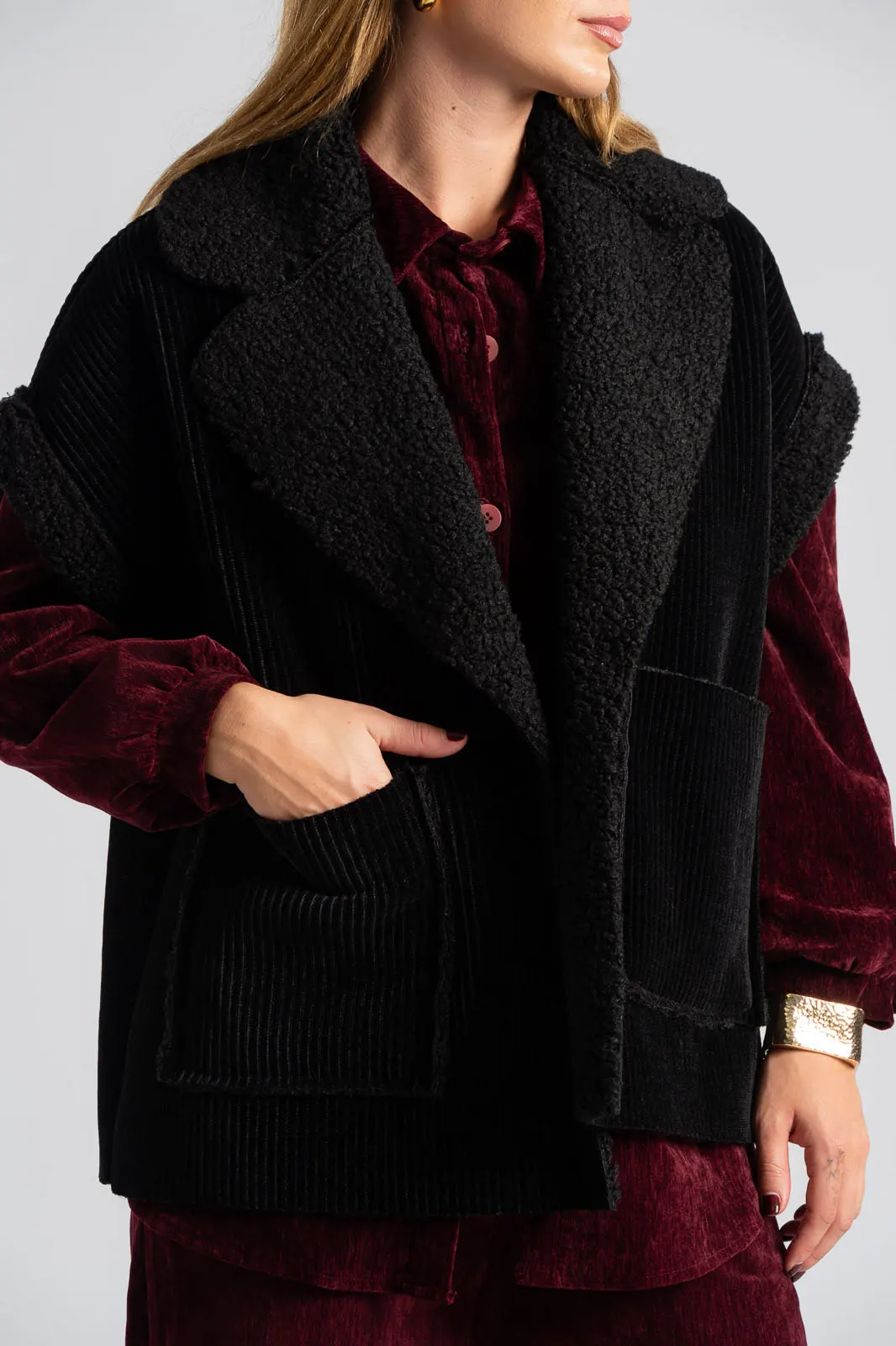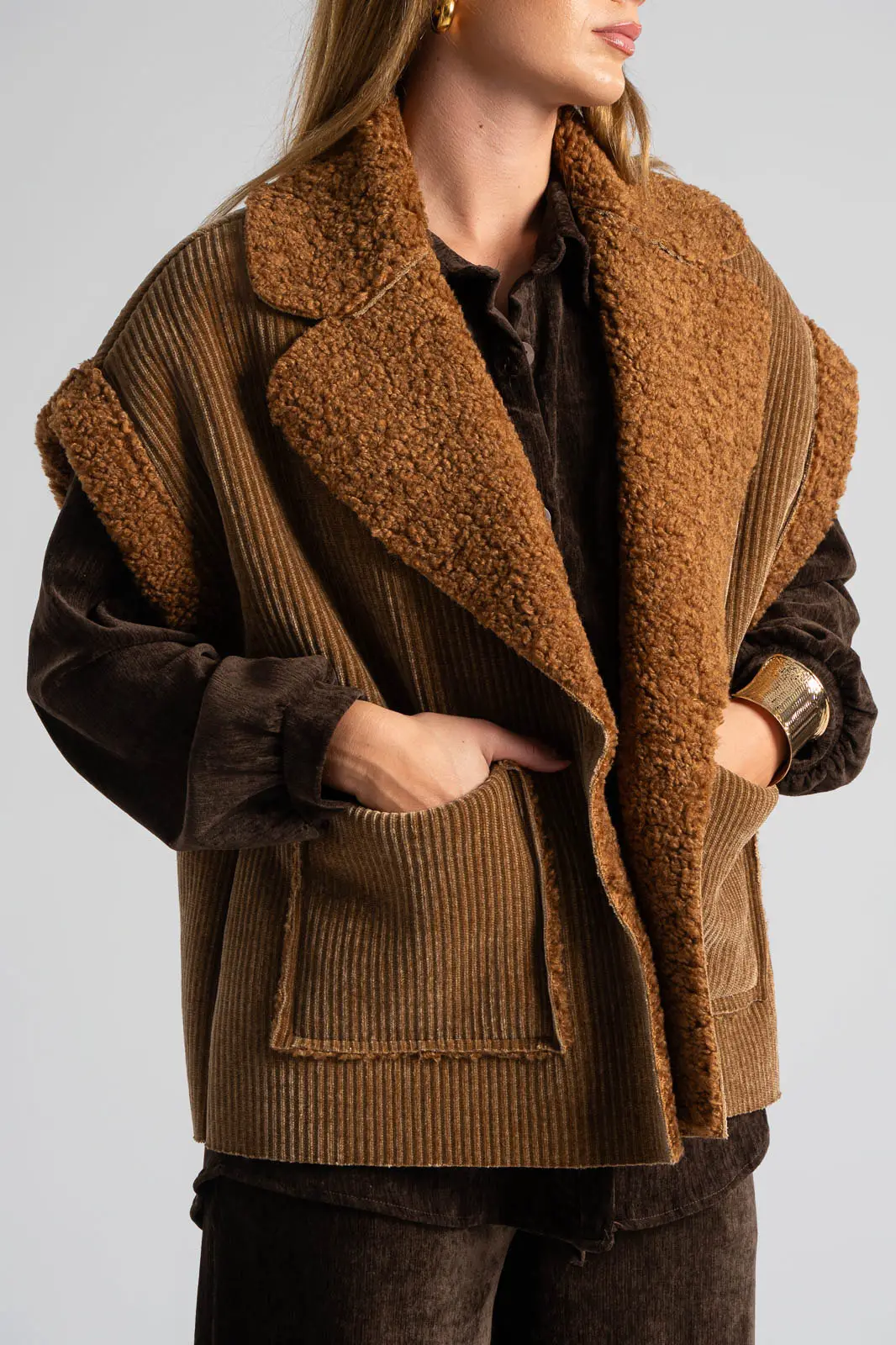Γιλέκο με πολύ κοντά μανίκια. Σε όλη την επιφάνεια έχει κοτλέ υφή. Στον γιακά και περιμετρικά στα μανίκια είναι σε teddy υφή. Στο μπροστινό μέρος έχει τσέπες. Κλείνει με ένα κουμπί clutch. Η μέτρηση έχει γίνει με κλειστό κουμπί. Οι μετρήσεις του πίνακα είναι αντιπροσωπευτικές για κάθε κωδικό. 98% polyester, 2% elastan.