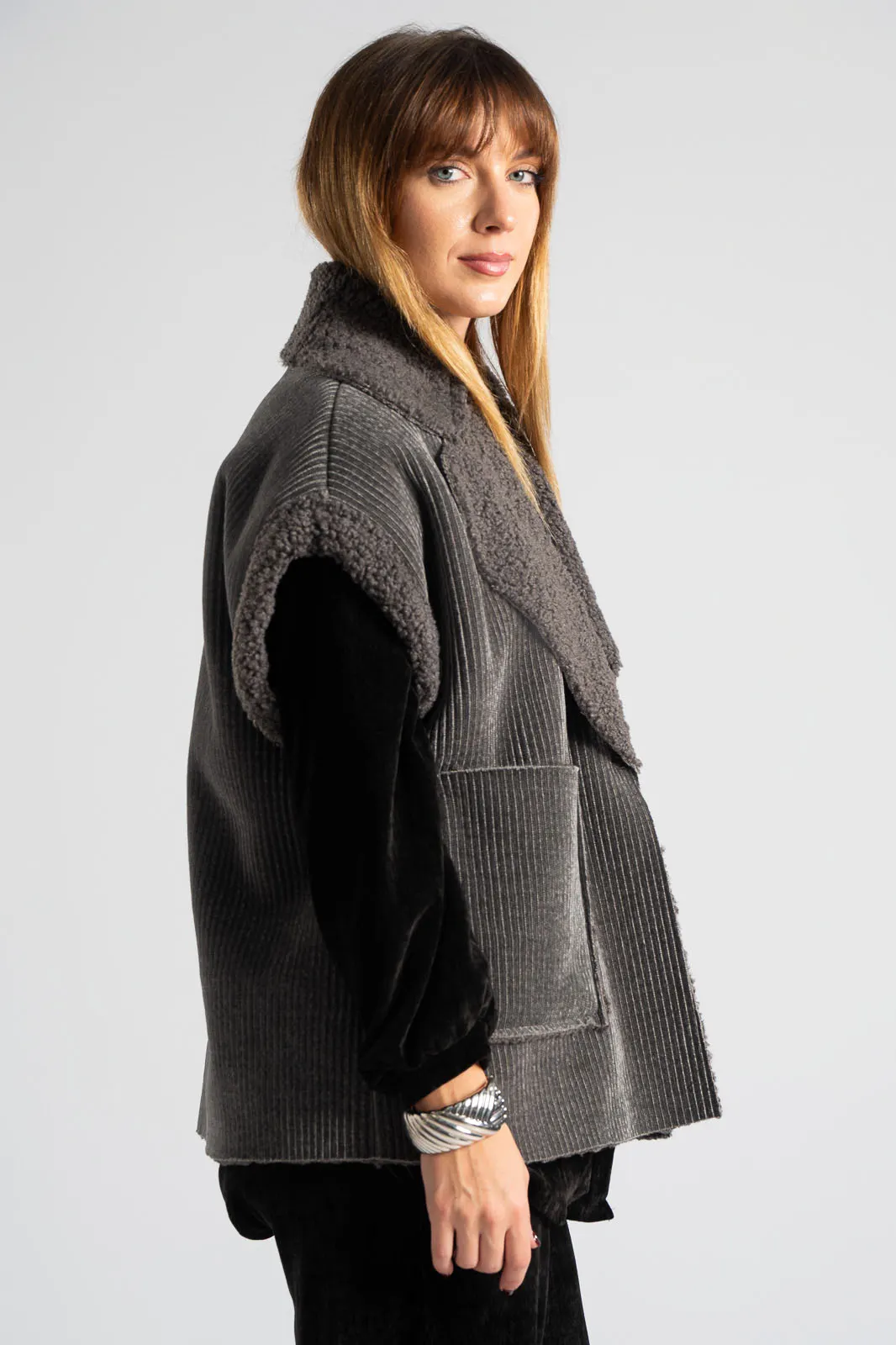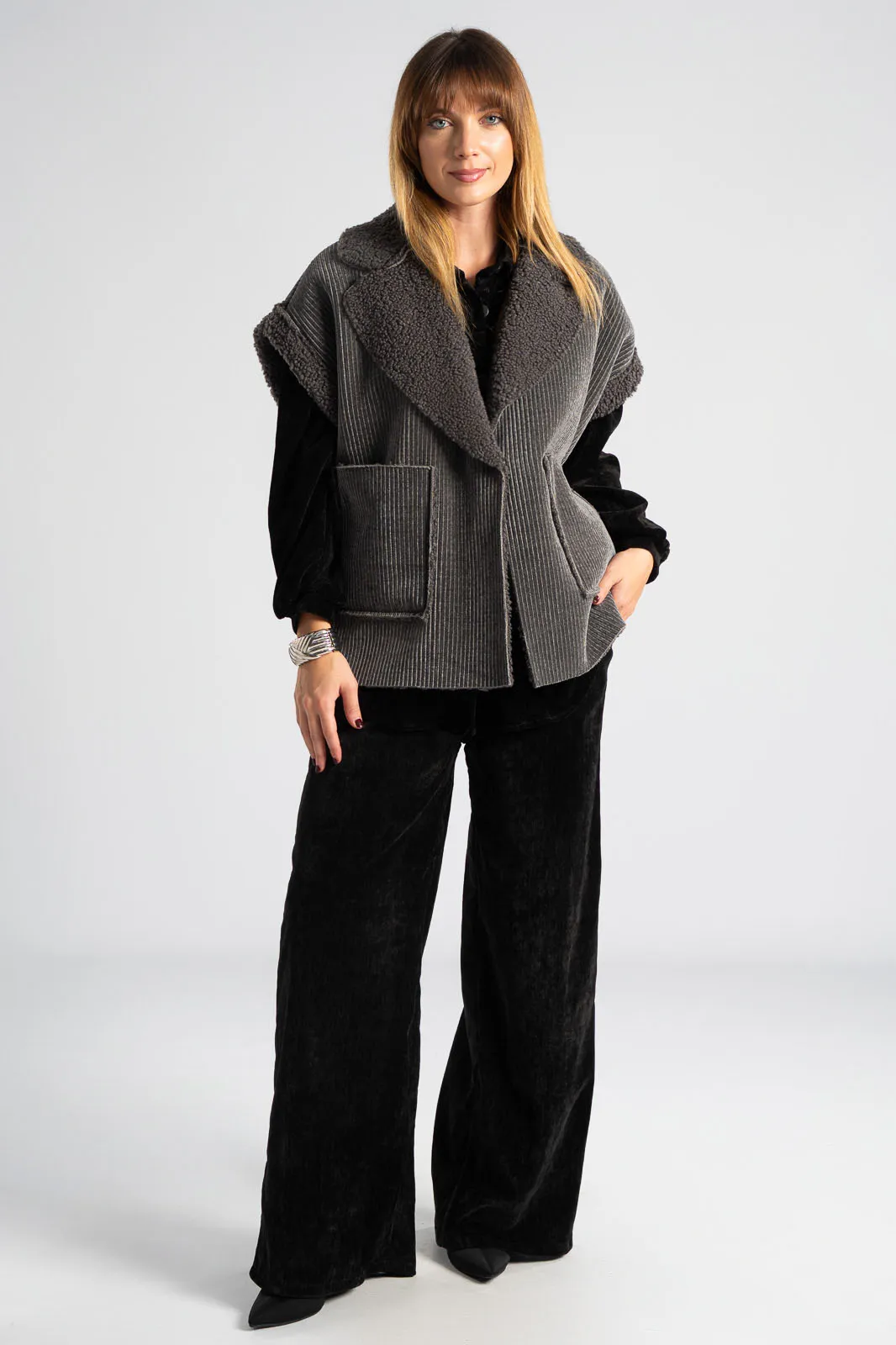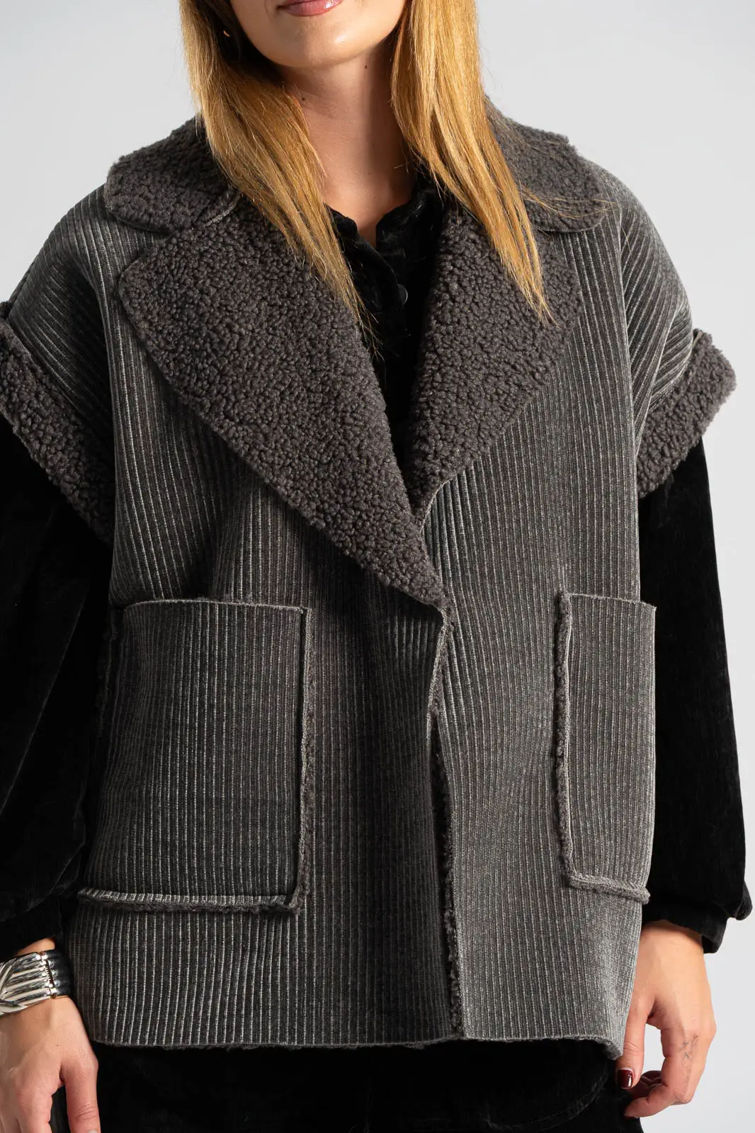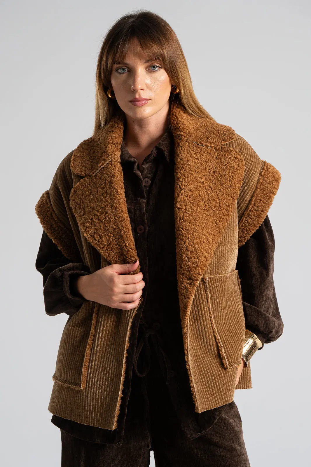 Γιλέκο με πολύ κοντά μανίκια. Σε όλη την επιφάνεια έχει κοτλέ υφή. Στον γιακά και περιμετρικά στα μανίκια είναι σε teddy υφή. Στο μπροστινό μέρος έχει τσέπες. Κλείνει με ένα κουμπί clutch. Η μέτρηση έχει γίνει με κλειστό κουμπί. Οι μετρήσεις του πίνακα είναι αντιπροσωπευτικές για κάθε κωδικό. 98% polyester, 2% elastan.