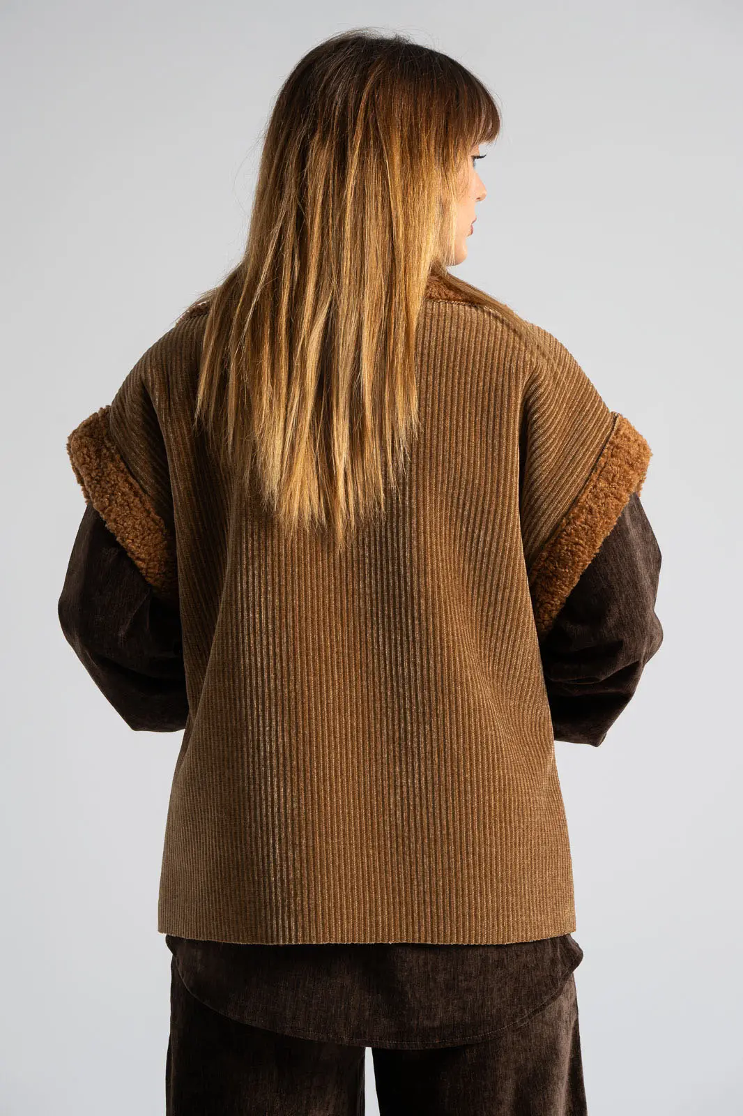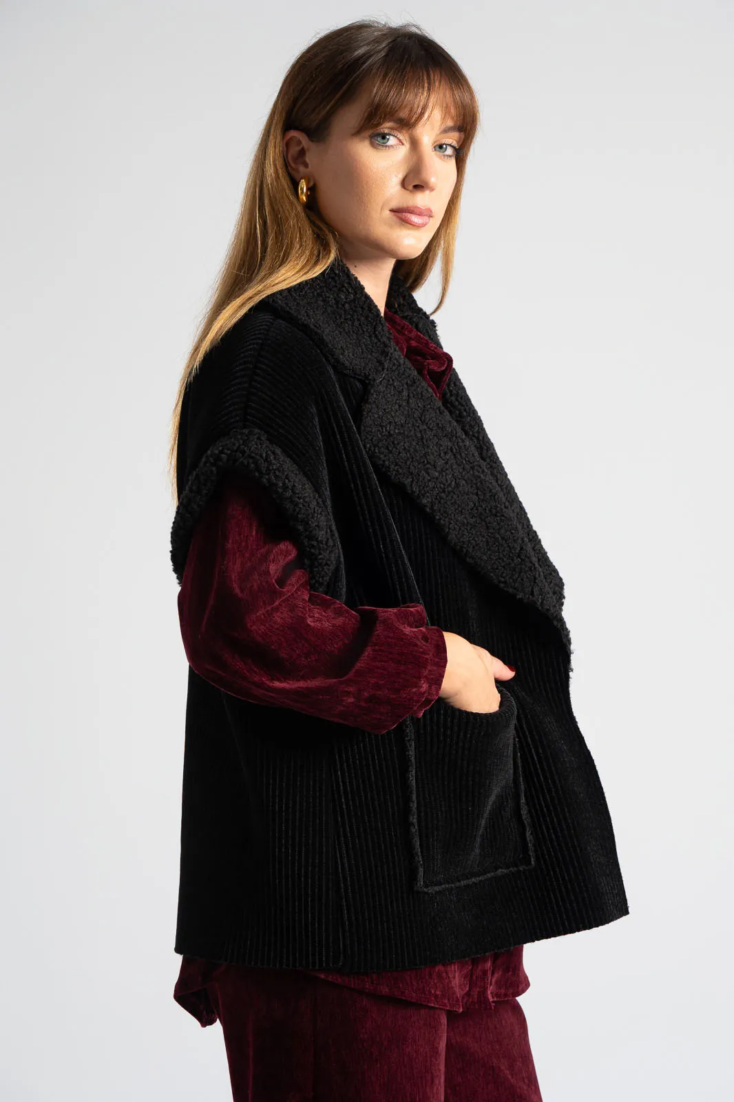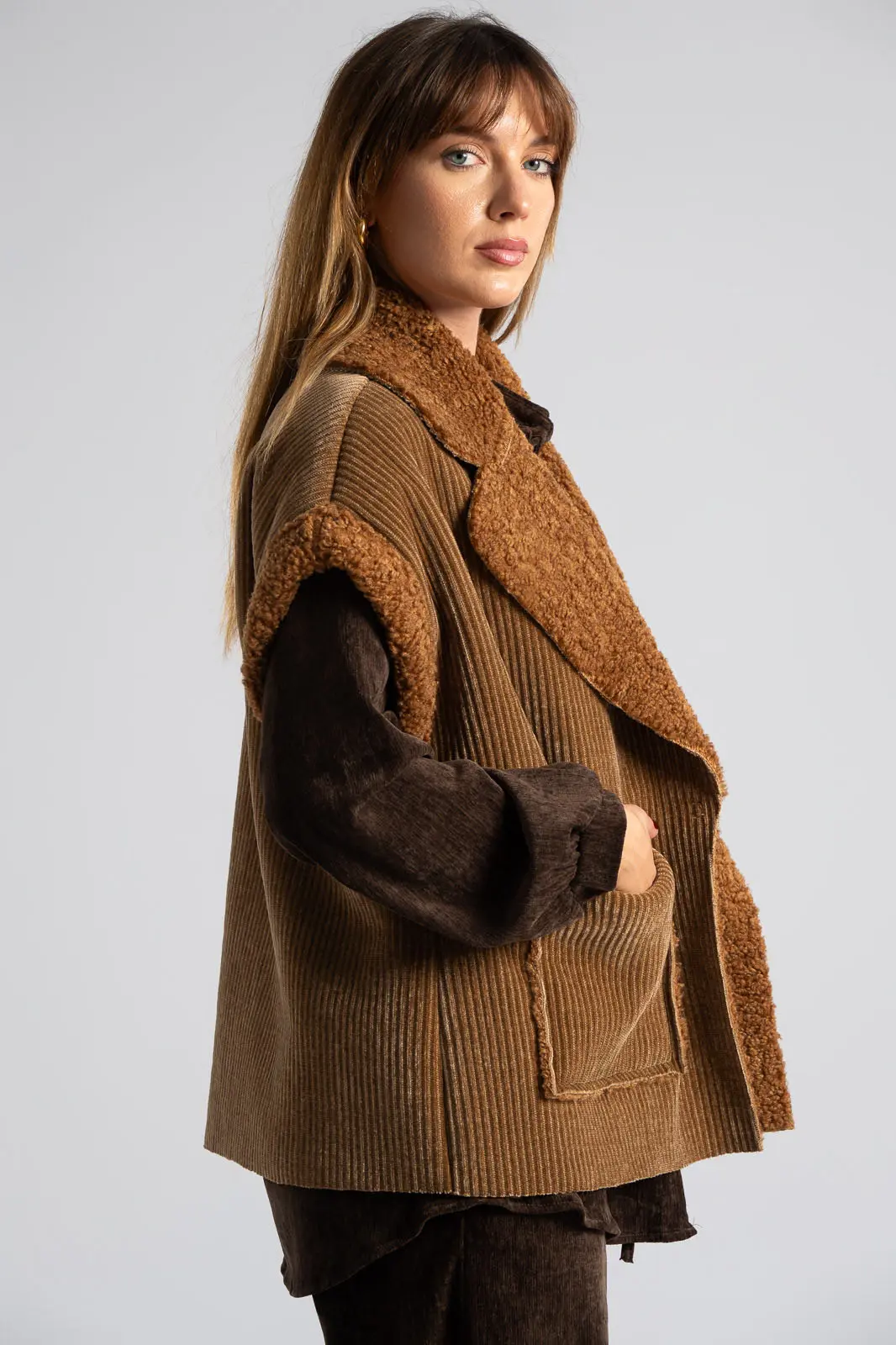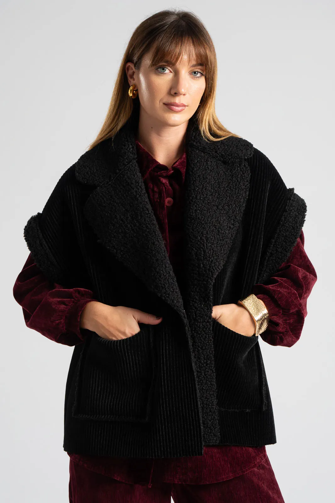 Γιλέκο με πολύ κοντά μανίκια. Σε όλη την επιφάνεια έχει κοτλέ υφή. Στον γιακά και περιμετρικά στα μανίκια είναι σε teddy υφή. Στο μπροστινό μέρος έχει τσέπες. Κλείνει με ένα κουμπί clutch. Η μέτρηση έχει γίνει με κλειστό κουμπί. Οι μετρήσεις του πίνακα είναι αντιπροσωπευτικές για κάθε κωδικό. 98% polyester, 2% elastan.