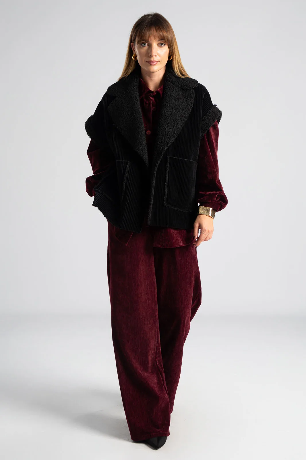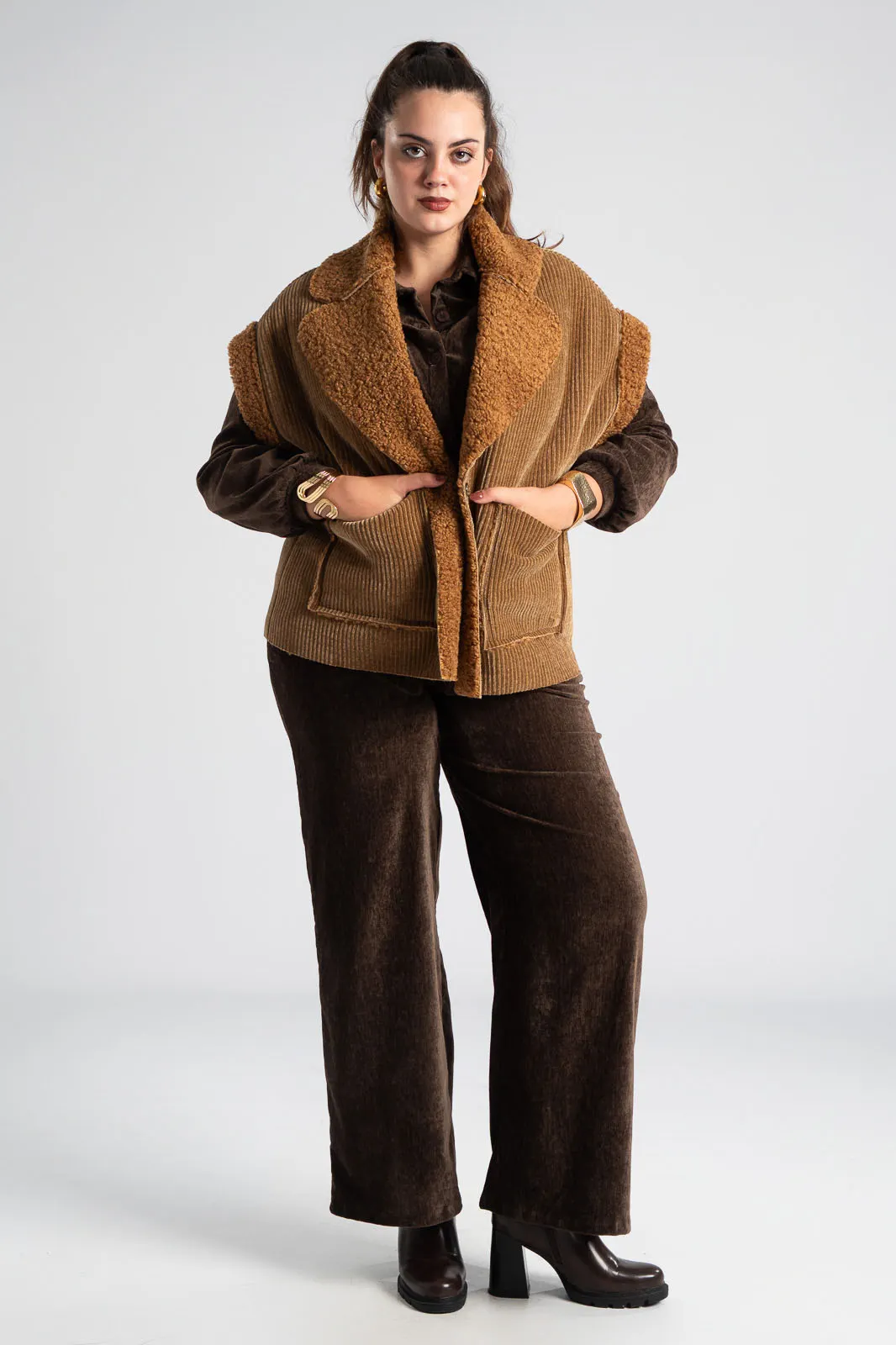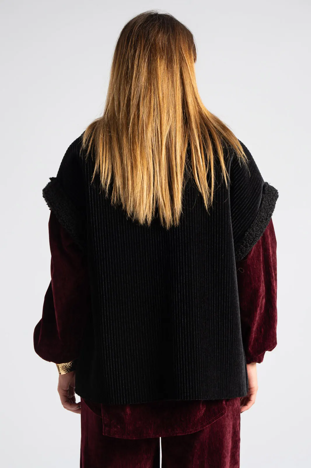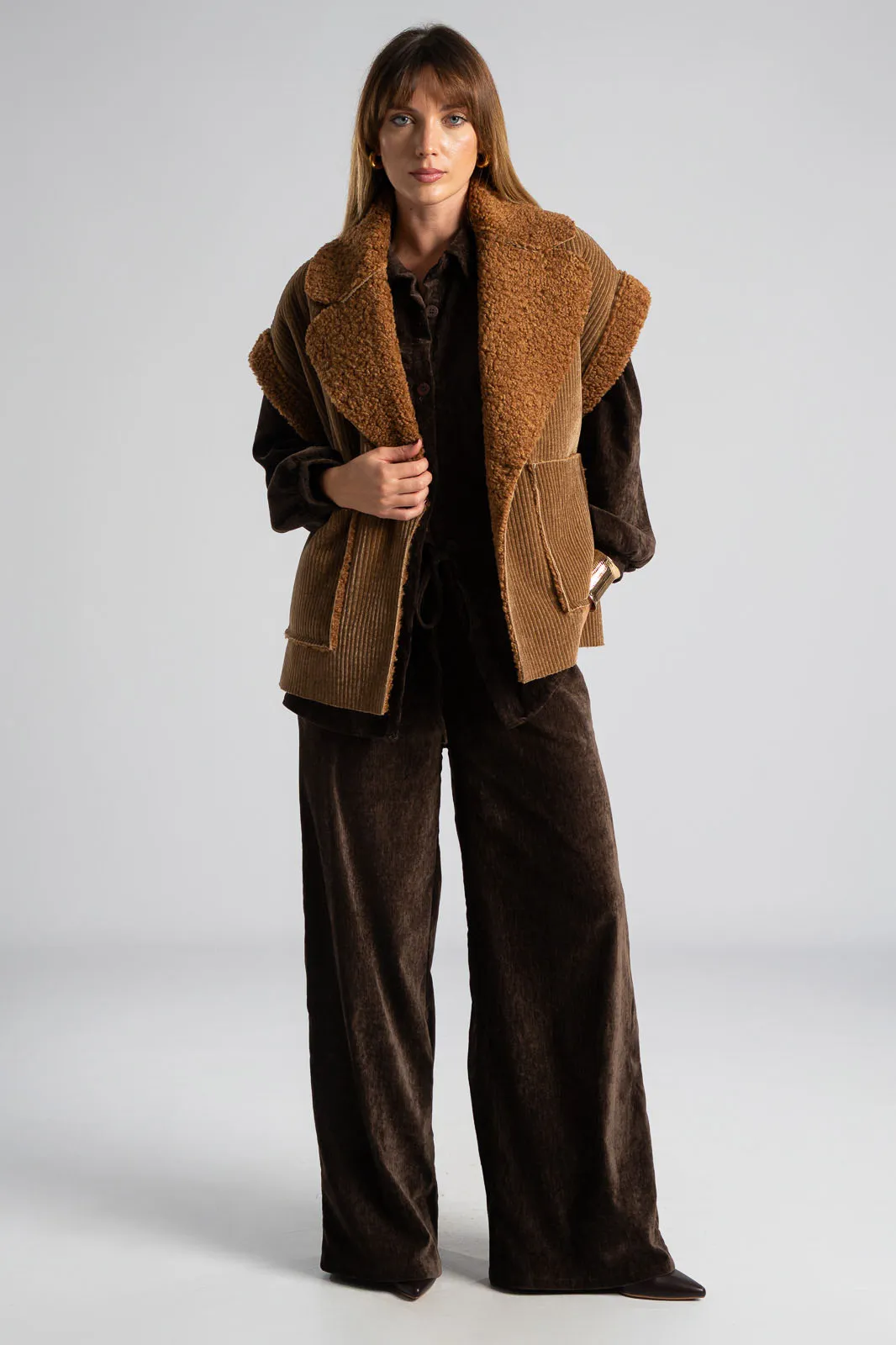 Γιλέκο με πολύ κοντά μανίκια. Σε όλη την επιφάνεια έχει κοτλέ υφή. Στον γιακά και περιμετρικά στα μανίκια είναι σε teddy υφή. Στο μπροστινό μέρος έχει τσέπες. Κλείνει με ένα κουμπί clutch. Η μέτρηση έχει γίνει με κλειστό κουμπί. Οι μετρήσεις του πίνακα είναι αντιπροσωπευτικές για κάθε κωδικό. 98% polyester, 2% elastan.