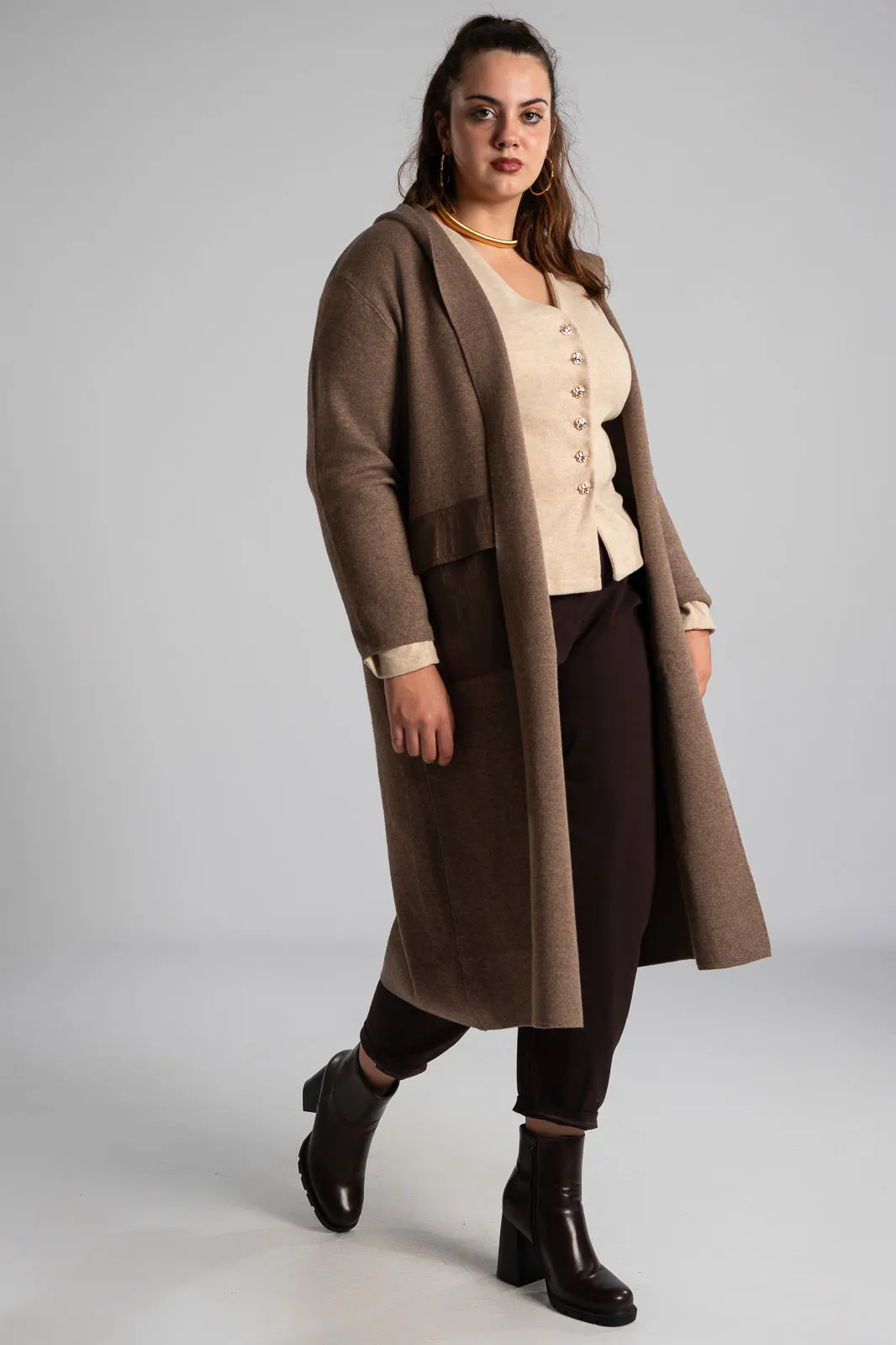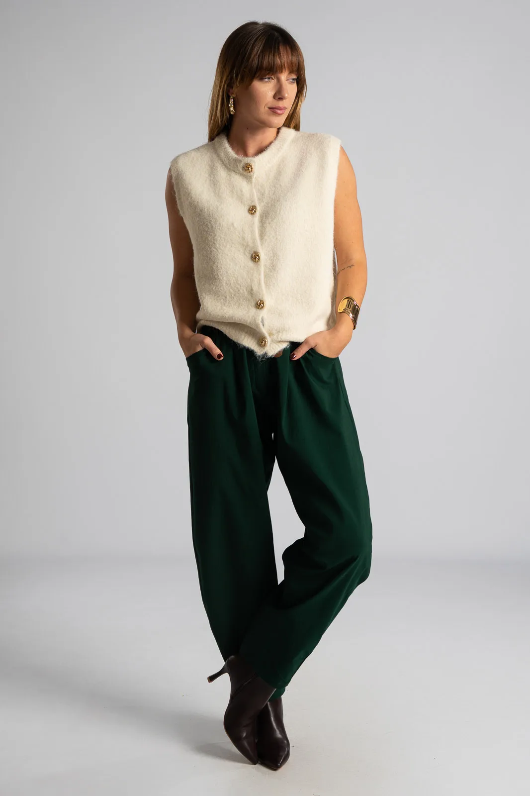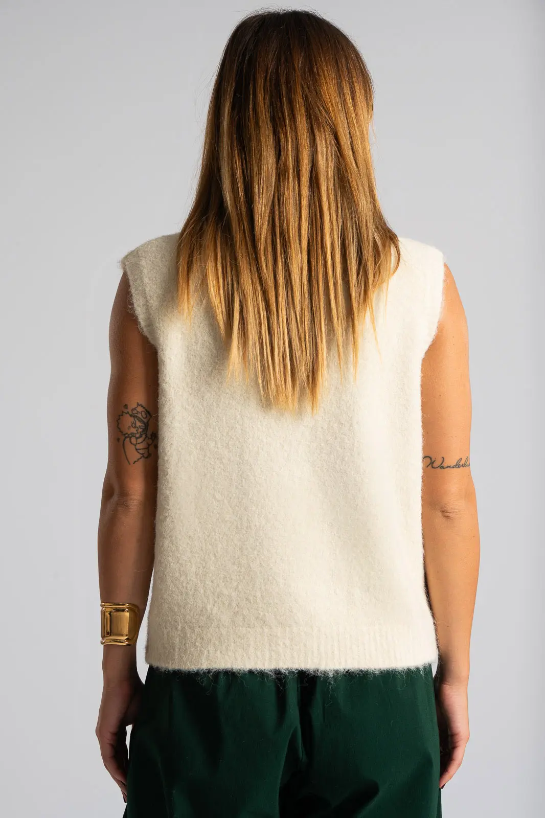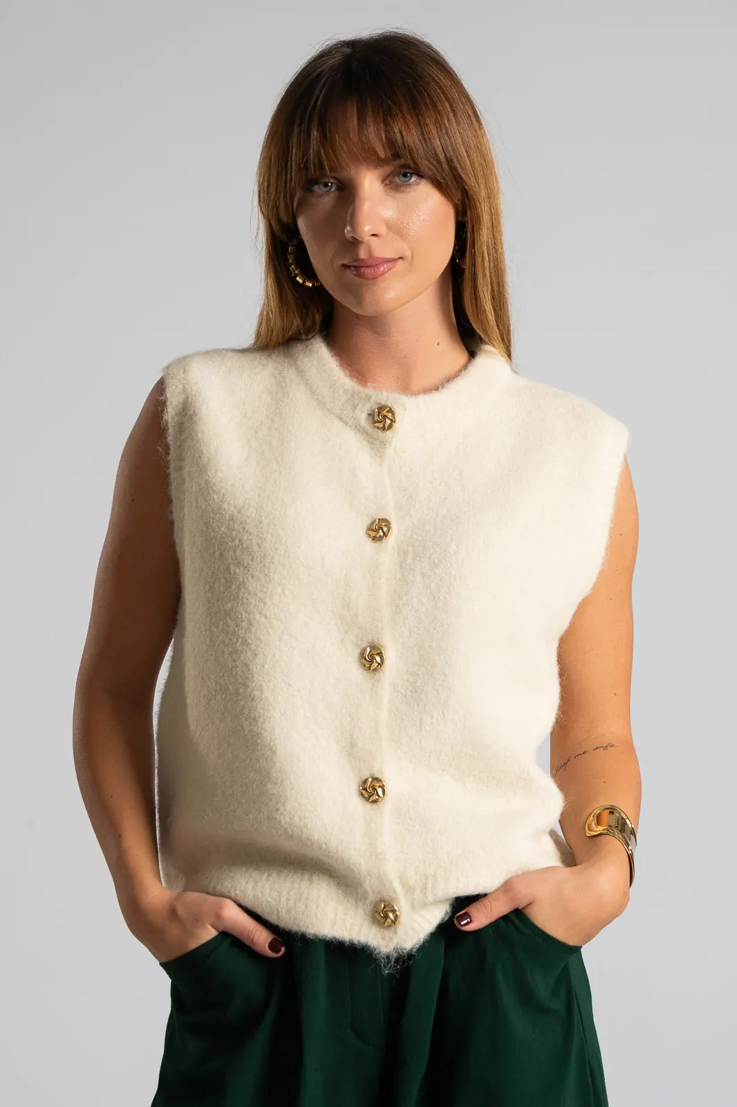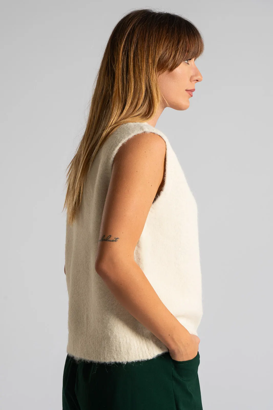 Vest with round neckline. It has a furry texture and fastens with buttons. It has a comfortable fit. Measurements are taken with the buttons closed. The measurements in the table are representative of each code. 65% viscose, 33% polyester, 2% elastane.