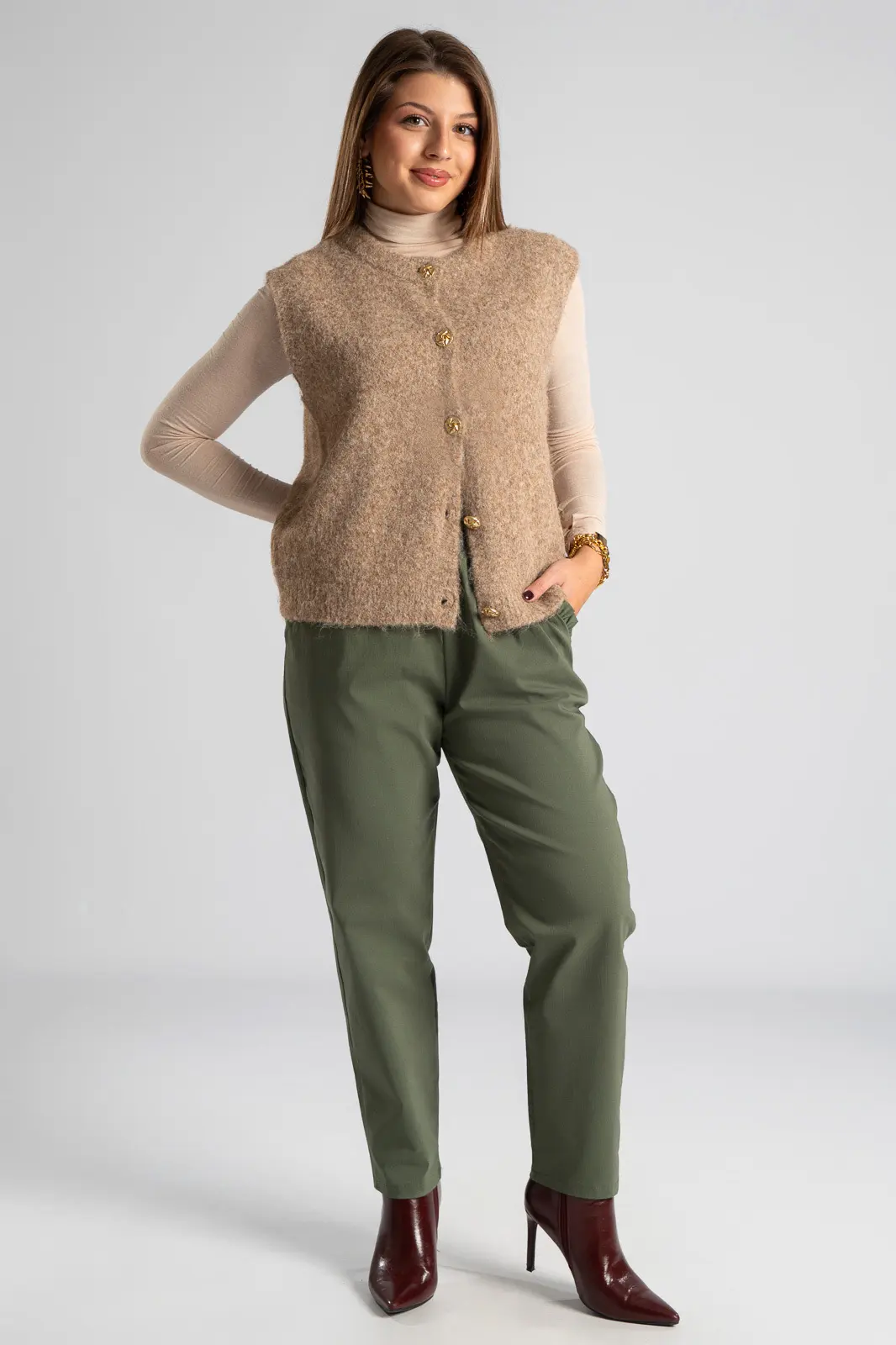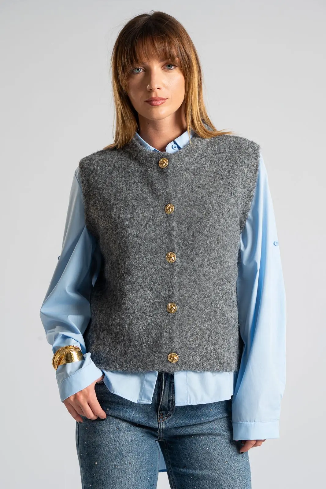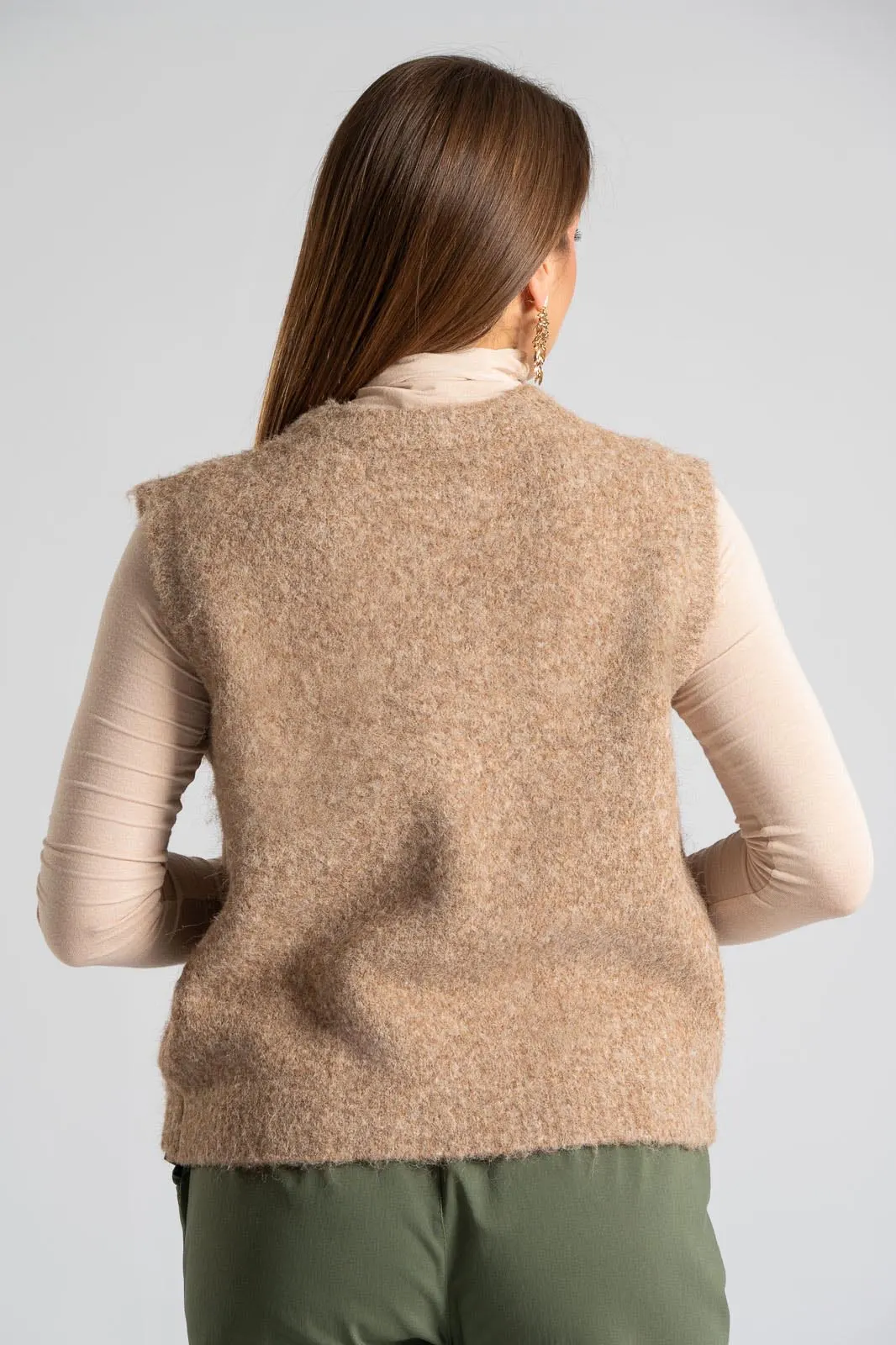 Vest with round neckline. It has a furry texture and fastens with buttons. It has a comfortable fit. Measurements are taken with the buttons closed. The measurements in the table are representative of each code. 65% viscose, 33% polyester, 2% elastane.
