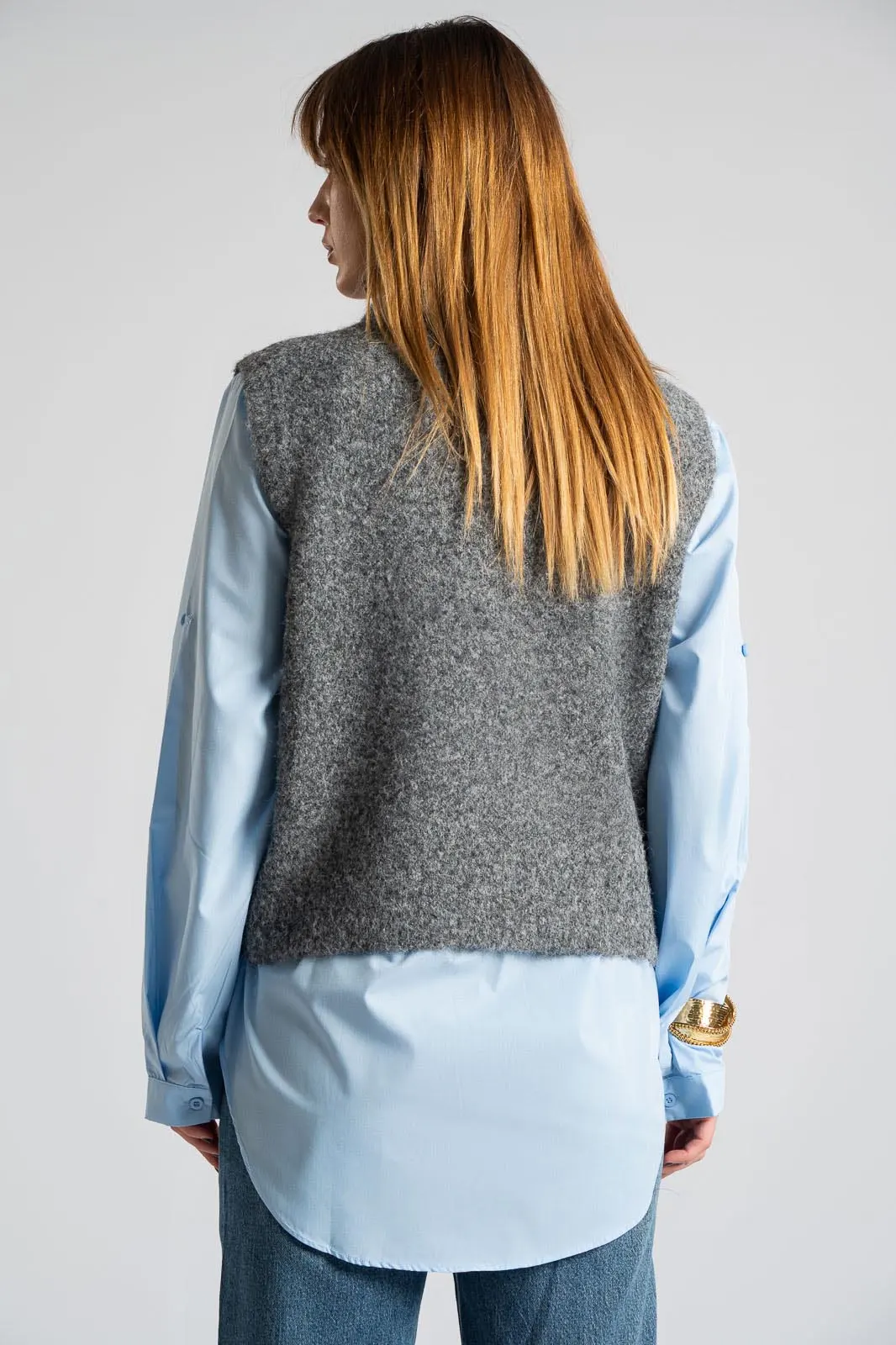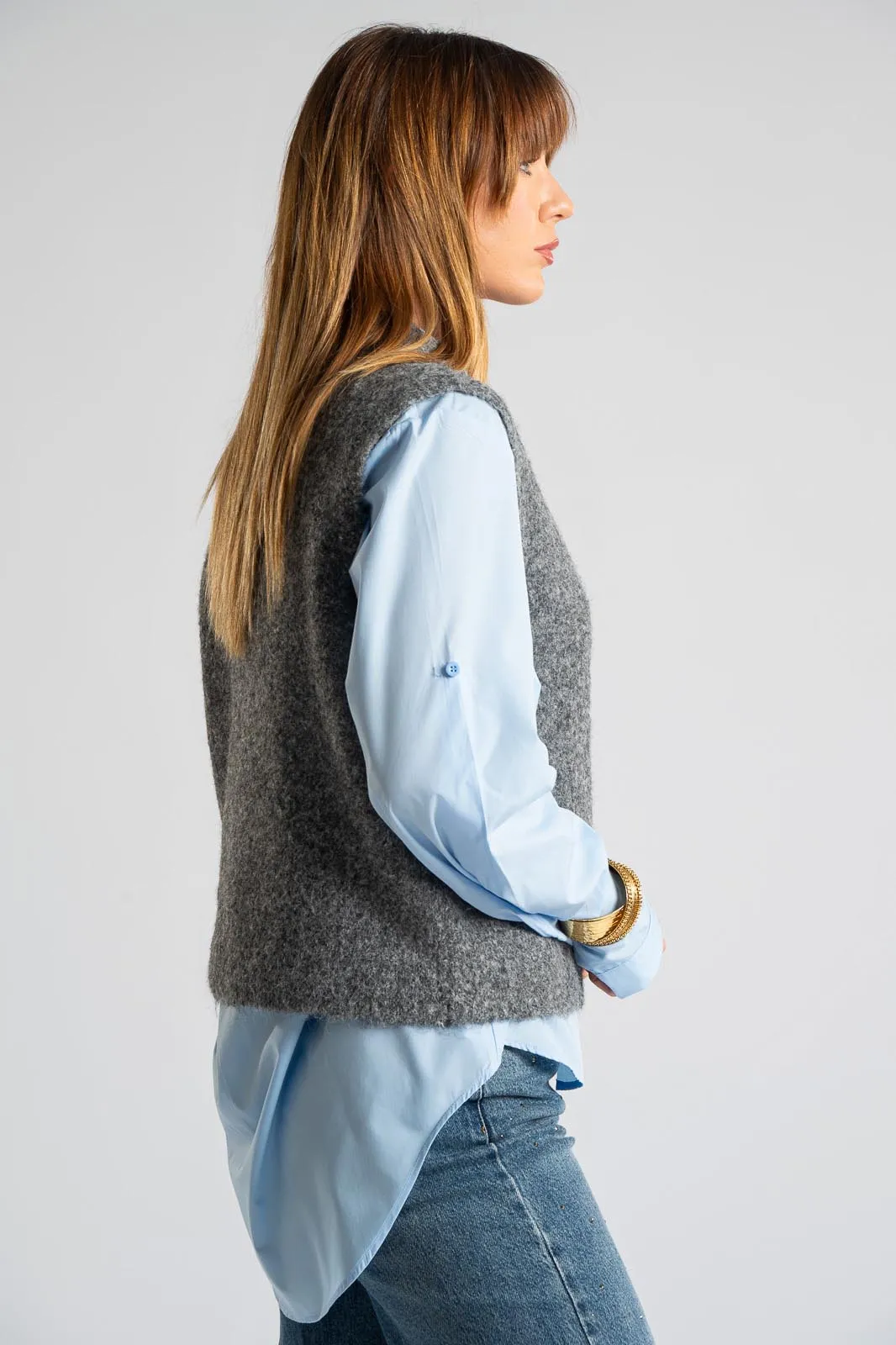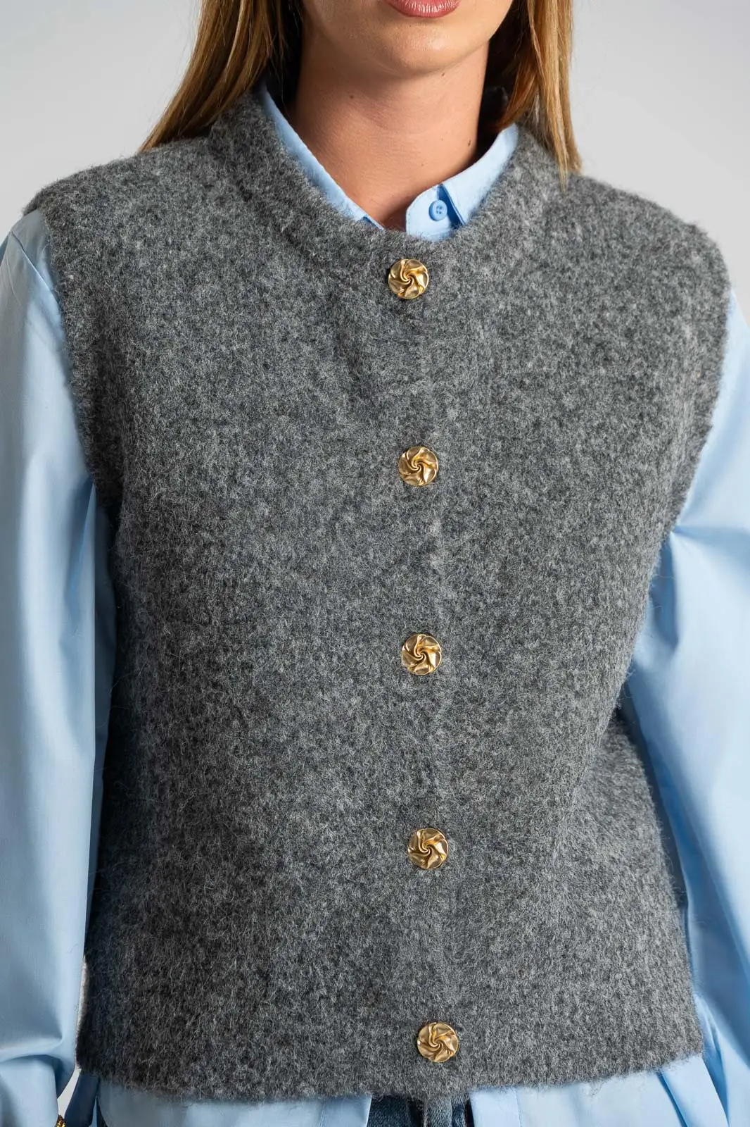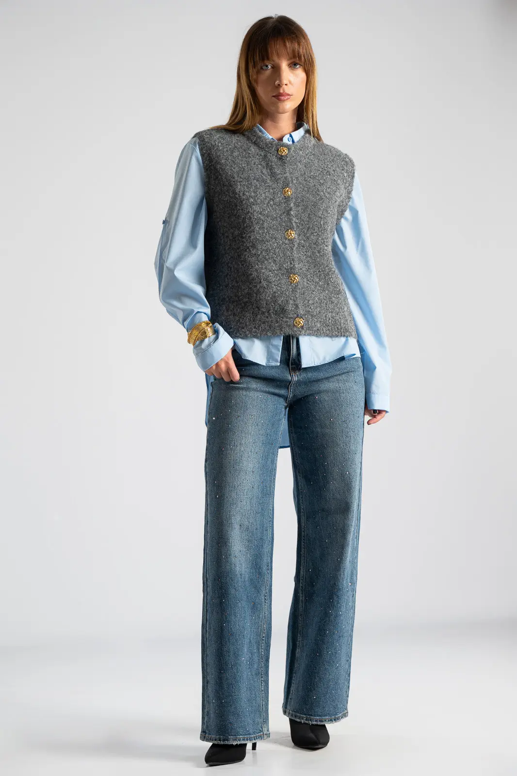 Vest with round neckline. It has a furry texture and fastens with buttons. It has a comfortable fit. Measurements are taken with the buttons closed. The measurements in the table are representative of each code. 65% viscose, 33% polyester, 2% elastane.