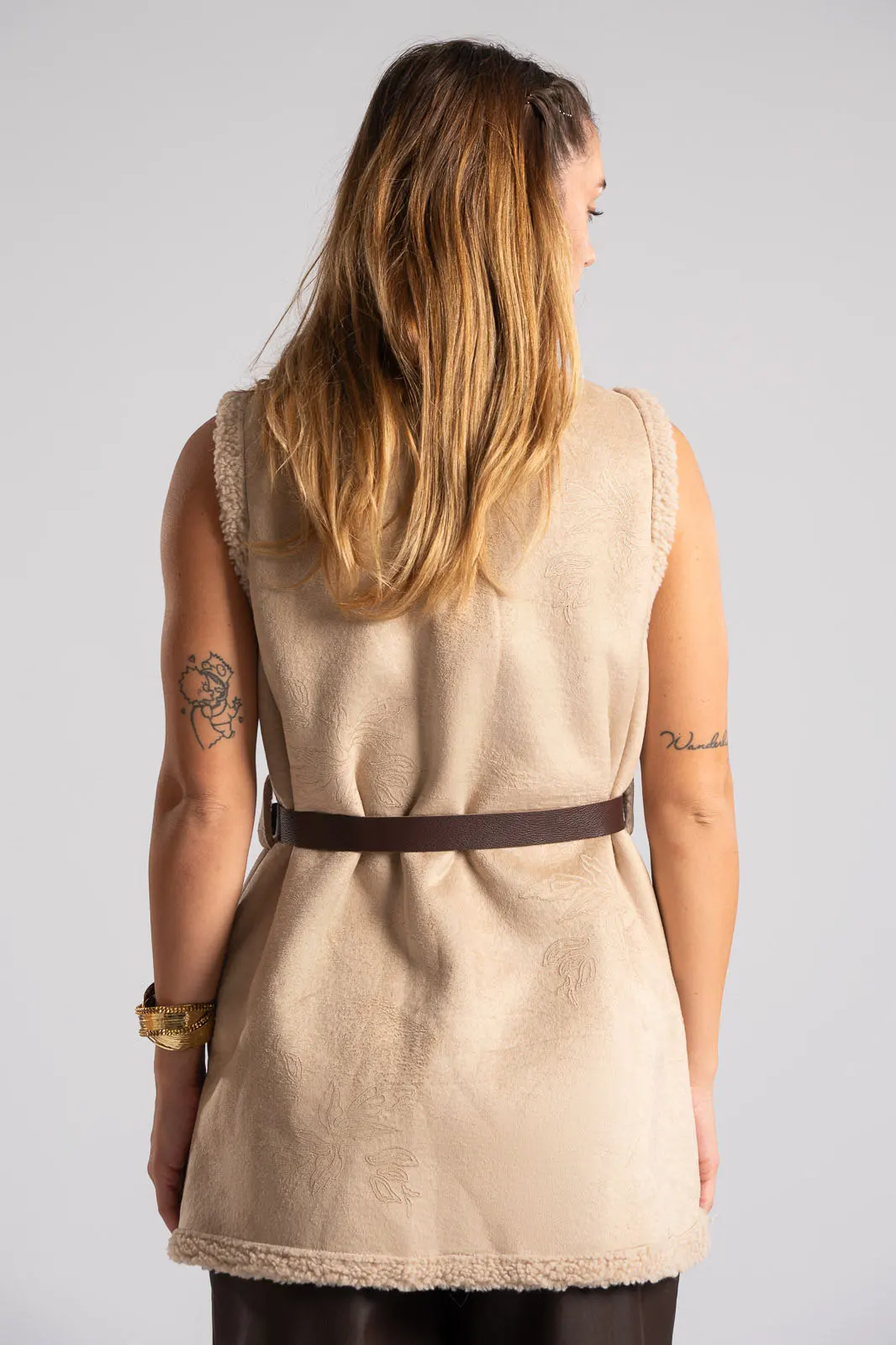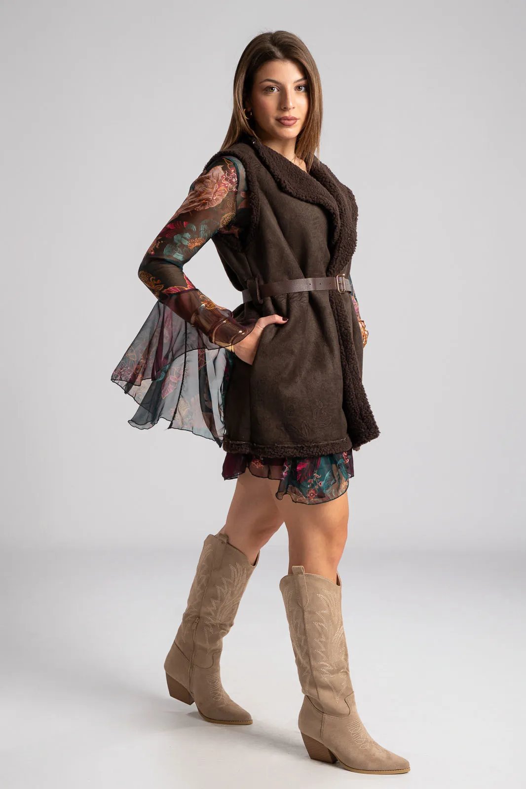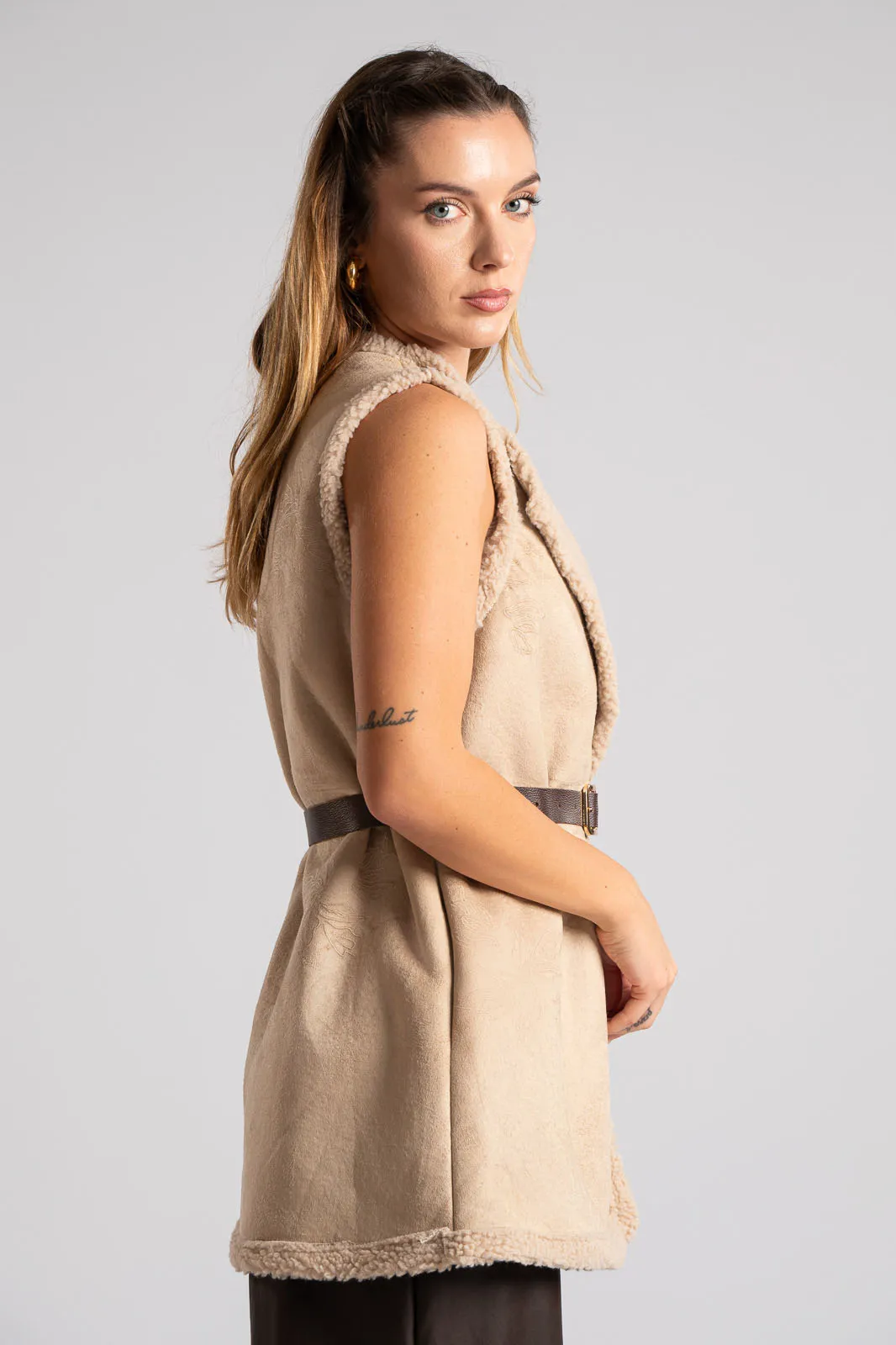 Γιλέκο με σουέτ υφή σε όλη την επιφάνεια. Διαθέτει σε όλη την επιφάνεια ανάγλυφες λεπτομέρειες. Εσωτερικά και περιμετρικά του γιλέκου έχει teddy λεπτομέρεια. Έχει δική του ζώνη για καλύτερη εφαρμογή. Έχει πλαινές τσέπες. Οι μετρήσεις του πίνακα είναι αντιπροσωπευτικές για κάθε κωδικό. 100% polyester.