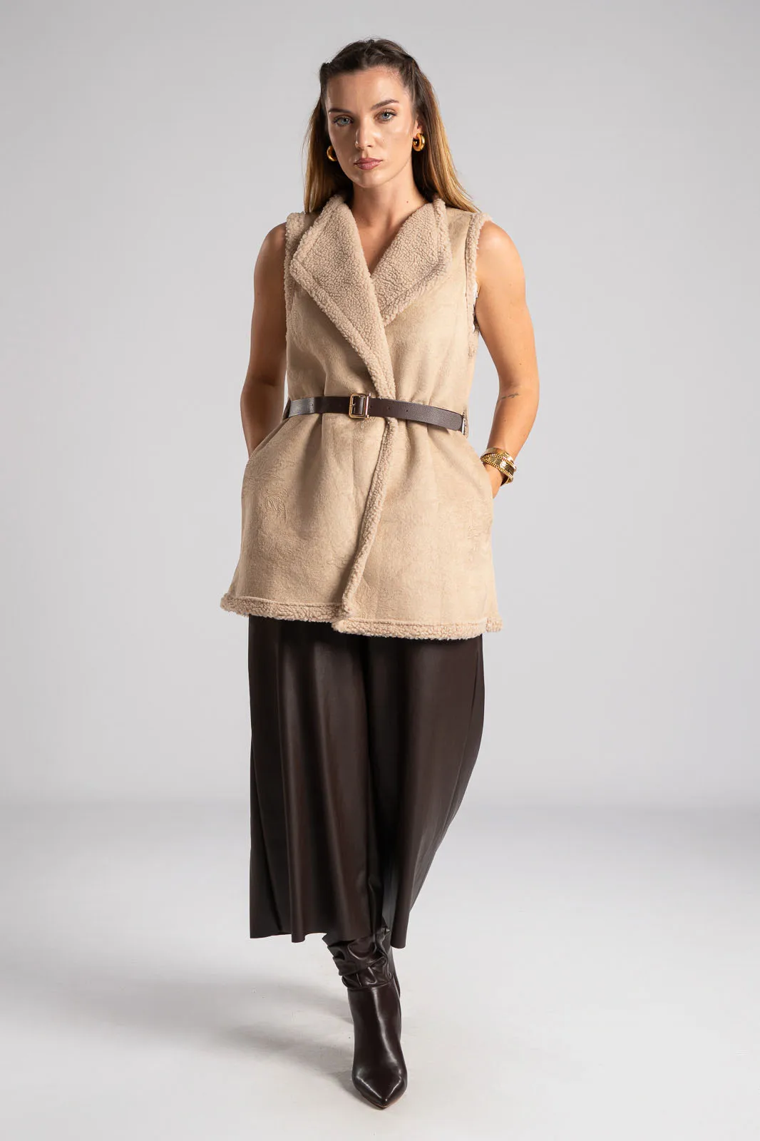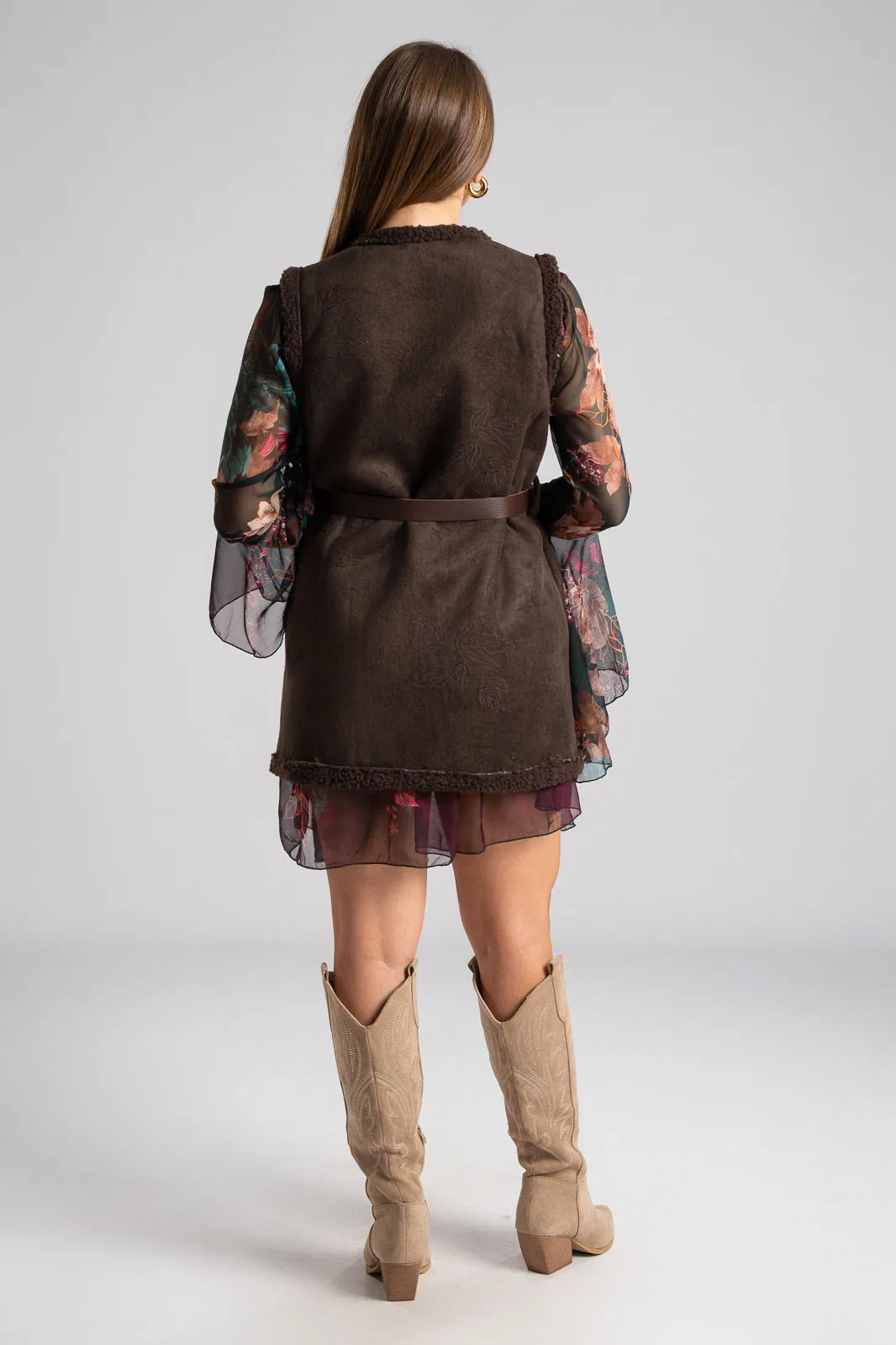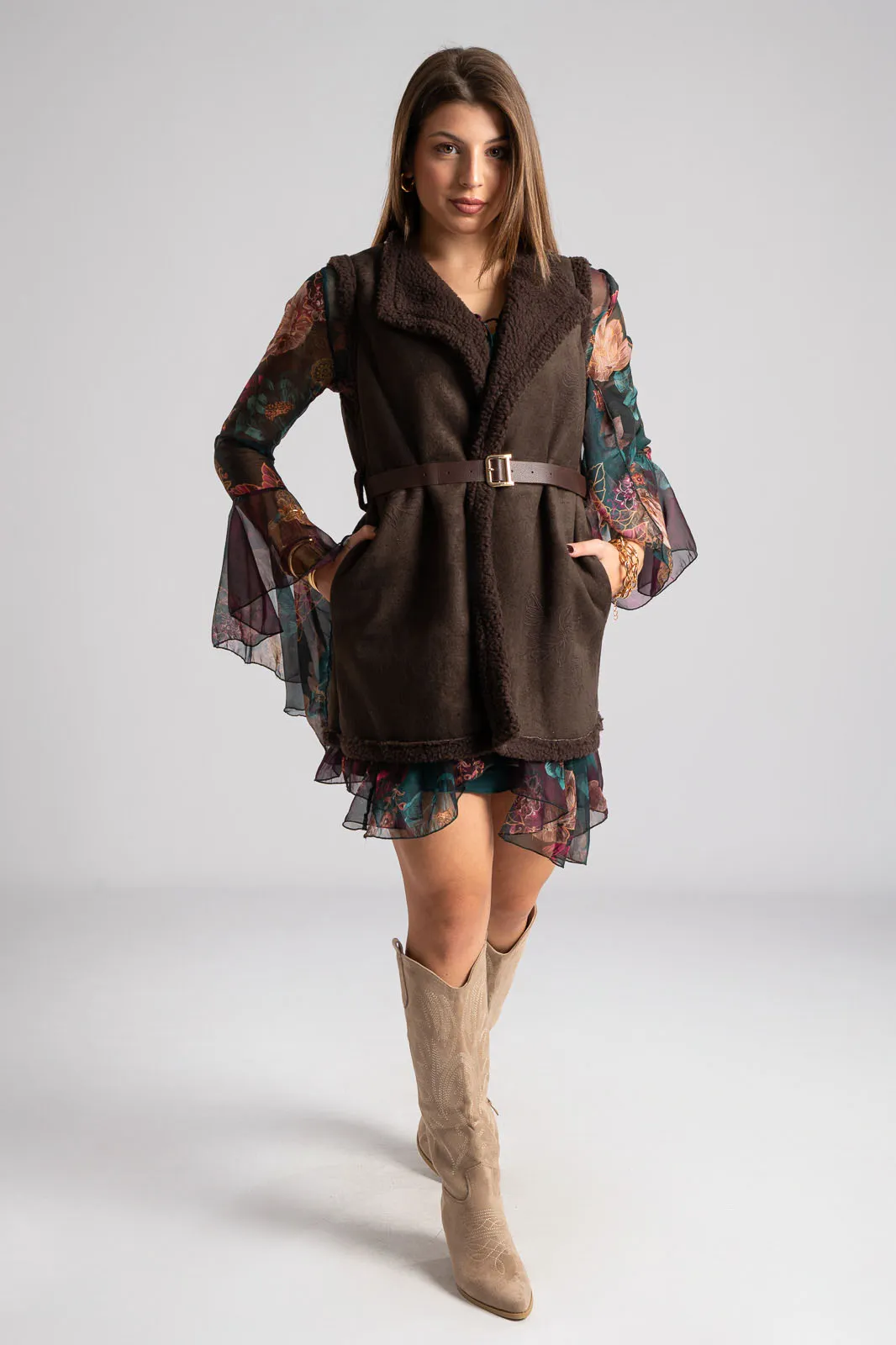 Γιλέκο με σουέτ υφή σε όλη την επιφάνεια. Διαθέτει σε όλη την επιφάνεια ανάγλυφες λεπτομέρειες. Εσωτερικά και περιμετρικά του γιλέκου έχει teddy λεπτομέρεια. Έχει δική του ζώνη για καλύτερη εφαρμογή. Έχει πλαινές τσέπες. Οι μετρήσεις του πίνακα είναι αντιπροσωπευτικές για κάθε κωδικό. 100% polyester.