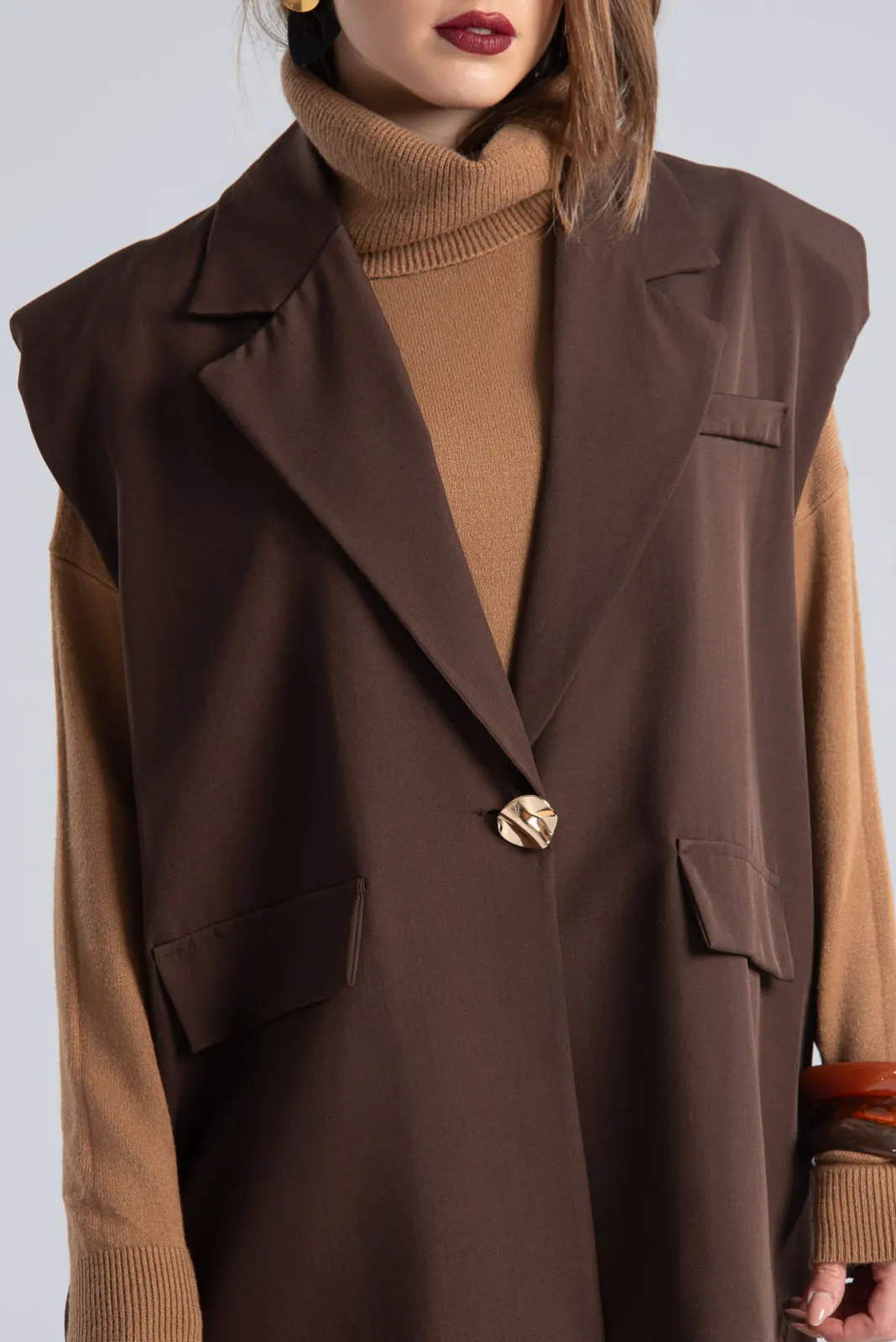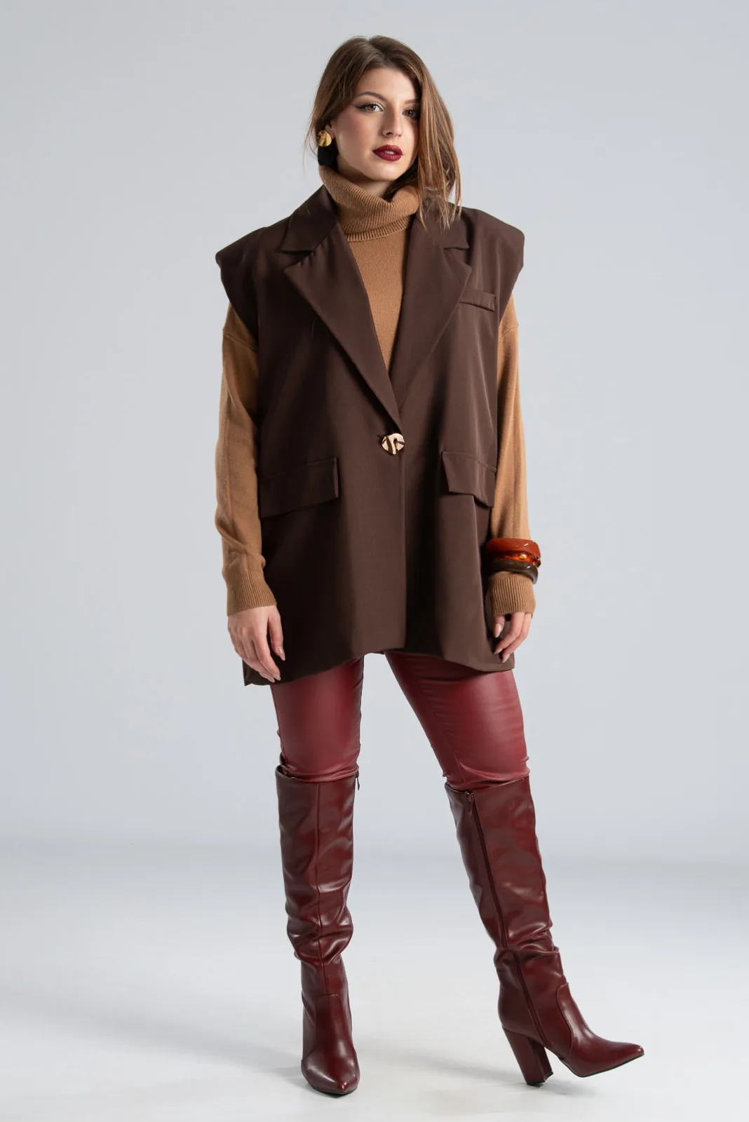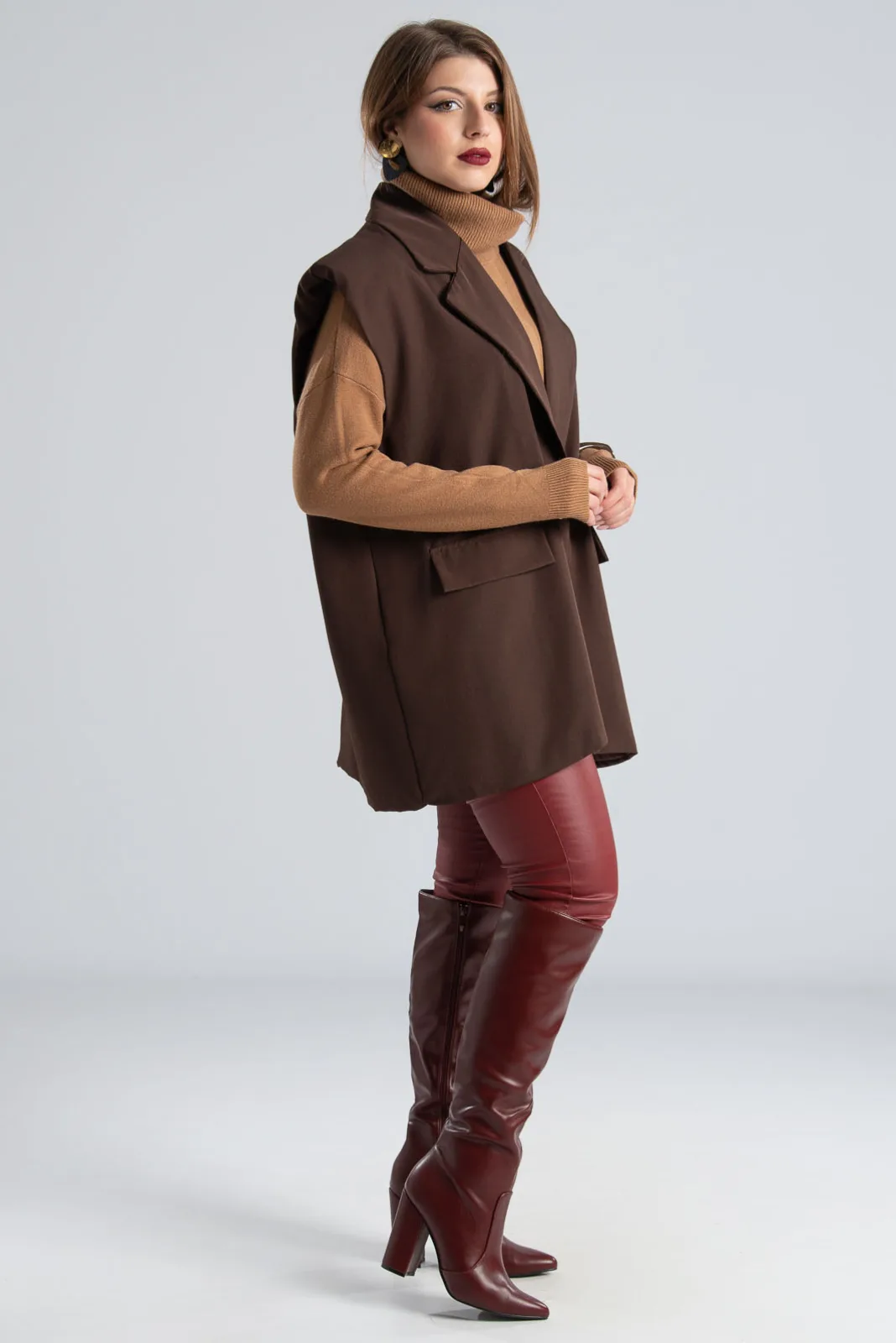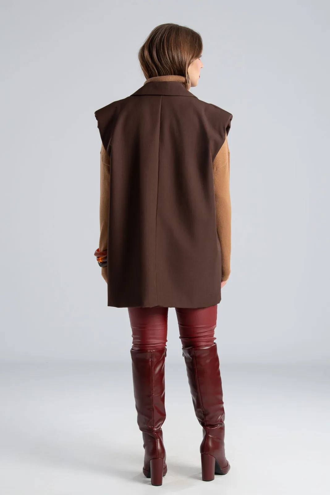 Vest with shoulder pads. It has a collar and lapels. It has two front pockets with flaps and one top pocket with a flap. It closes with a button. The measurements were taken with the button closed. It has a comfortable fit. It is lined on the inside. The measurements in the table are representative for each code. 100% polyester.