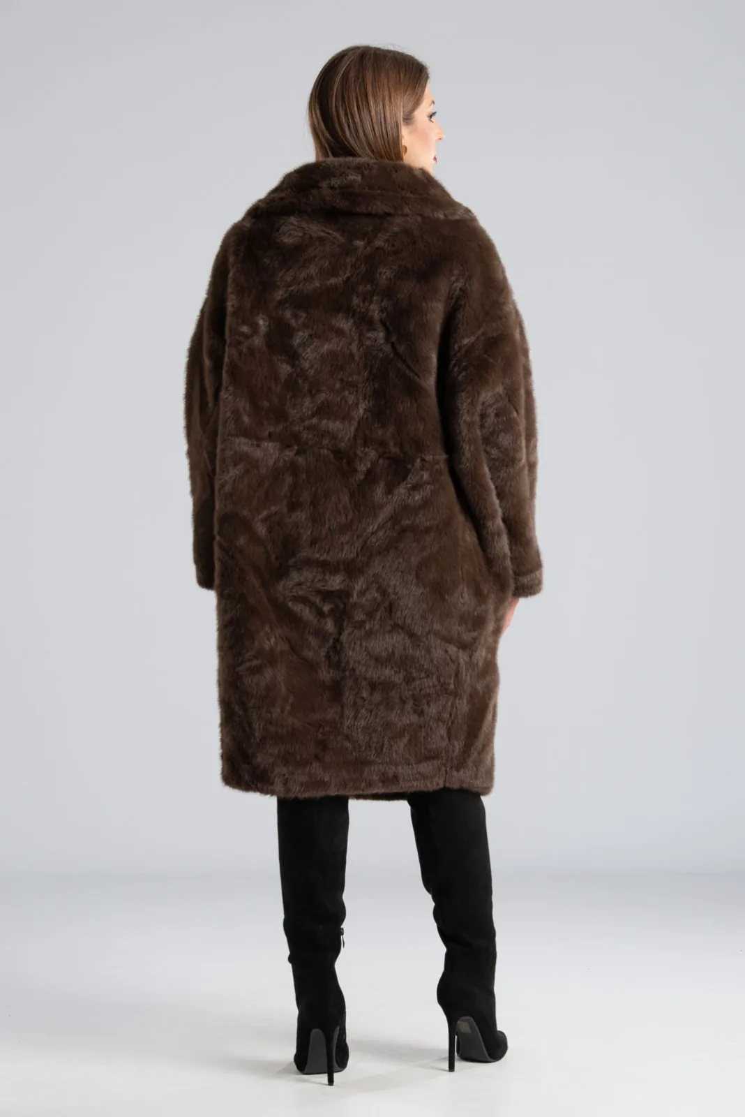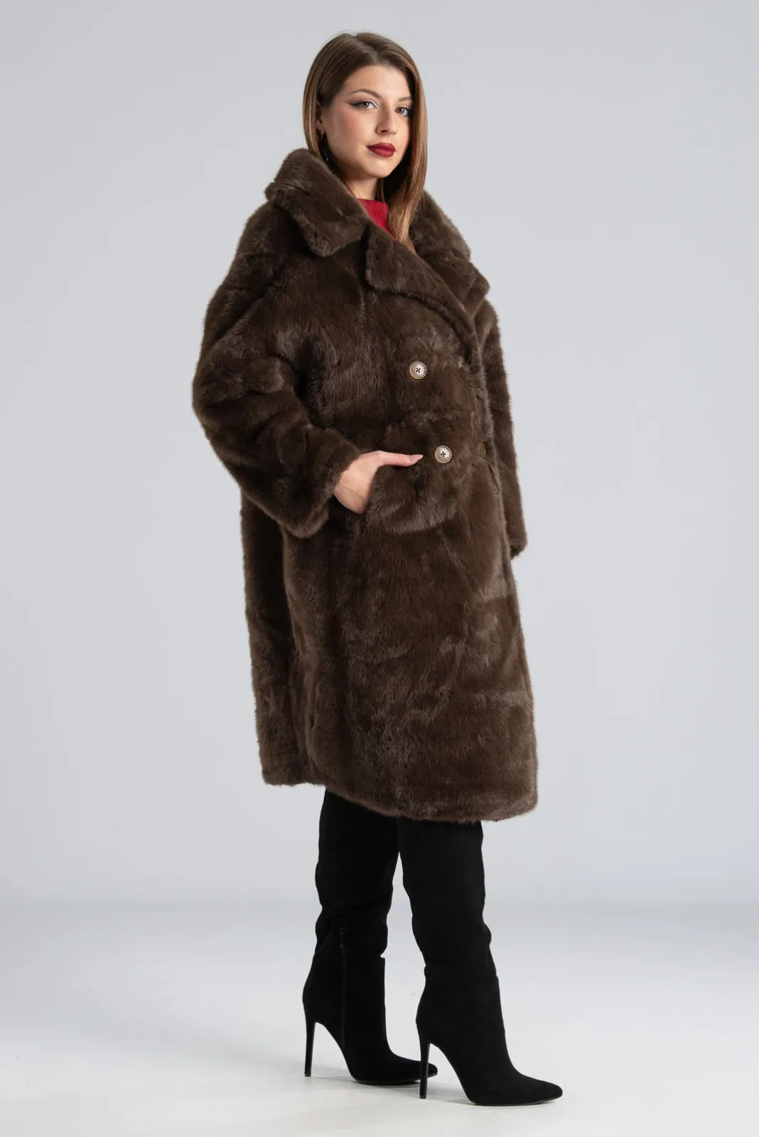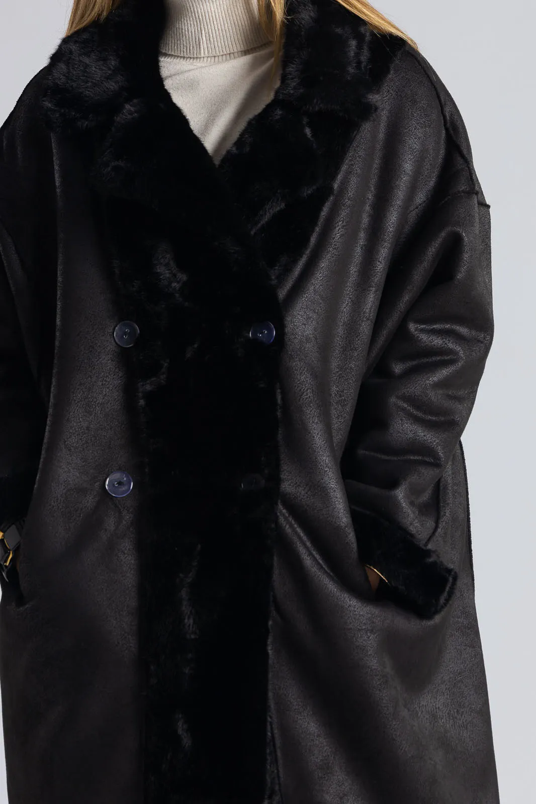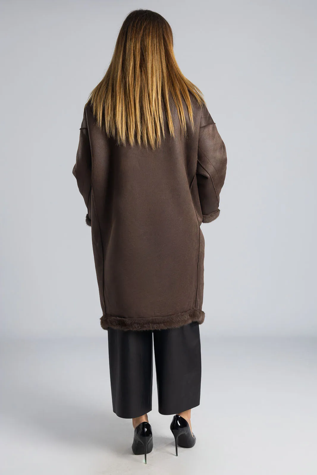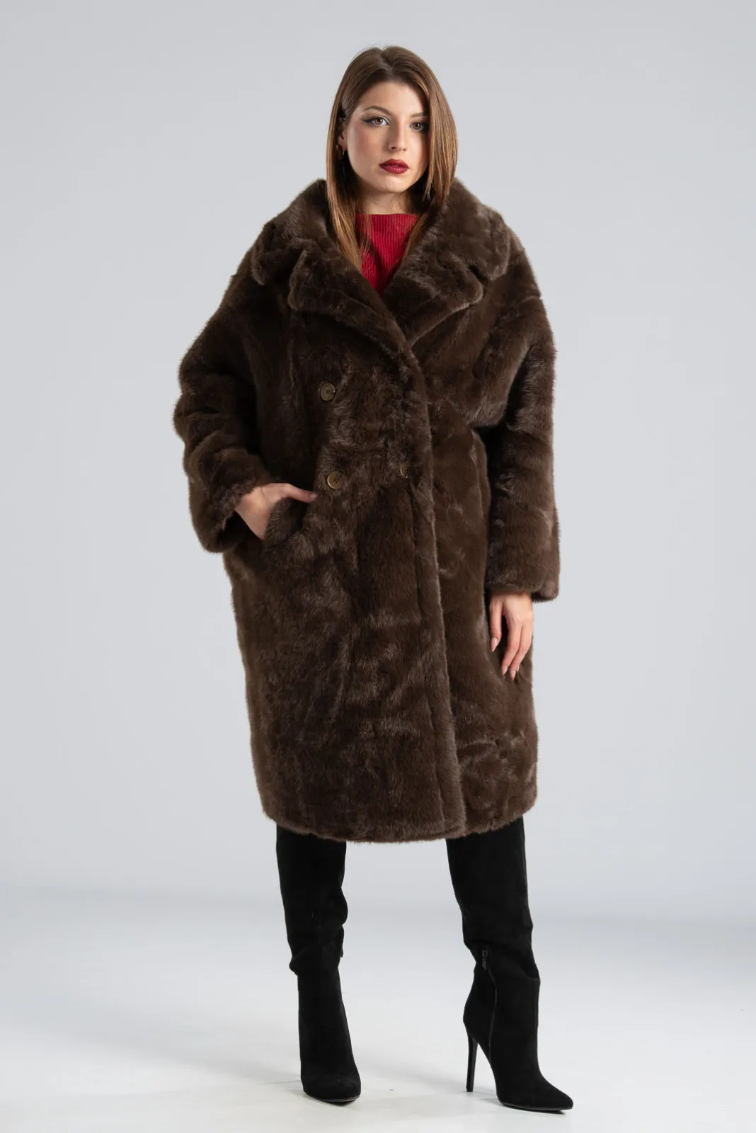 Πανωφόρι με συνθετική γούνα. Έχει γιακά, πέτο και πλαινές τσέπες. Είναι διπλής όψης. Εξωτερικά είναι γούνινο και εσωτερικά είναι suede.  Έχει μακριά μανίκια και κλείνει με 2 κουμπιά και έχει και 2 διακοσμητικά. Η μέτρηση έχει γίνει με κλειστά κουμπιά. Οι μετρήσεις του πίνακα είναι αντιπροσωπευτικές για κάθε προϊόν. 100% polyester.