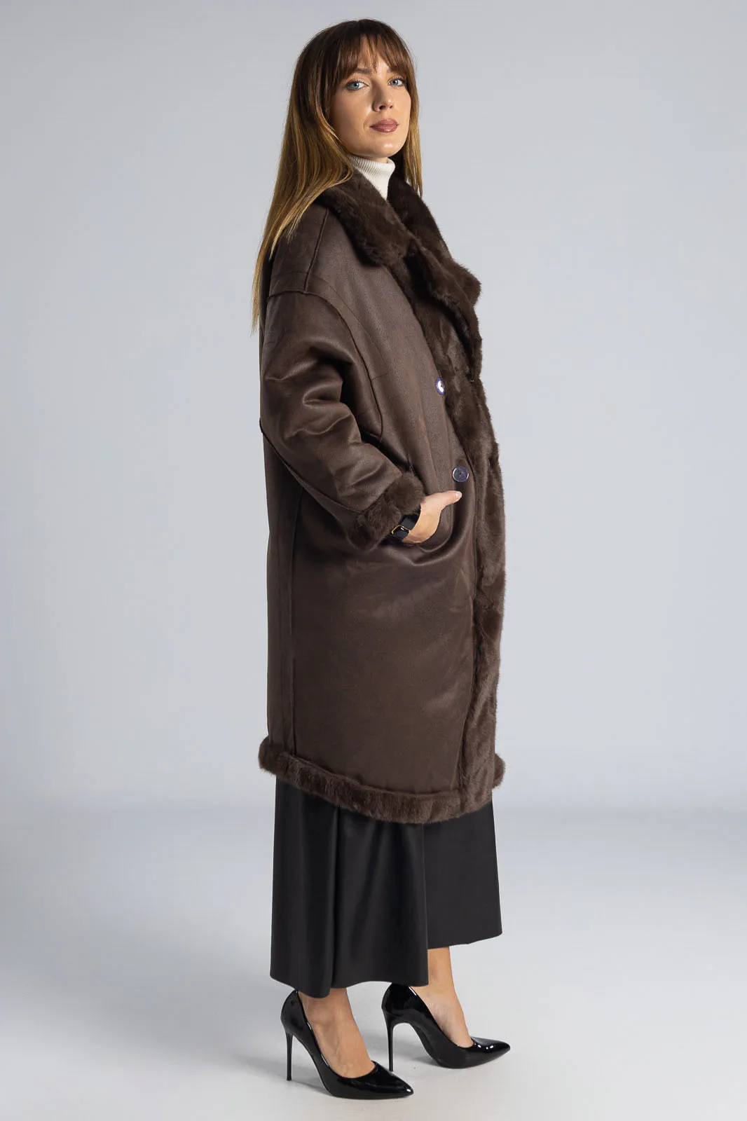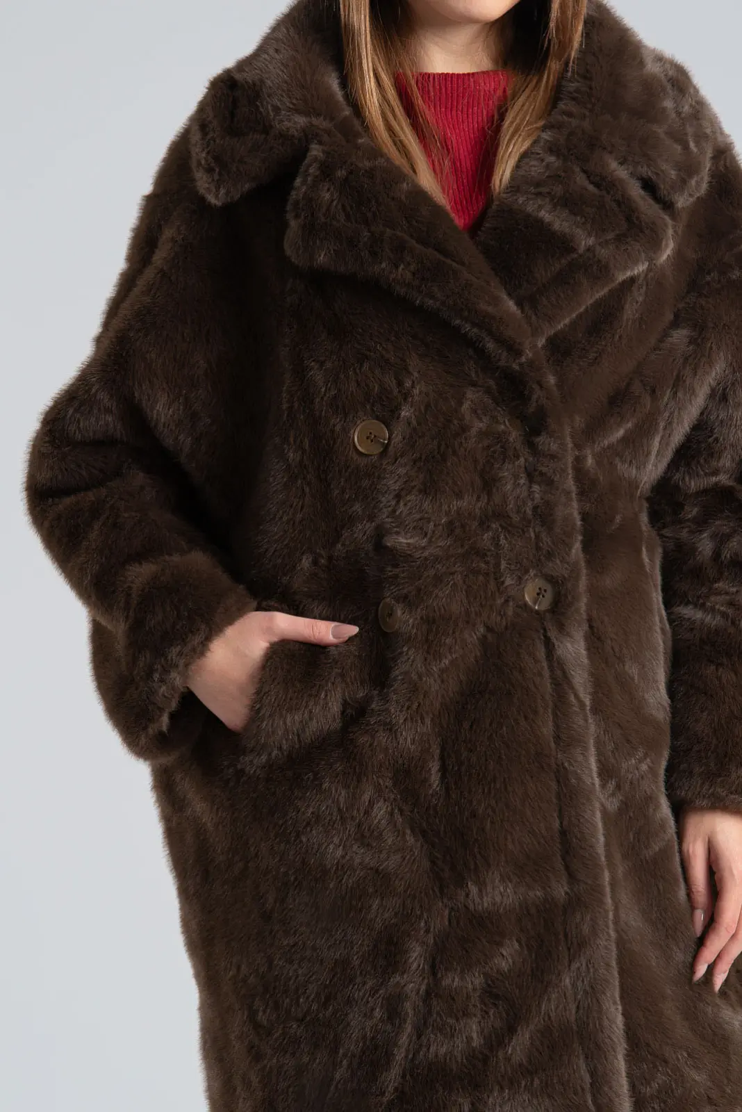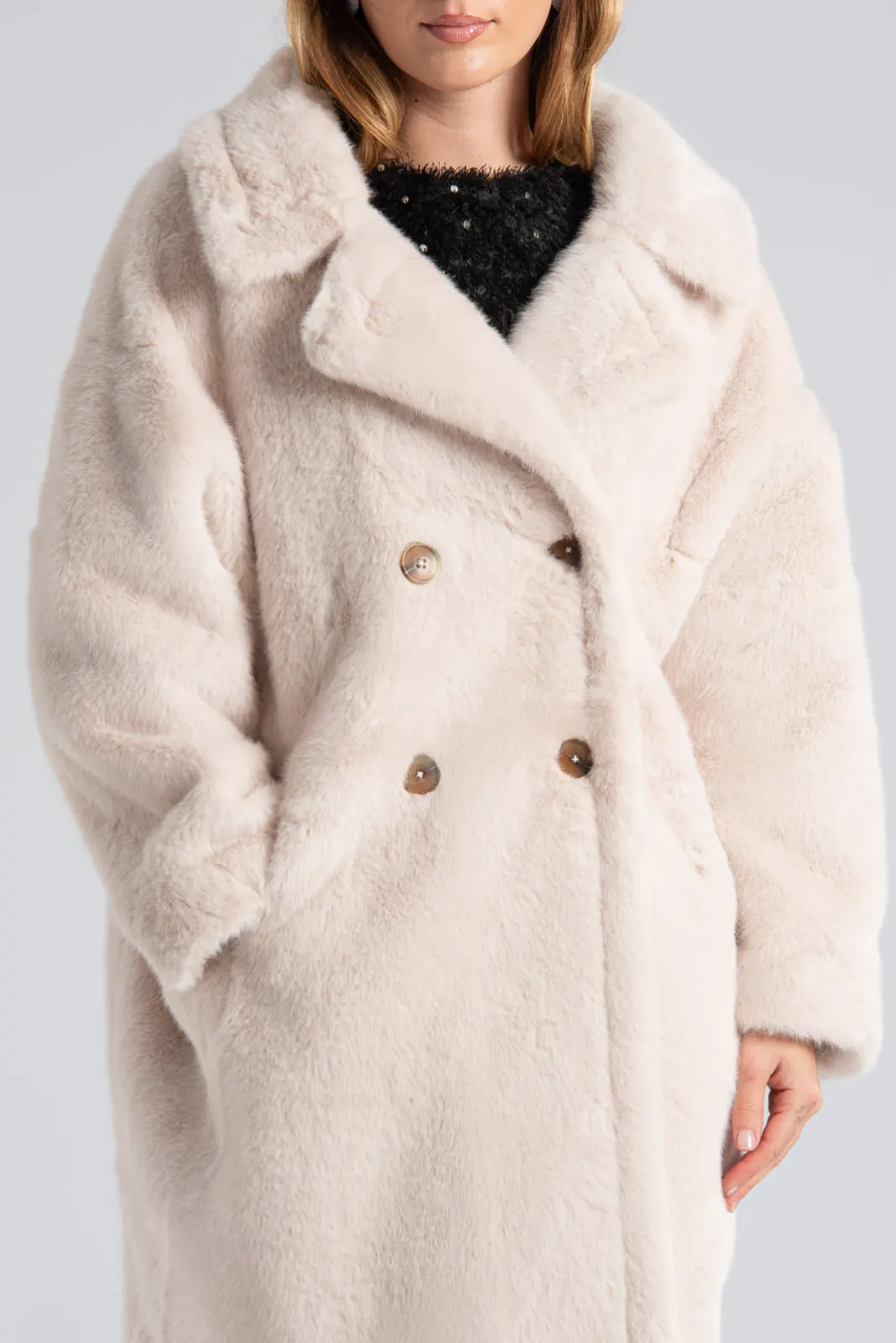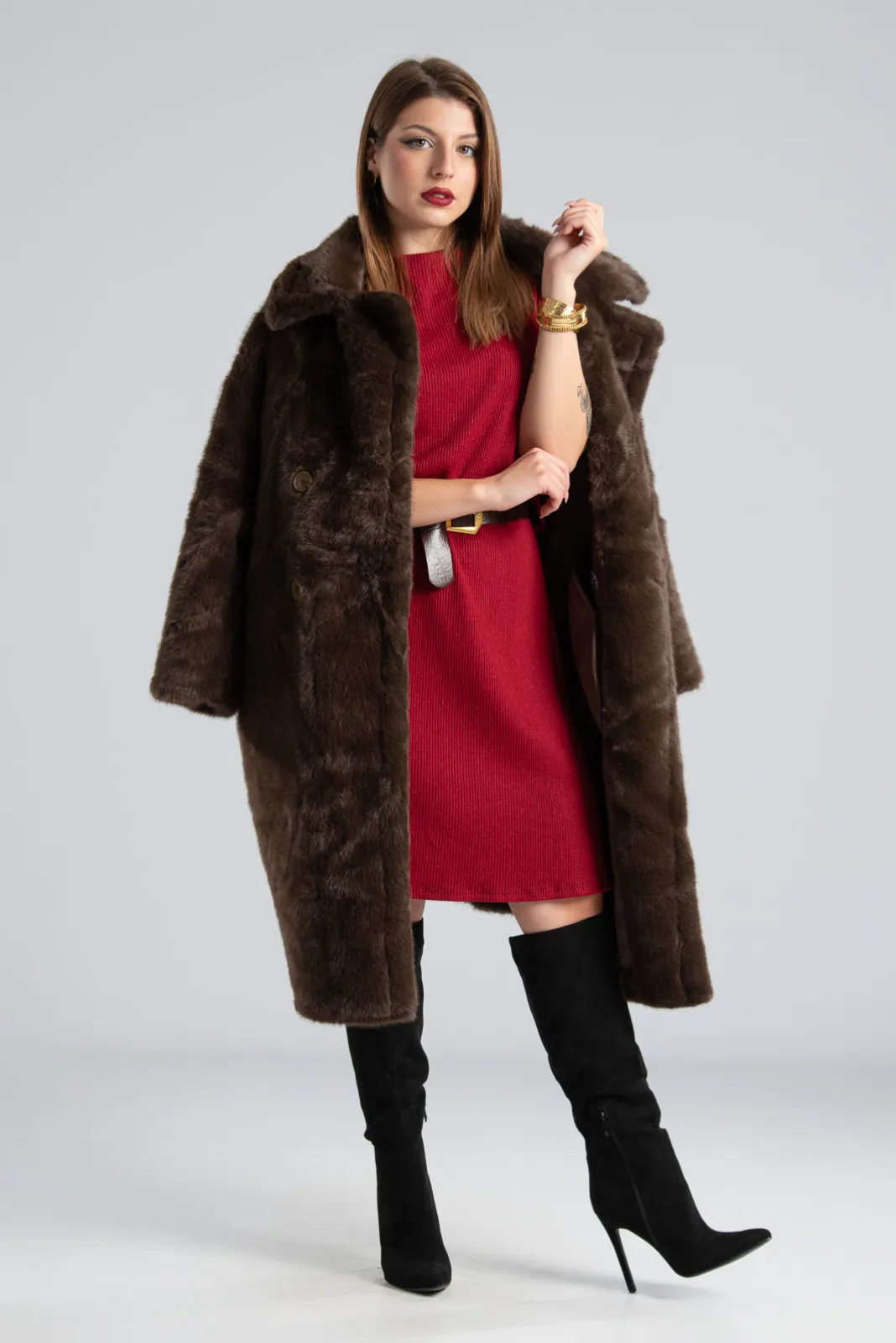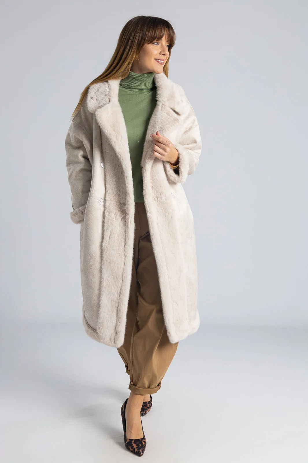 Πανωφόρι με συνθετική γούνα. Έχει γιακά, πέτο και πλαινές τσέπες. Είναι διπλής όψης. Εξωτερικά είναι γούνινο και εσωτερικά είναι suede.  Έχει μακριά μανίκια και κλείνει με 2 κουμπιά και έχει και 2 διακοσμητικά. Η μέτρηση έχει γίνει με κλειστά κουμπιά. Οι μετρήσεις του πίνακα είναι αντιπροσωπευτικές για κάθε προϊόν. 100% polyester.