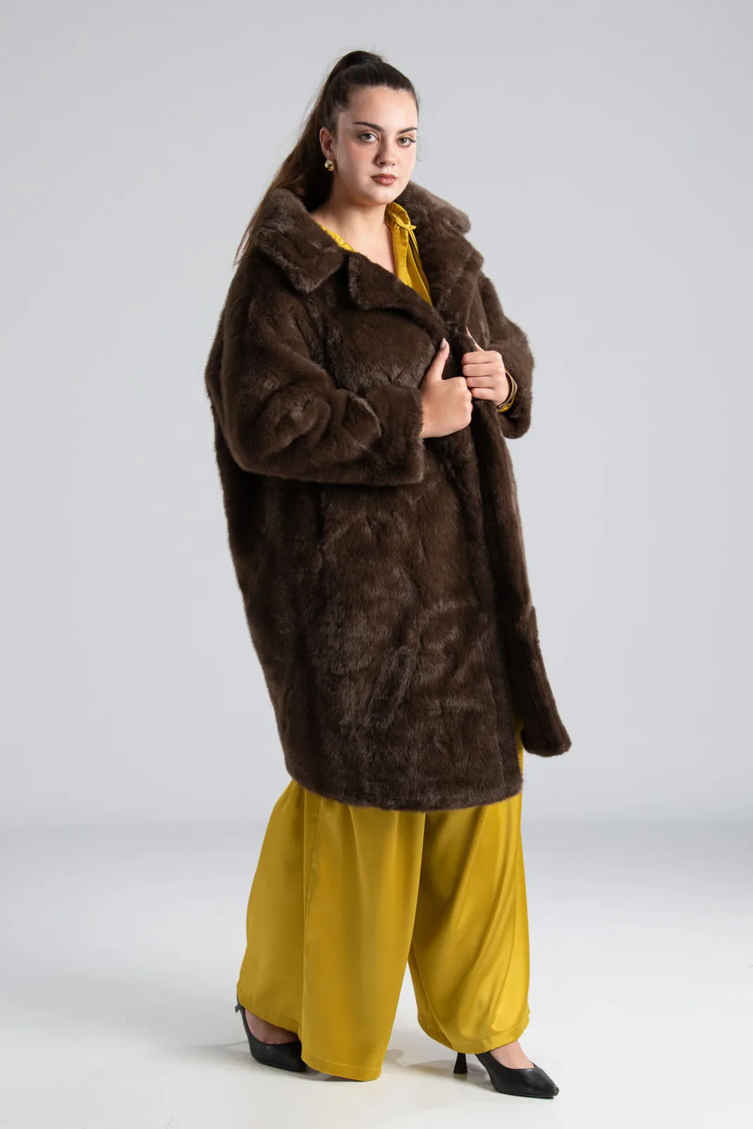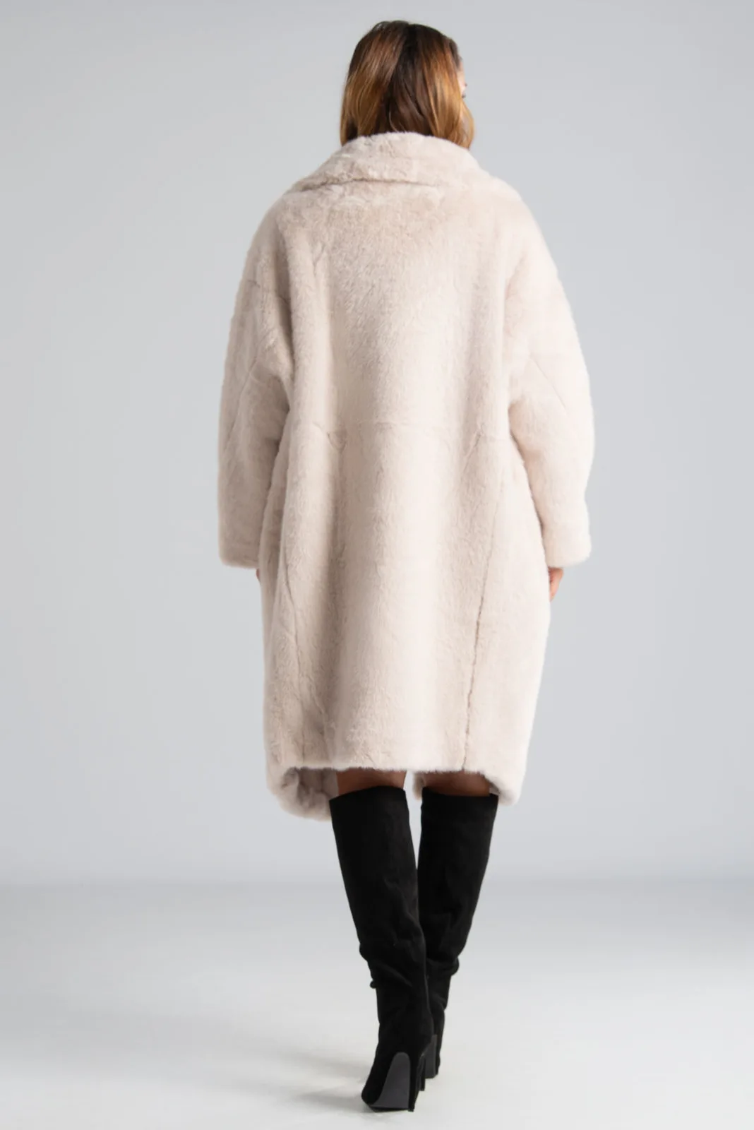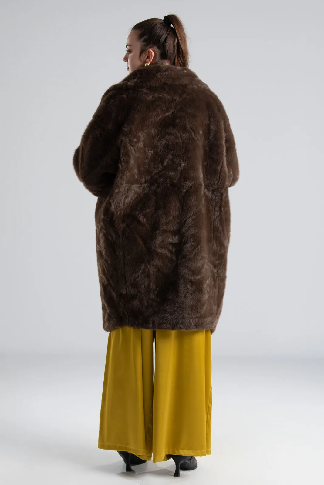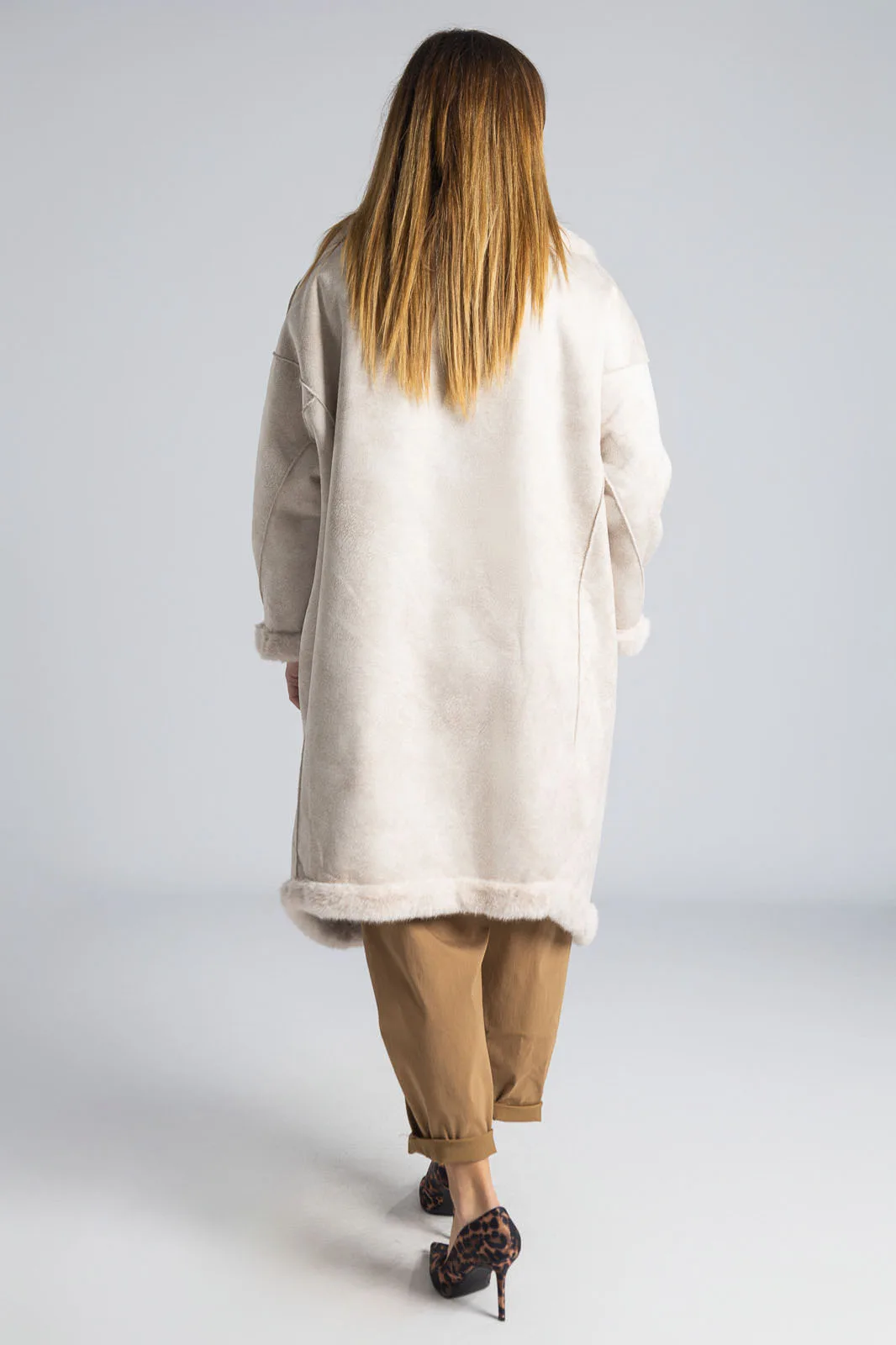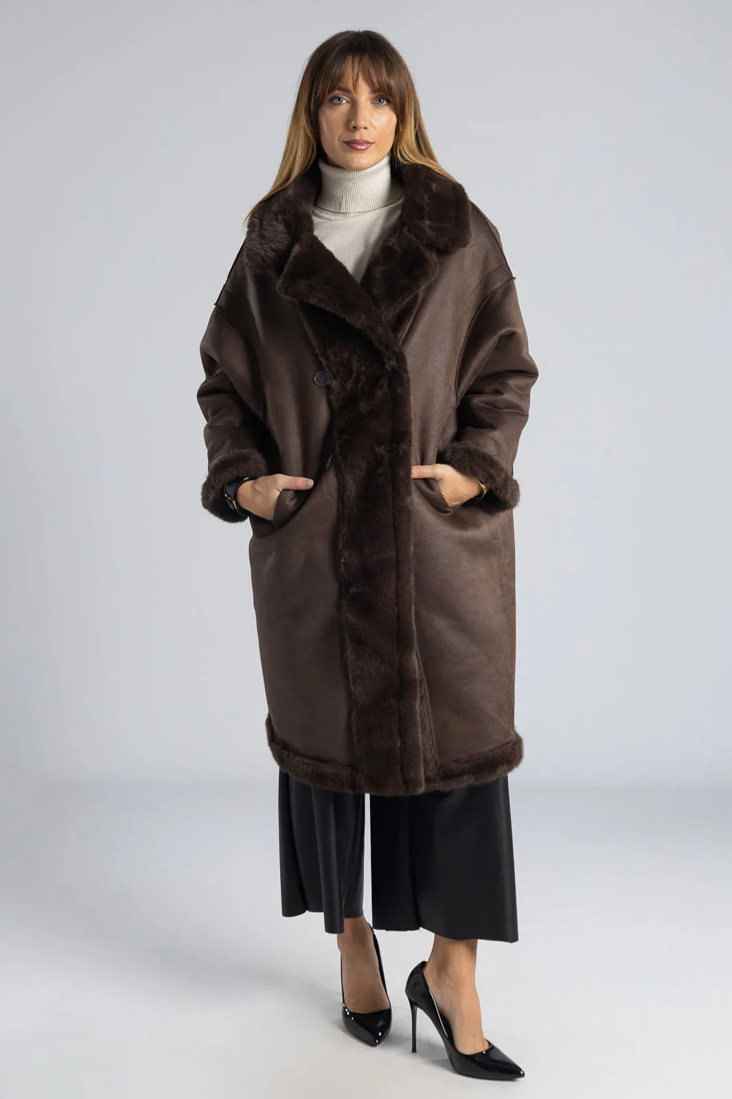 Πανωφόρι με συνθετική γούνα. Έχει γιακά, πέτο και πλαινές τσέπες. Είναι διπλής όψης. Εξωτερικά είναι γούνινο και εσωτερικά είναι suede.  Έχει μακριά μανίκια και κλείνει με 2 κουμπιά και έχει και 2 διακοσμητικά. Η μέτρηση έχει γίνει με κλειστά κουμπιά. Οι μετρήσεις του πίνακα είναι αντιπροσωπευτικές για κάθε προϊόν. 100% polyester.