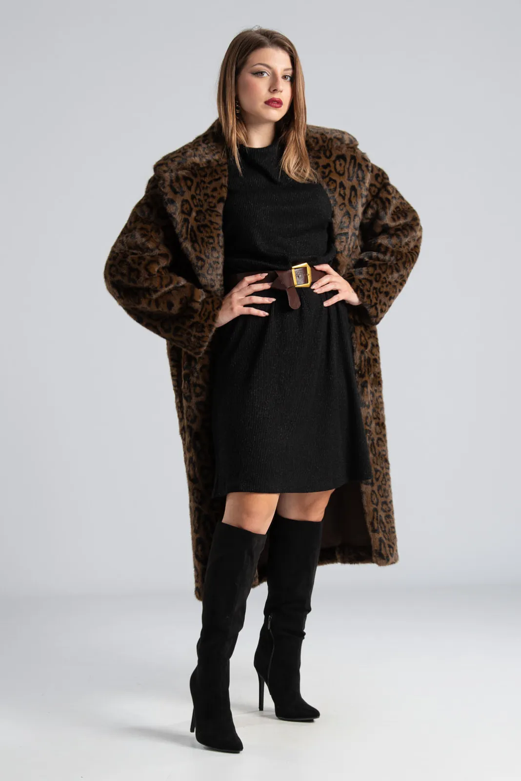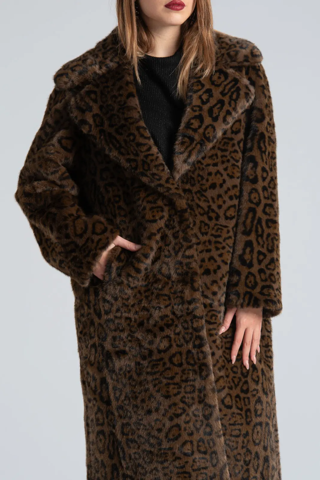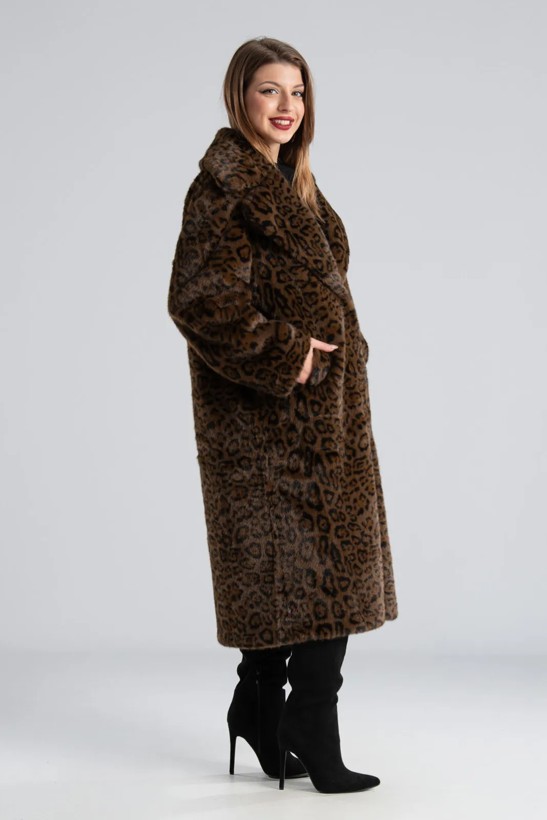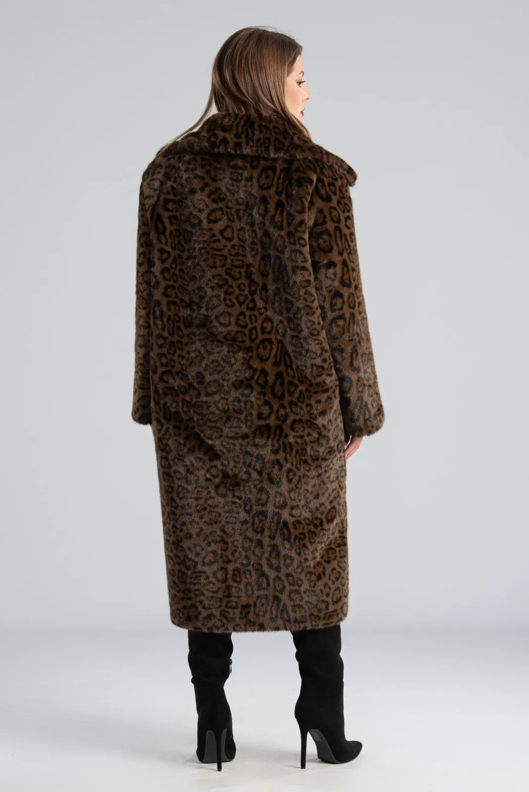 Πανωφόρι από εξαιρετικής ποιότητας συνθετική γούνα. Έχει γιακά και πέτο. Σε όλη την επιφάνεια του διαθέτει jaguar print. Εσωτερικά είναι suede. Έχει πλαϊνές τσέπες. Κλείνει με ιδιαίτερα κουμπιά σαν γάντζους διακοσμημένα με στρας. Η μέτρηση έχει γίνει με κλειστά κουμπιά. Οι μετρήσεις του πίνακα είναι αντιπροσωπευτικές για κάθε κωδικό. 65% viscose, 33% polyester, 2% elastan.