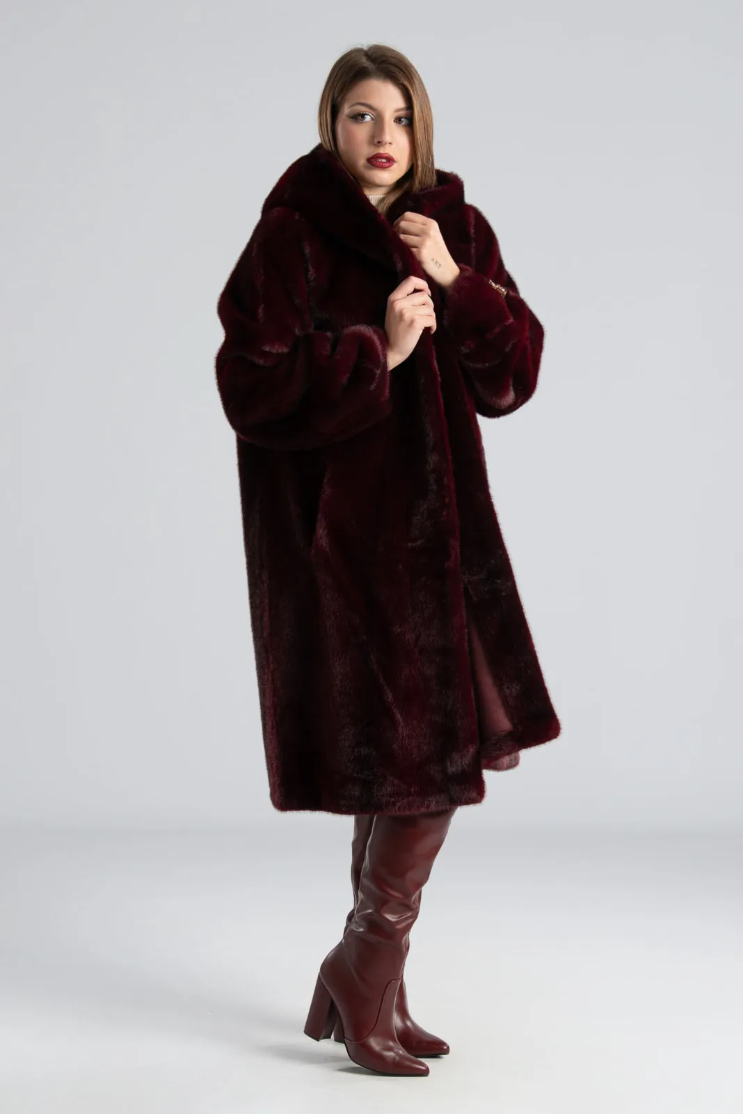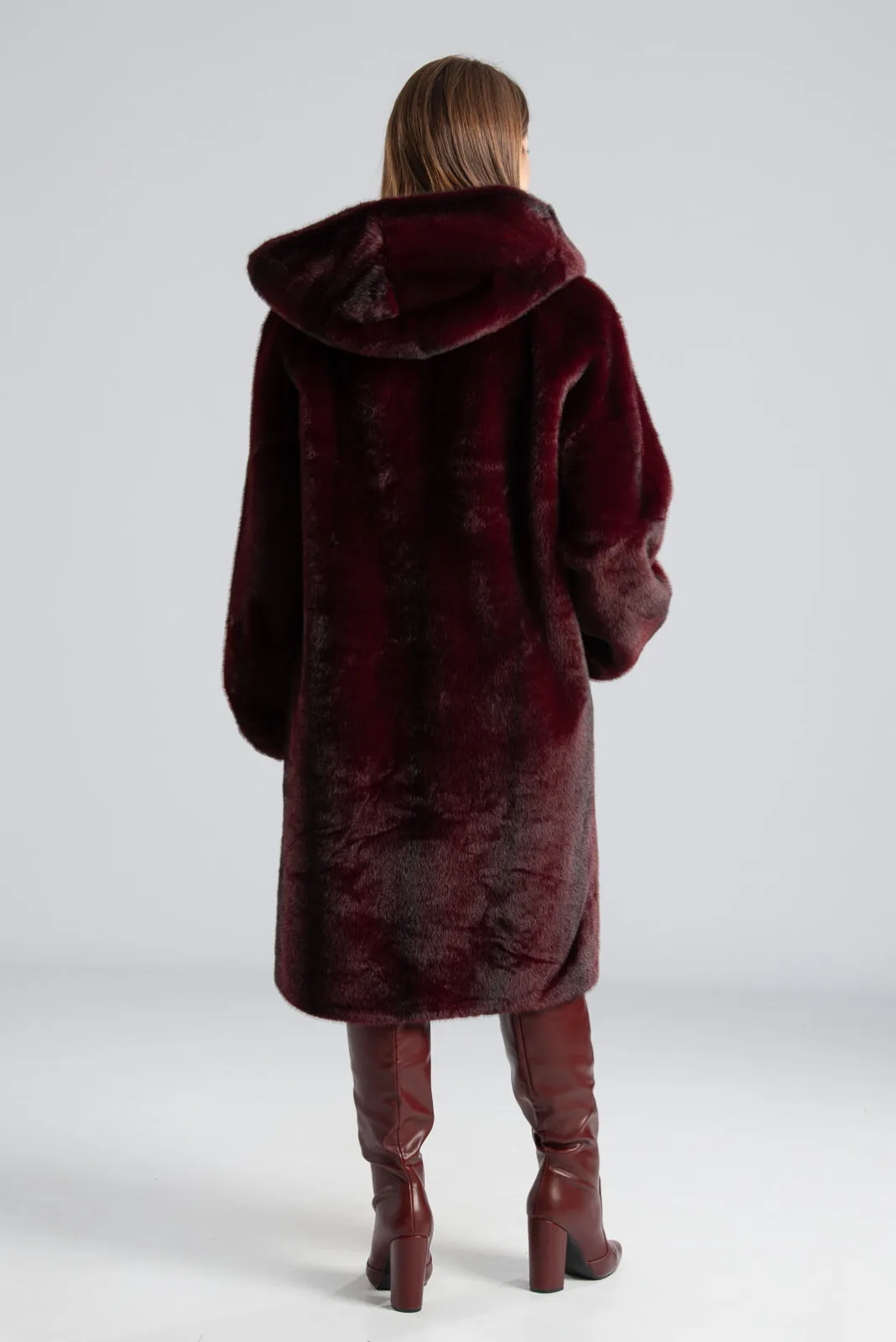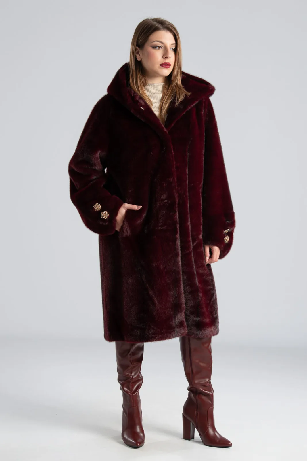 Synthetic fur coat. It has a hood and side pockets. It has long sleeves and decorative buttons with rhinestones. Vertical stripes run across the entire surface. It fastens with hook-and-eye buttons and has a suede lining. Measurements were taken with the buttons fastened. The measurements in the table are representative of each product. 100% polyester.