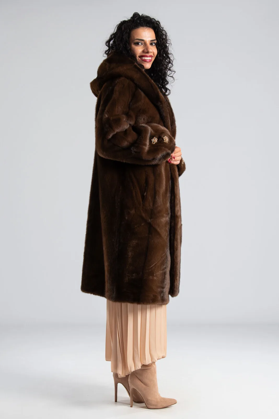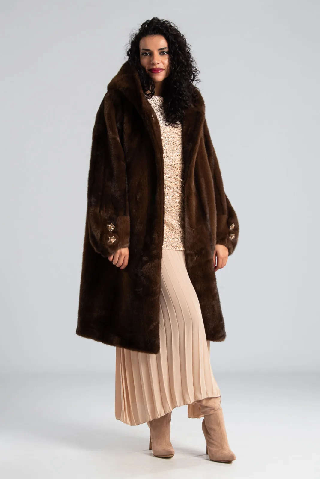 Synthetic fur coat. It has a hood and side pockets. It has long sleeves and decorative buttons with rhinestones. Vertical stripes run across the entire surface. It fastens with hook-and-eye buttons and has a suede lining. Measurements were taken with the buttons fastened. The measurements in the table are representative of each product. 100% polyester.