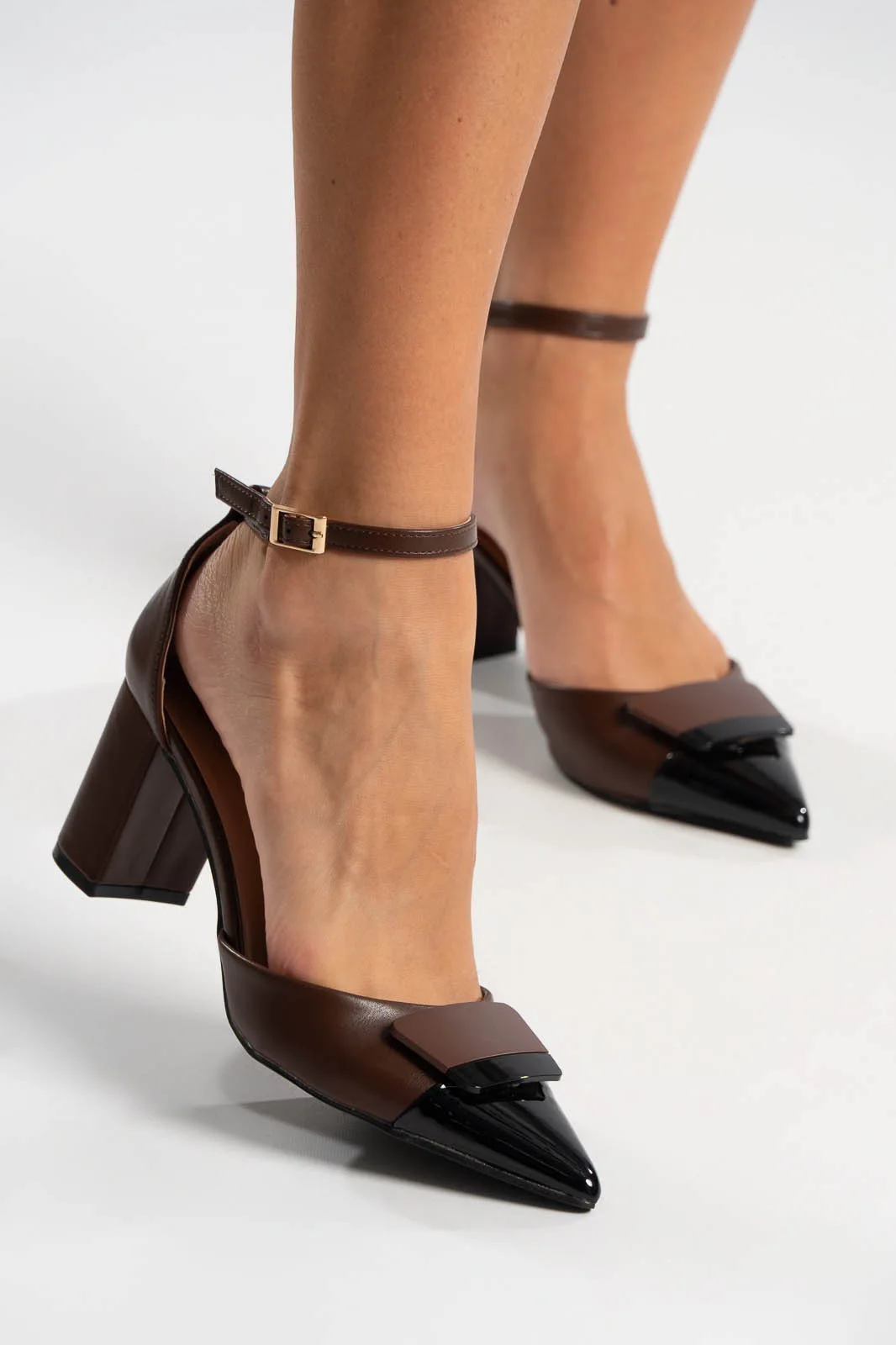 Γόβες από εξαιρετικής ποιότητας δερματίνη. Είναι μυτερή και έχει λουρί στον αστράγαλο με μέγιστο μήκος 24cm για να κρατά σταθερό το πόδι στο βάδισμα. Στο μπροστινό μέρος είναι λουστρίνι και έχει διακοσμητικό στοιχείο. Το τακούνι του είναι χοντρό με ύψος 7cm. Είναι μια εξαιρετικά σικ επιλογή.