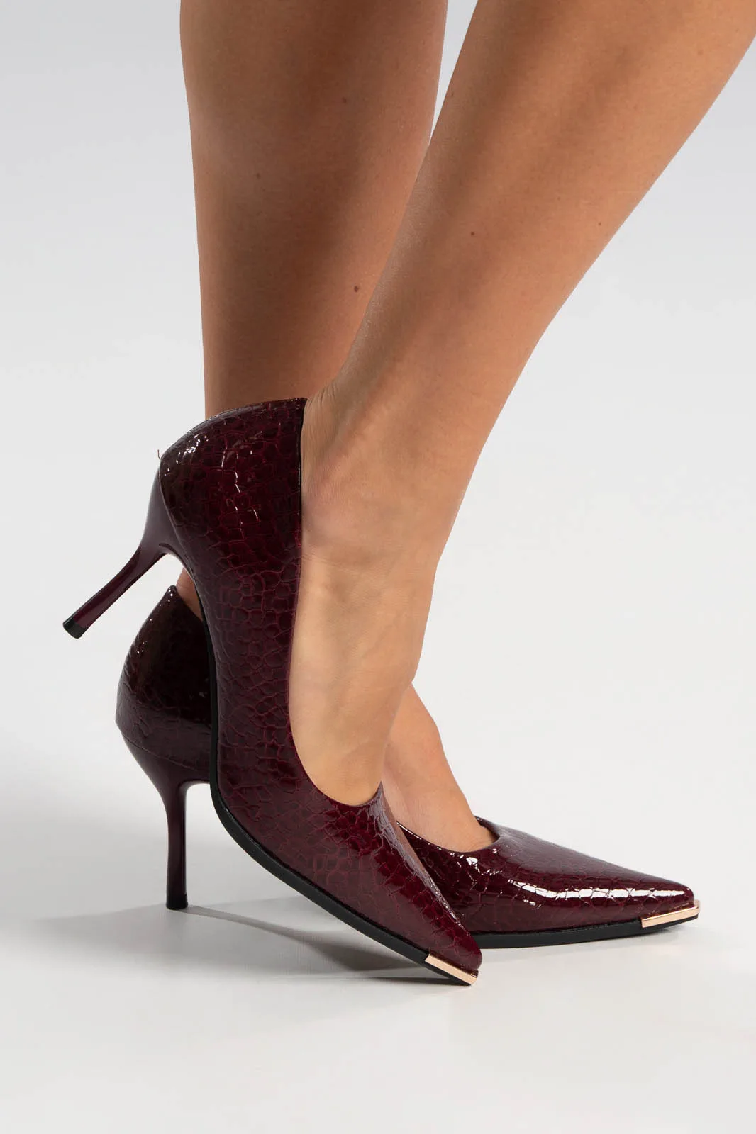 Striking pumps with a patent leather look and embossed texture. They are pointed and feature a metal decorative element on the front. The heel is 9 cm high.