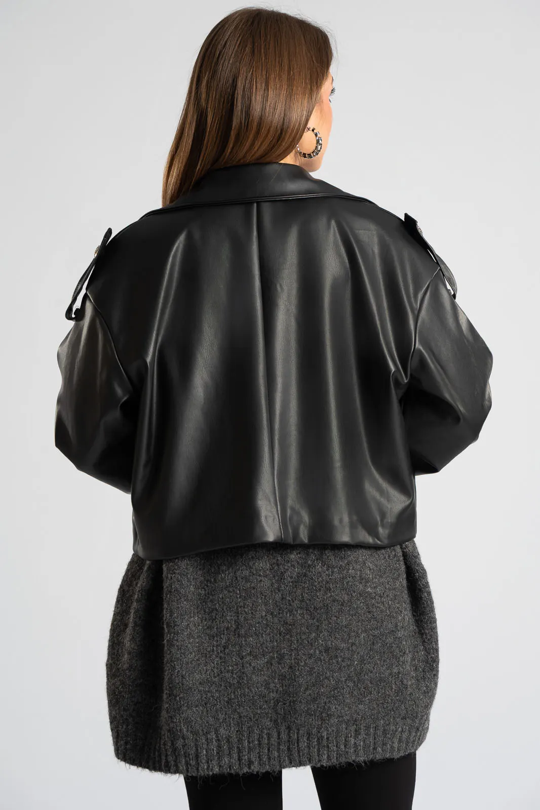 Jacket made of high-quality leatherette. Fastens with two buttons. Has a collar. Has long sleeves that end with an extra strap and decorative button. Measurements taken with buttons fastened. Lined interior. The measurements in the table are representative of each code. 40% polyester, 60% polyurethane.