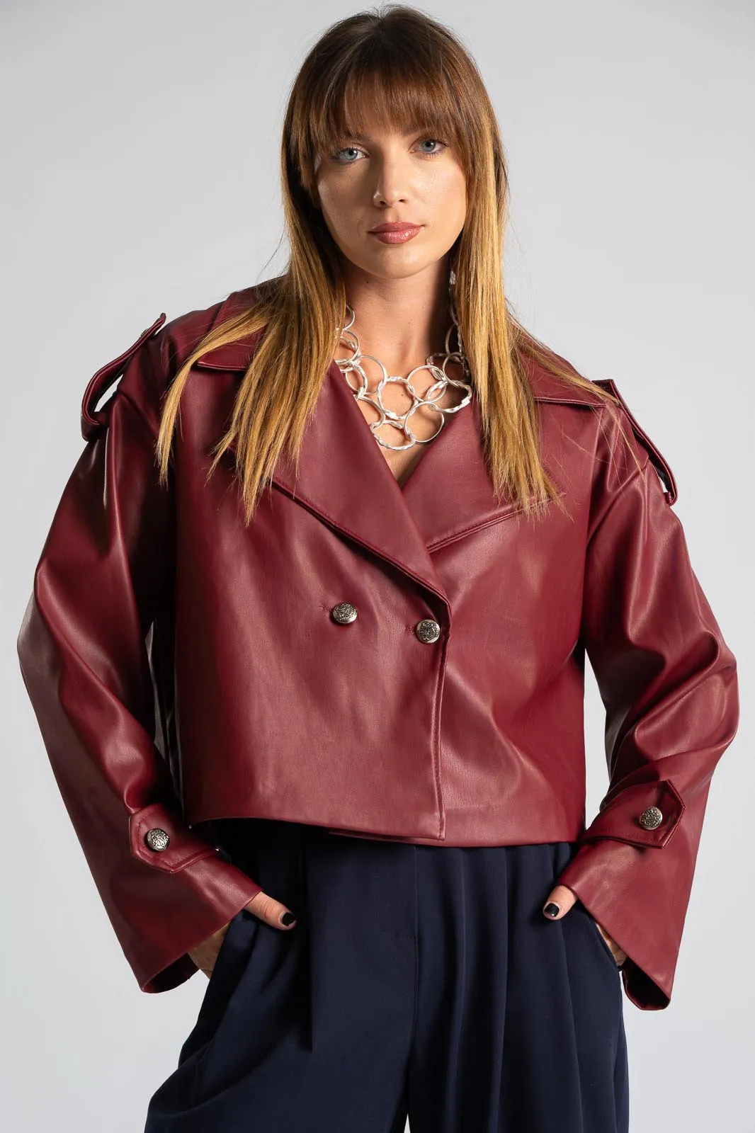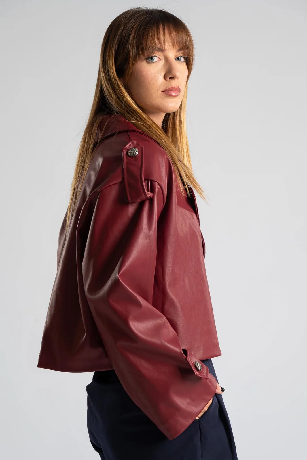 Jacket made of high-quality leatherette. Fastens with two buttons. Has a collar. Has long sleeves that end with an extra strap and decorative button. Measurements taken with buttons fastened. Lined interior. The measurements in the table are representative of each code. 40% polyester, 60% polyurethane.