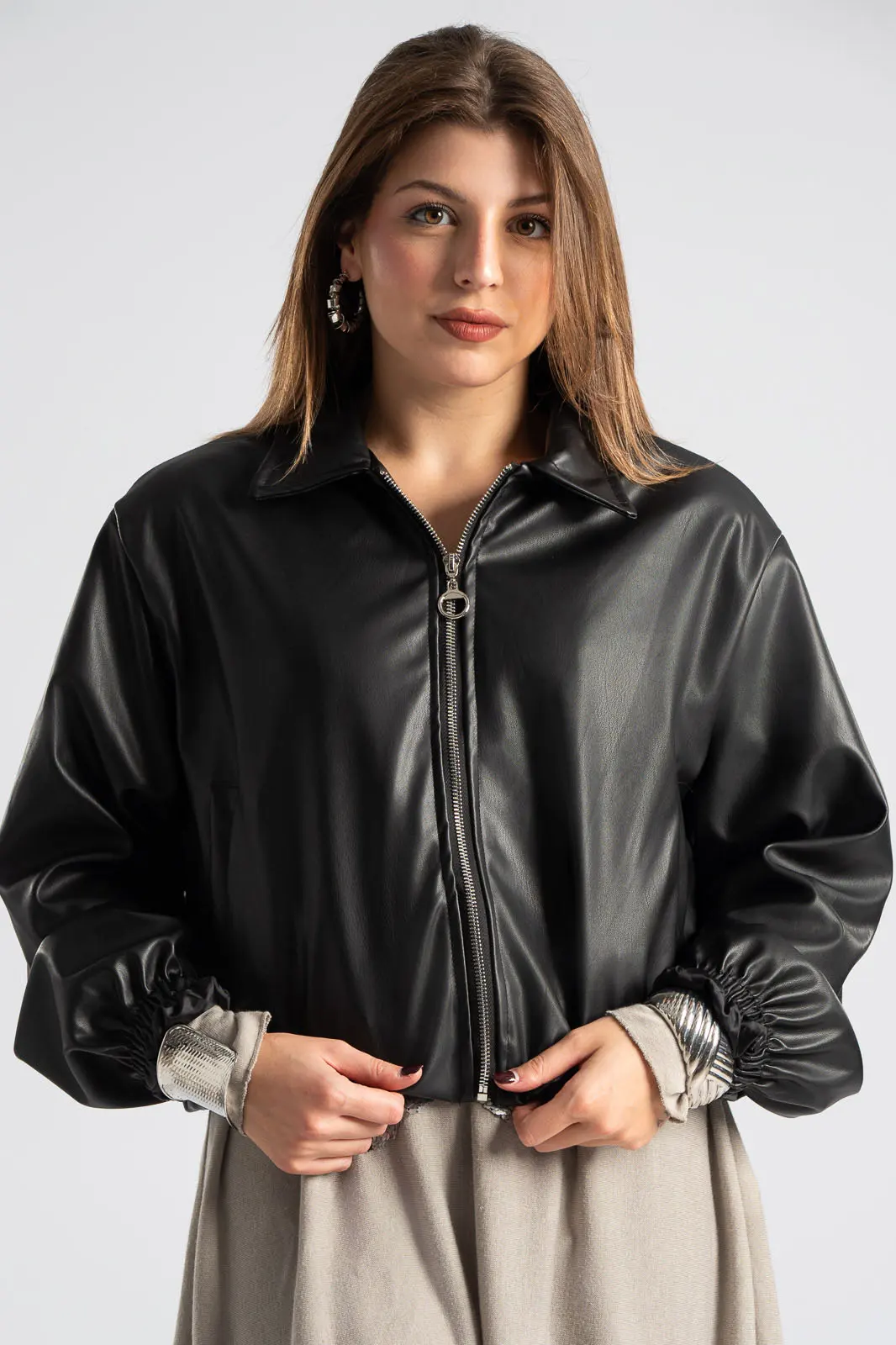 Jacket από εξαιρετικής ποιότητας δερματίνη. Κλείνει χιαστή με φερμουάρ. Έχει γιακά. Διαθέτει μακριά μανίκια που καταλήγουν σε λάστιχο. Στο τελείωμα έχει λάστιχο. Στα πλαινά έχει τσέπες. Η μέτρηση έχει γίνει με κλειστό φερμουάρ. Εσωτερικά είναι φοδραρισμένο. Οι μετρήσεις του πίνακα είναι αντιπροσωπευτικές για κάθε κωδικό. 100% polyester.