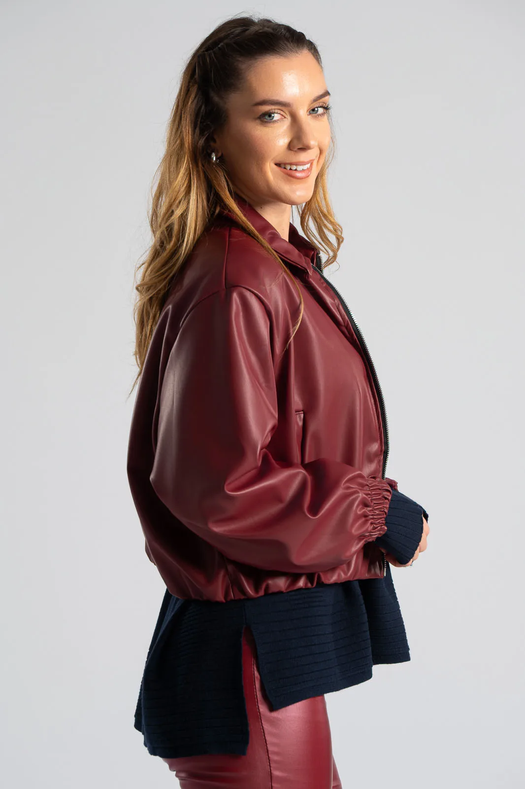 Jacket made of high-quality leatherette. Cross-over zip closure. Collar. Long sleeves with elasticated cuffs. Elasticated hem. Side pockets. Measurements taken with zipper closed. Lined interior. The measurements in the table are representative of each code. 100% polyester.