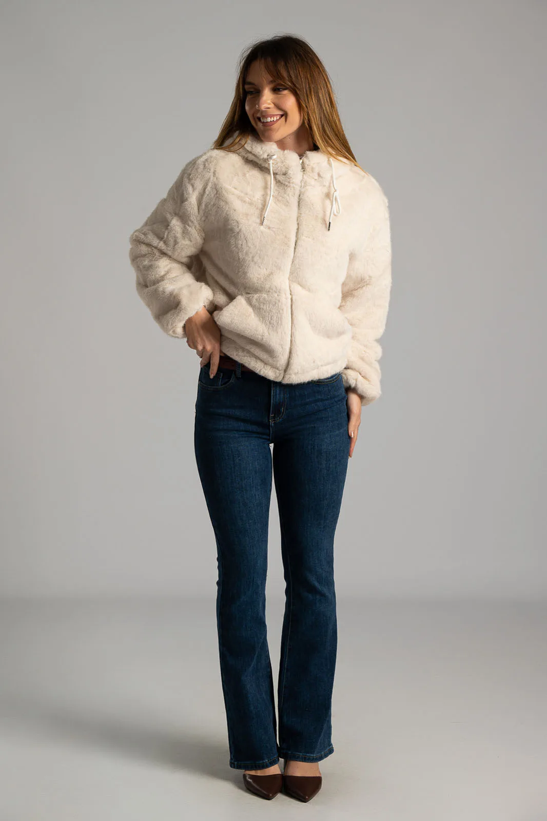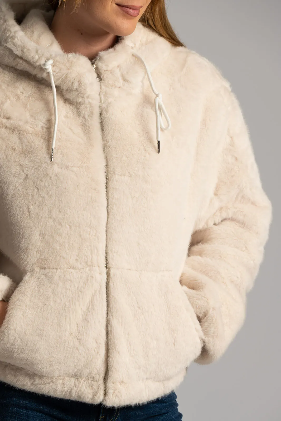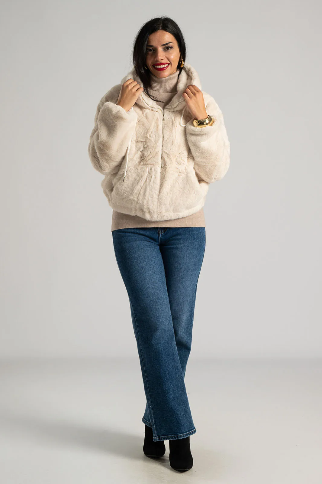 Jacket το οποίο αποτελείται από συνθετική μαλακή γούνα σε όλη την επιφάνεια. Διαθέτει μακριά μανίκια. Έχει στο μπροστινό μέρος τσέπες. Έχει απαλή υφή σε όλη την επιφάνεια. Κλείνει με φερμουάρ. Εσωτερικά δεν διαθέτει φόδρα. Έχει κουκούλα και κορδόνια για καλύτερη εφαρμογή. Η μέτρηση έχει γίνει με κλειστό το φερμουάρ. Έχει λάστιχο στα μανίκια και στο τελείωμα. Οι μετρήσεις του πίνακα είναι αντιπροσωπευτικές για κάθε προϊόν. 100% polyester.