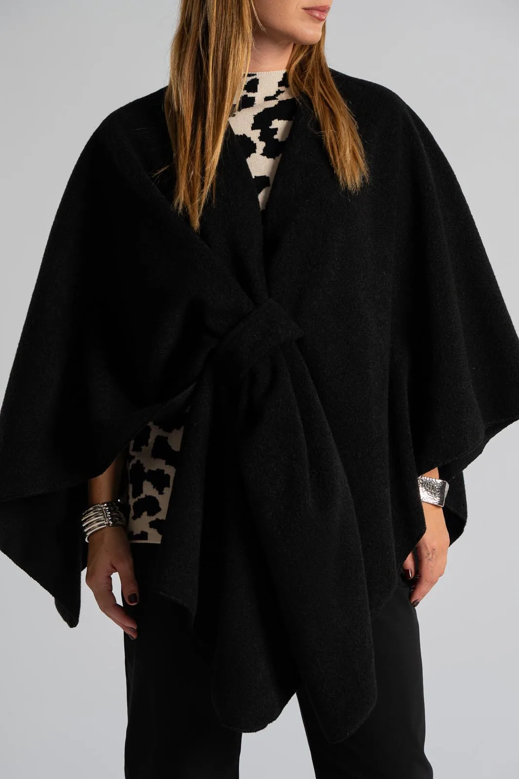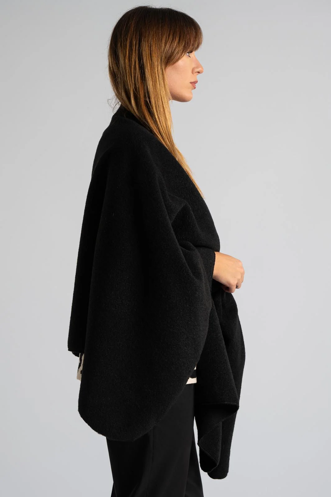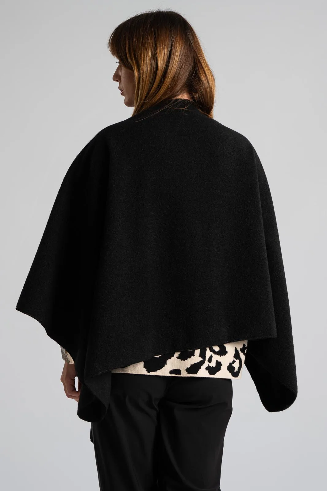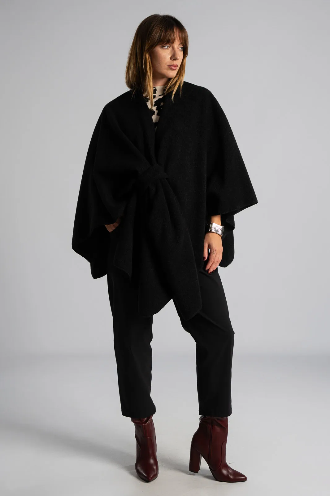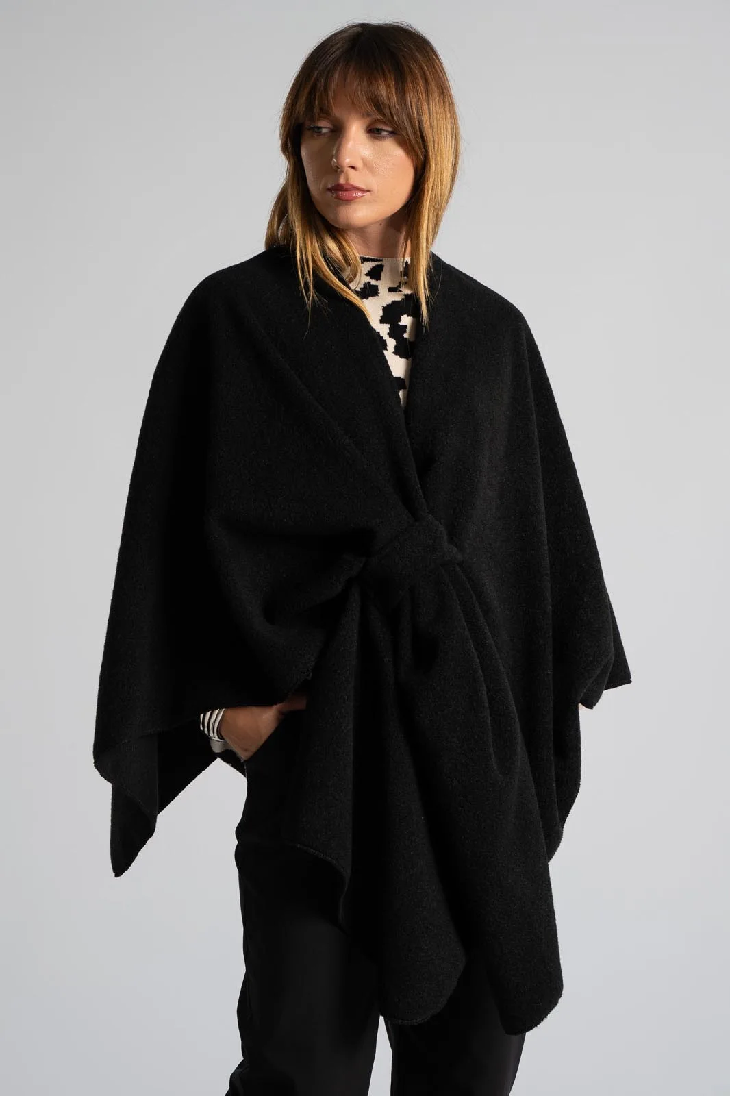 Cape that closes at the front. Its texture is slightly boucle. It is very soft. Capes are the fastest rising item of the season. 100% polyester.