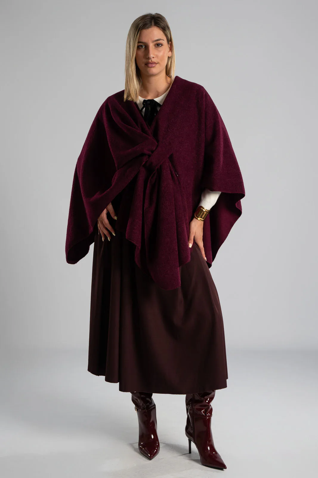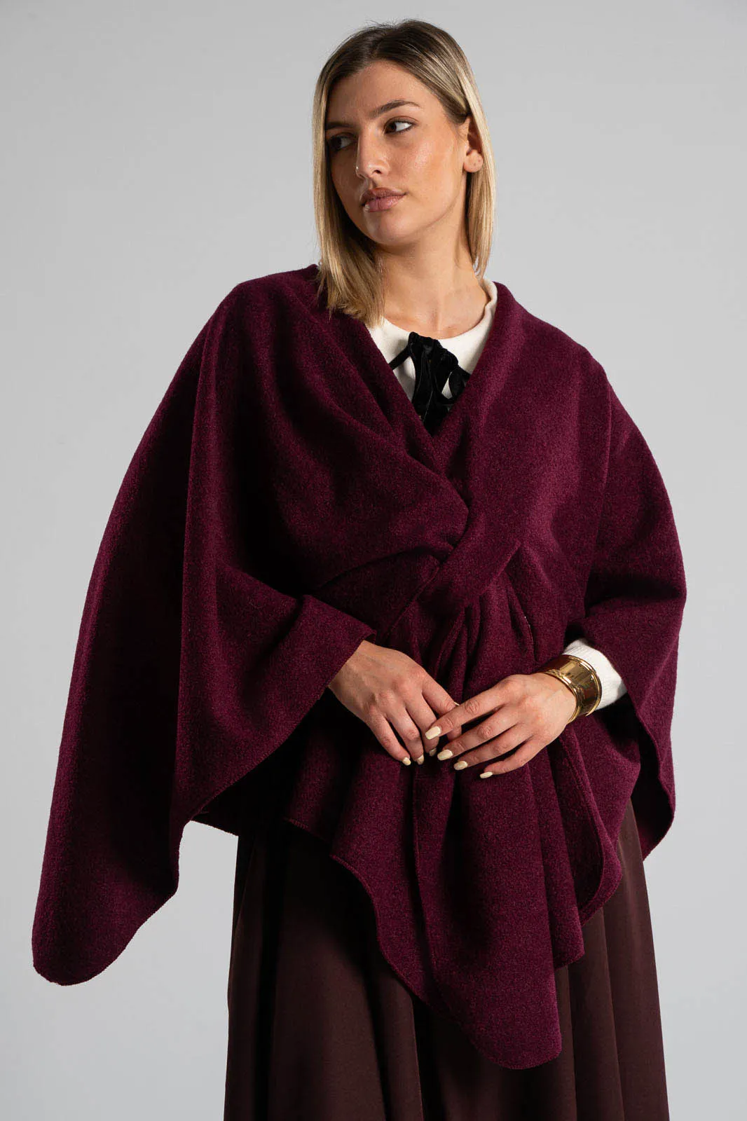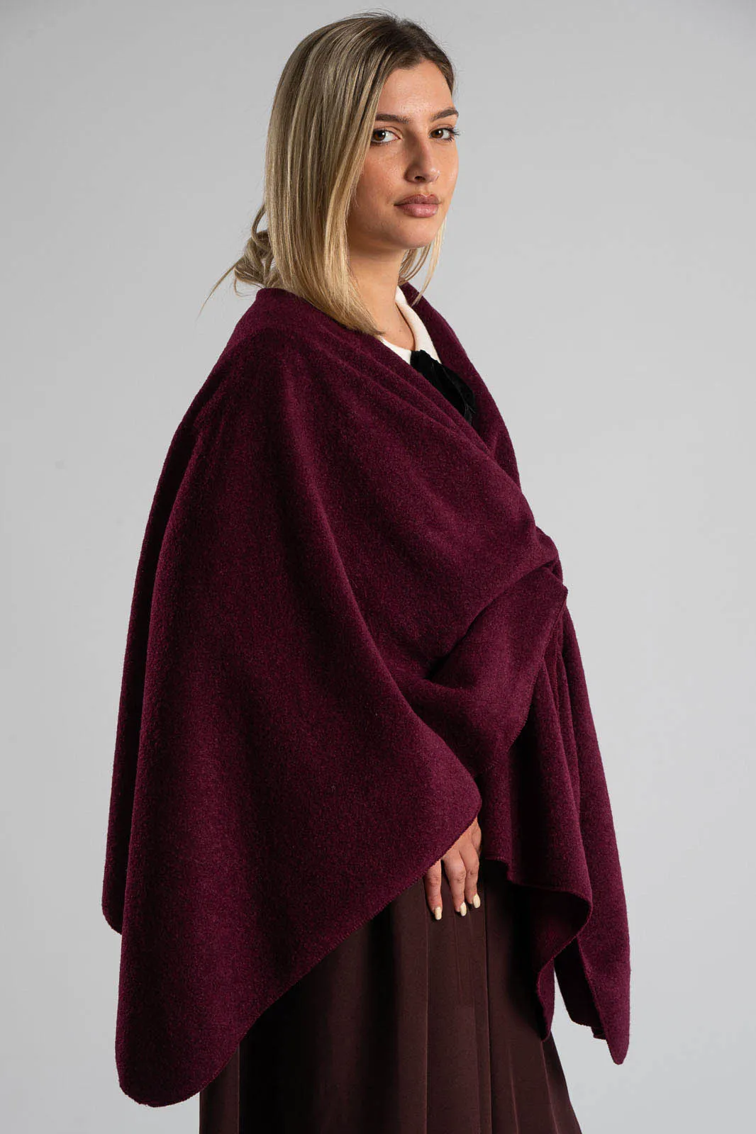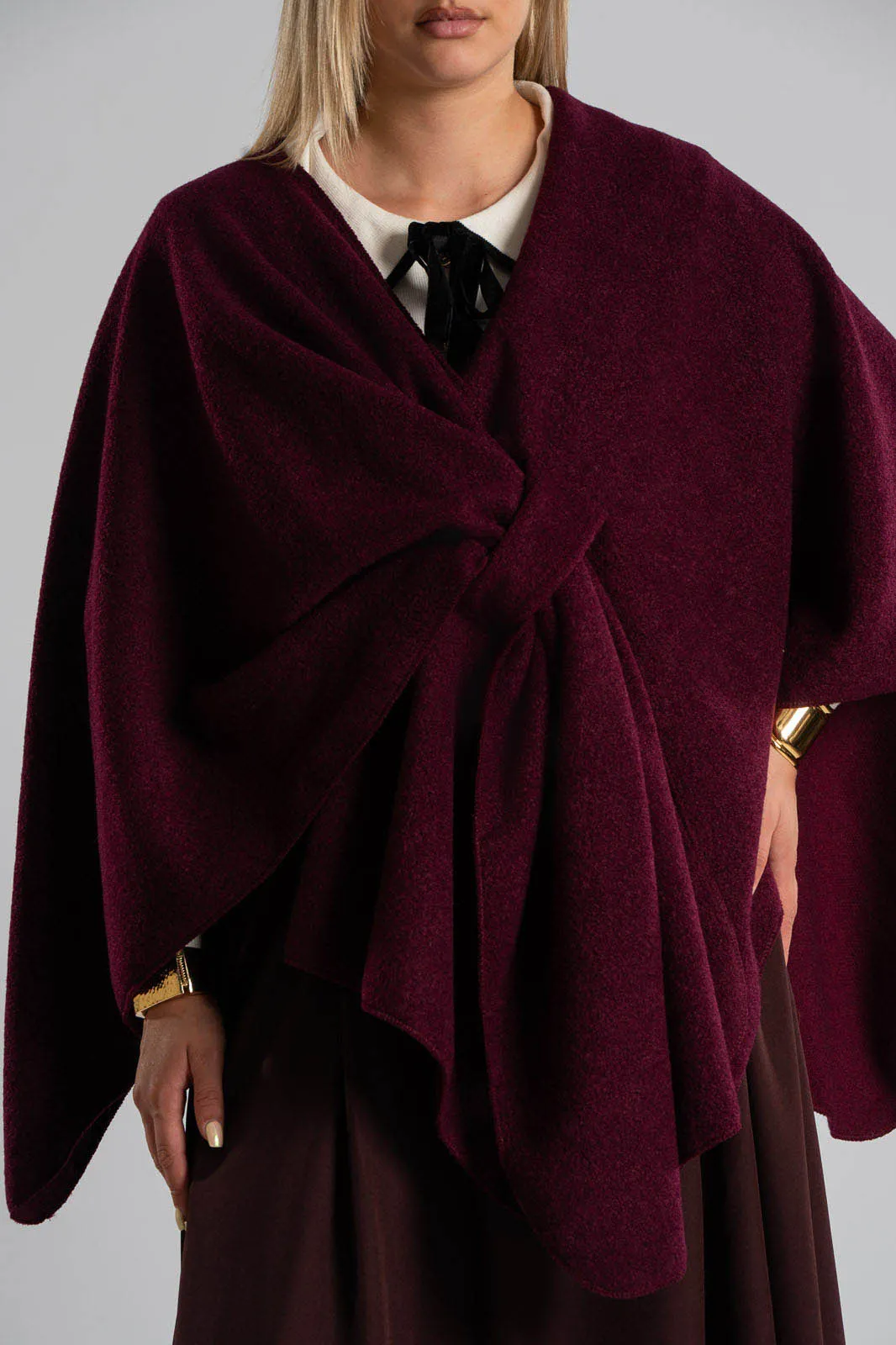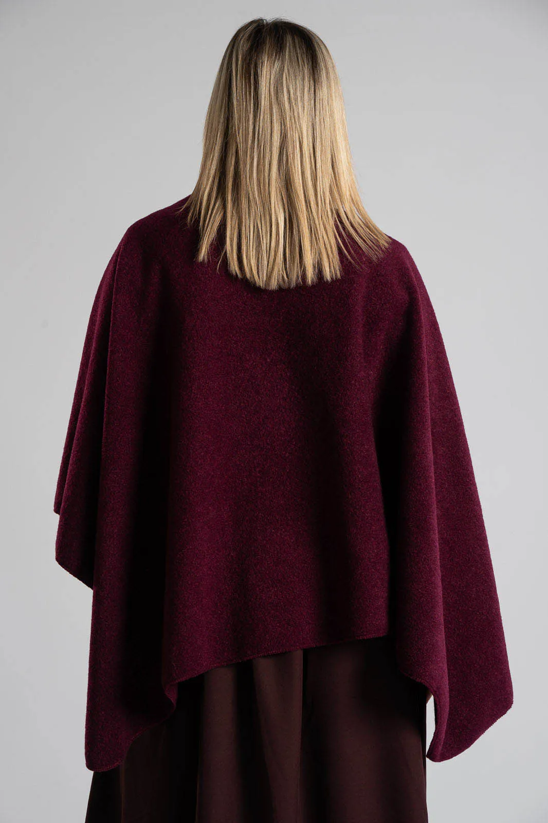 Cape that closes at the front. Its texture is slightly boucle. It is very soft. Capes are the fastest rising item of the season. 100% polyester.