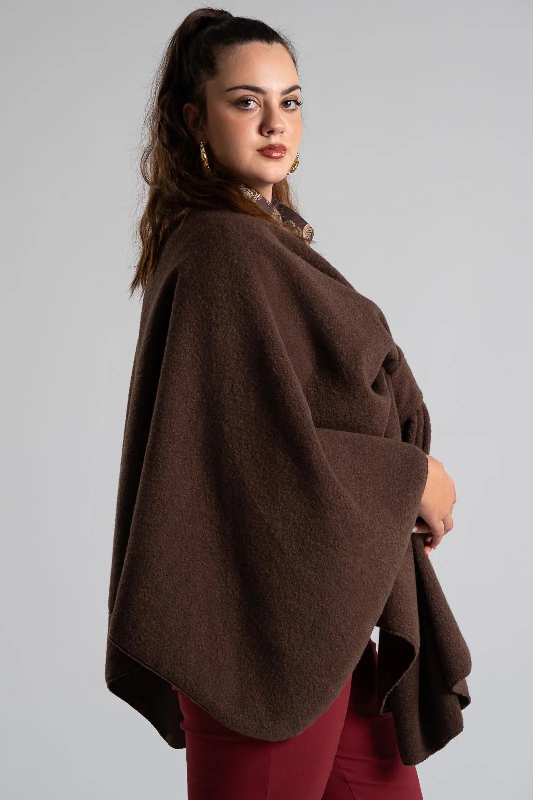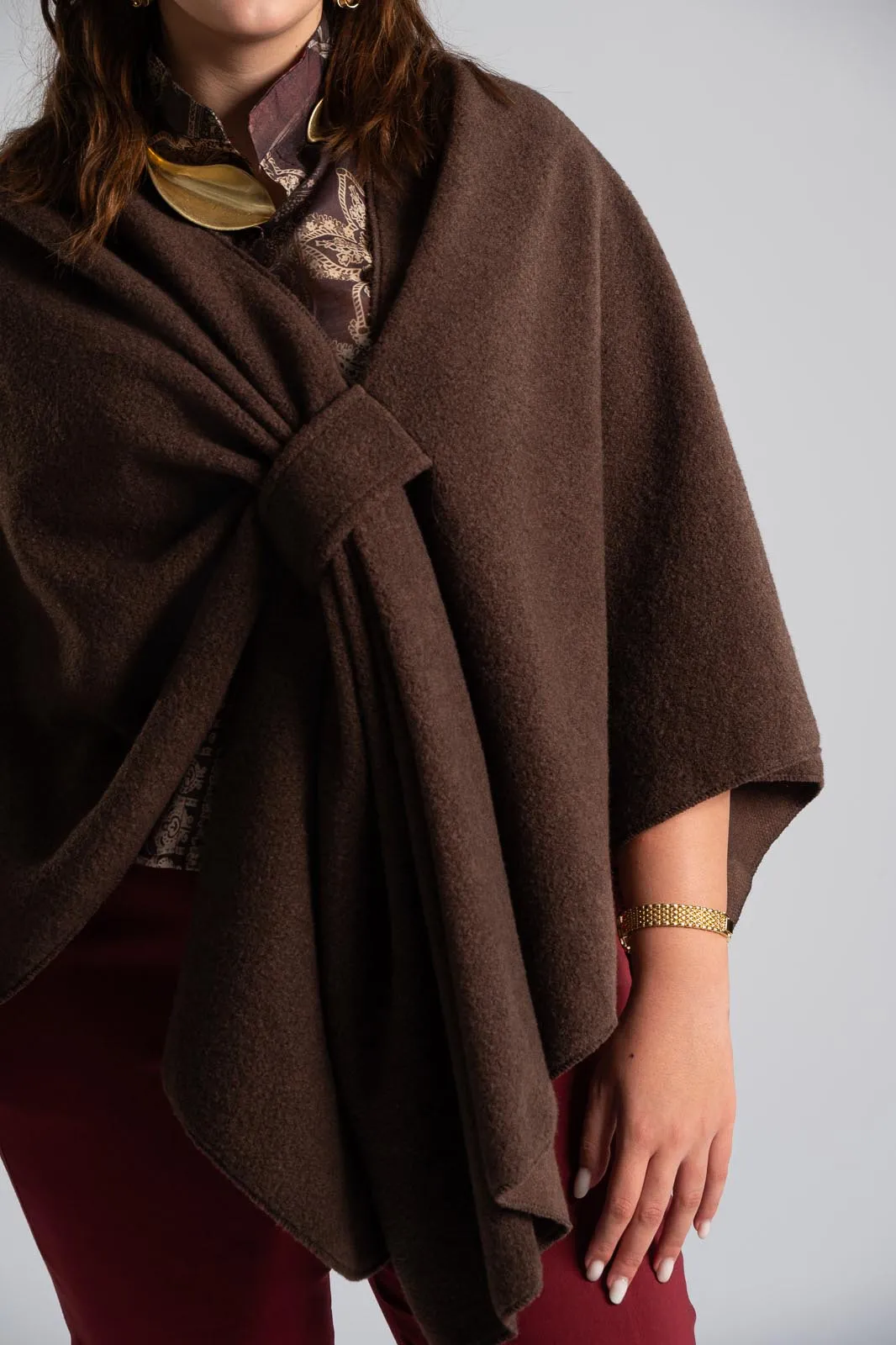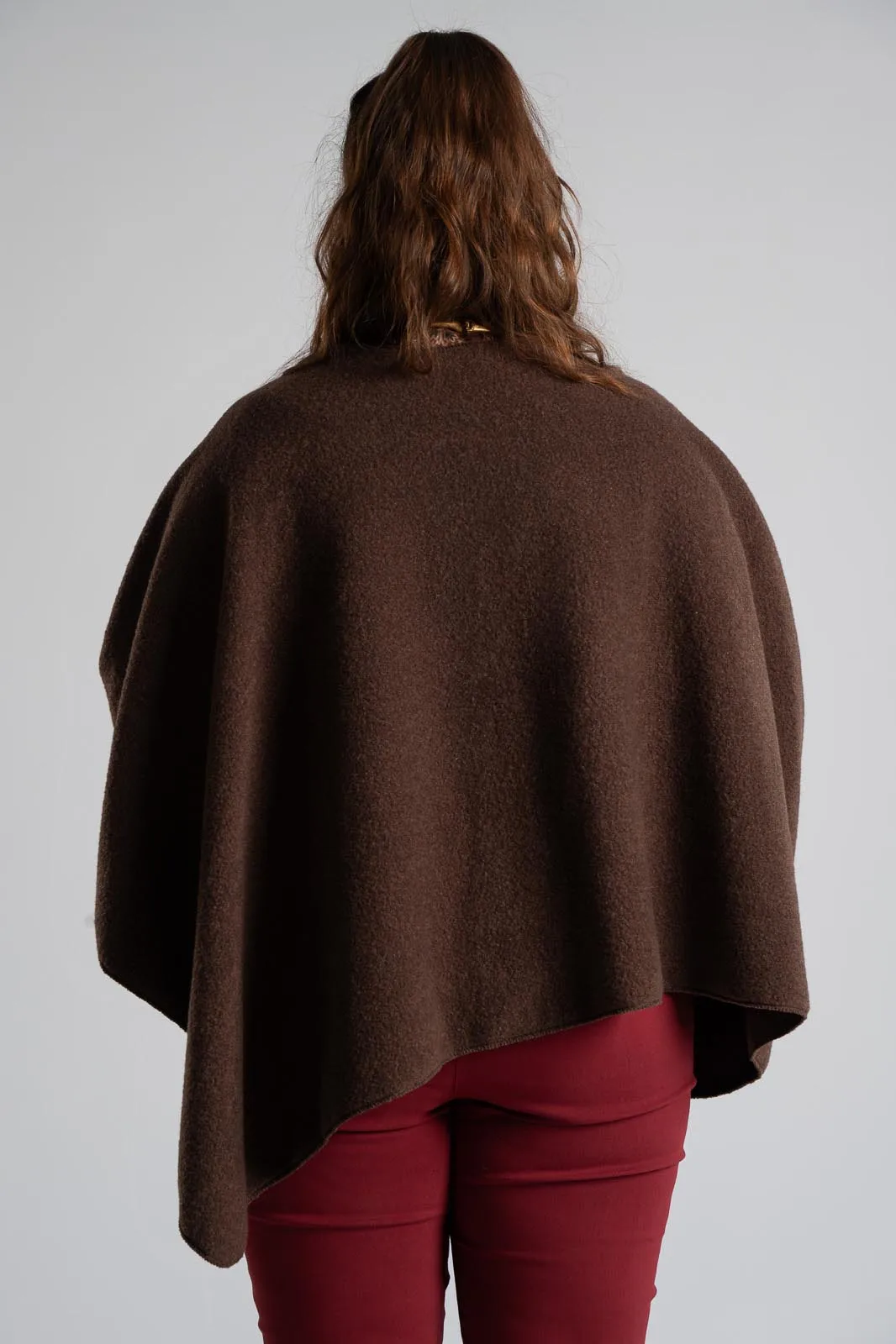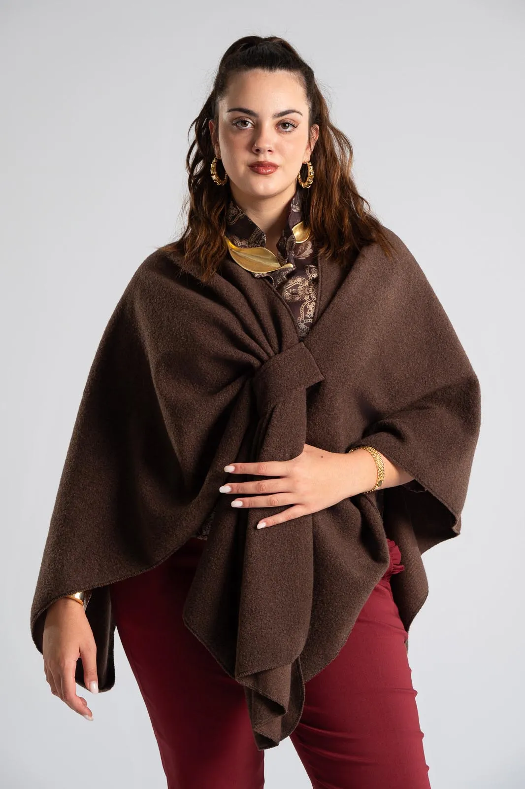 Cape that closes at the front. Its texture is slightly boucle. It is very soft. Capes are the fastest rising item of the season. 100% polyester.