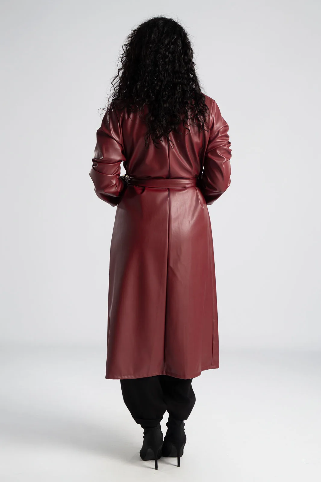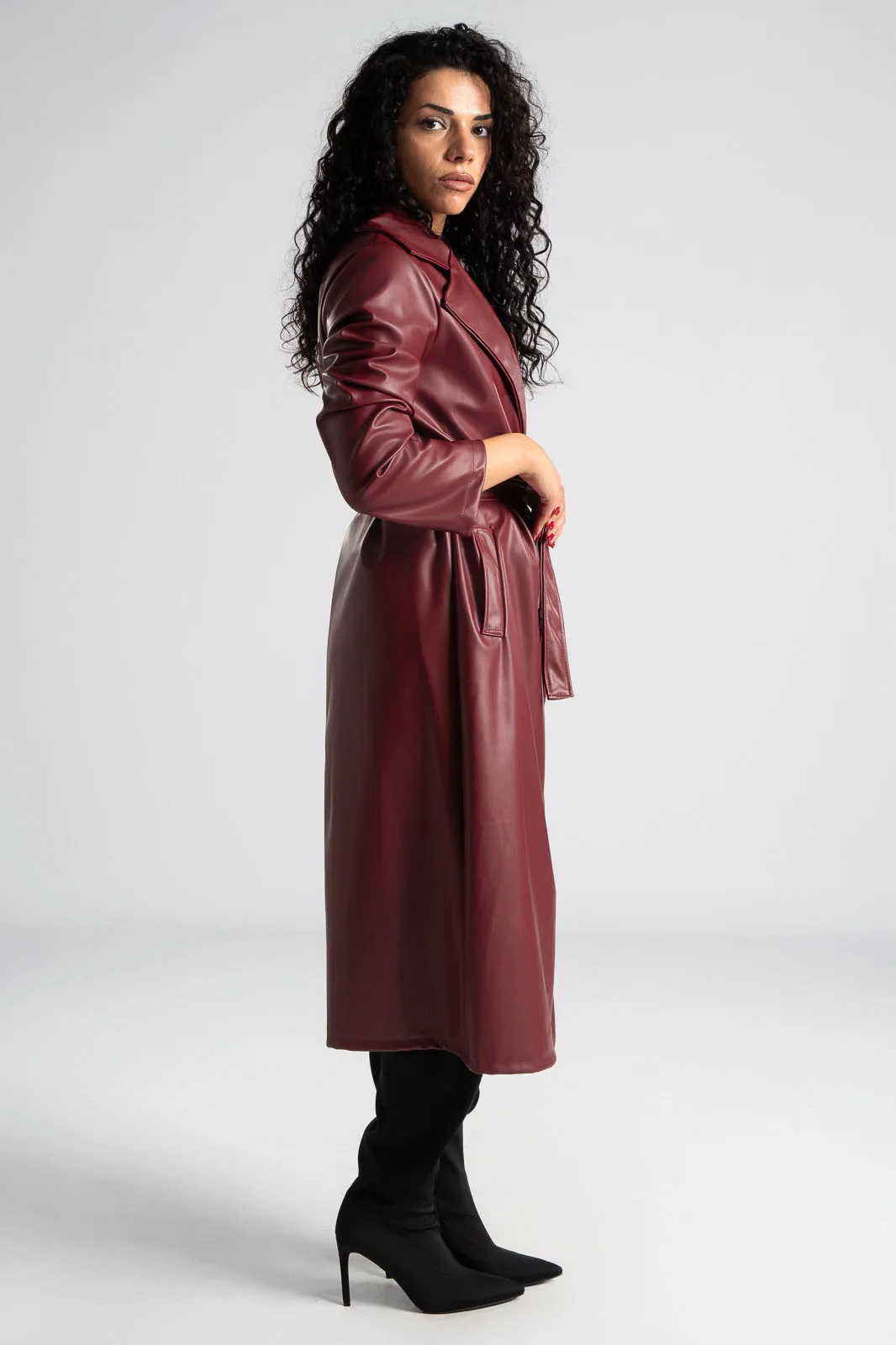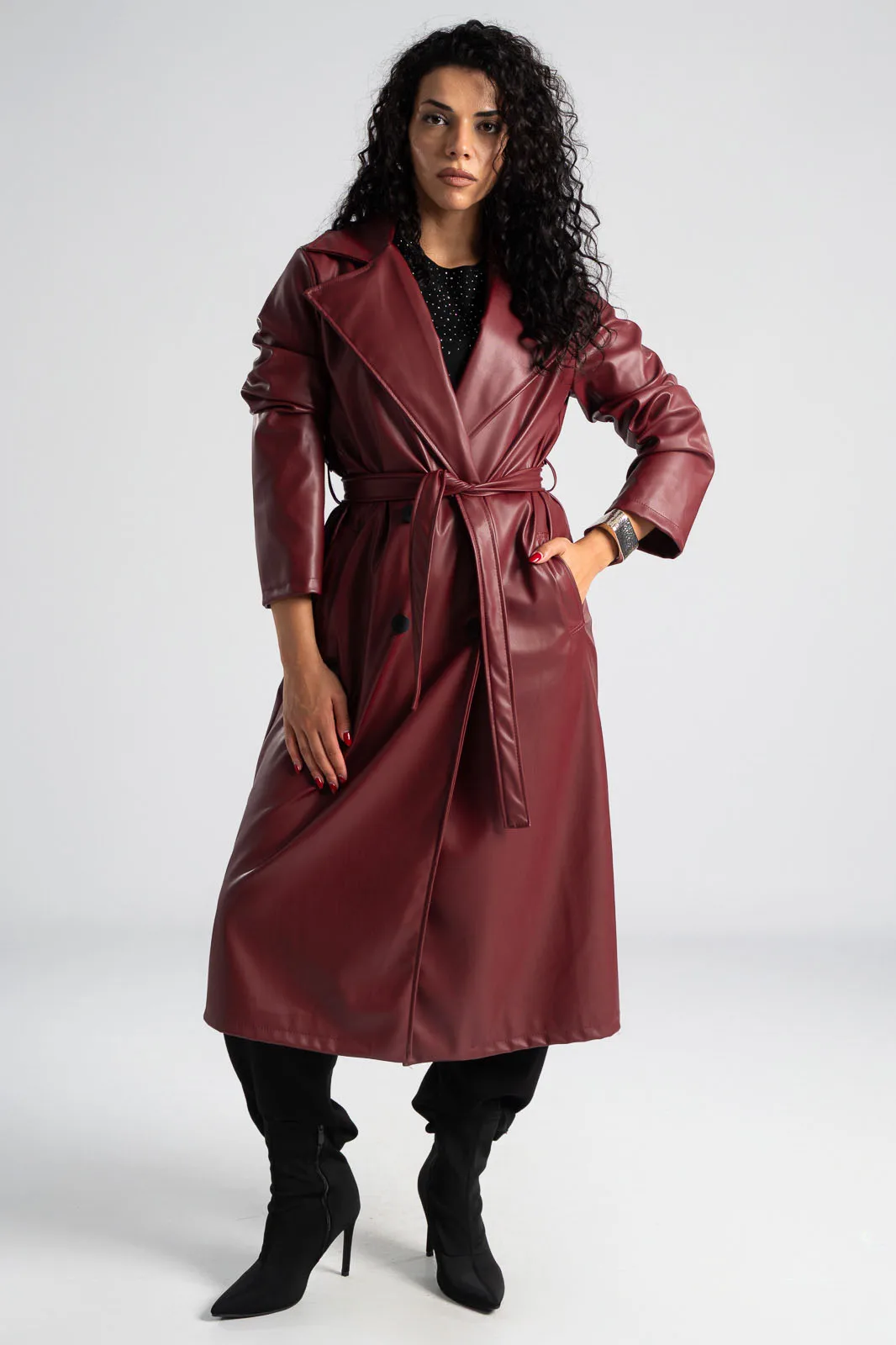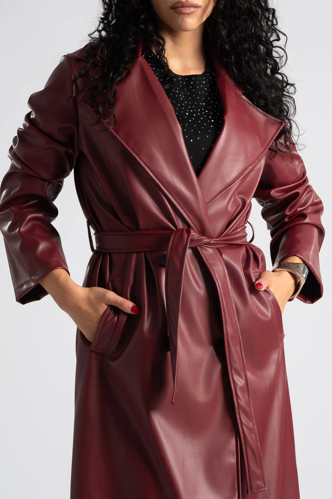 Καπαρντίνα από εξαιρετικής ποιότητας δερματίνη. Διαθέτει γιακά και πέτο. Έχει δική του ζώνη στην ίδια απόχρωση και υφή. Έχει πλαινές τσέπες και κλείνει με κουμπιά. Η μέτρηση έχει γίνει με άνοιγμα μιας παλάμης. Οι μετρήσεις του πίνακα είναι αντιπροσωπευτικές για κάθε κωδικό. 60% polyurethane, 40% polyester.