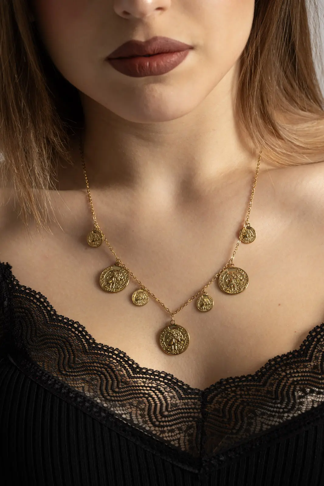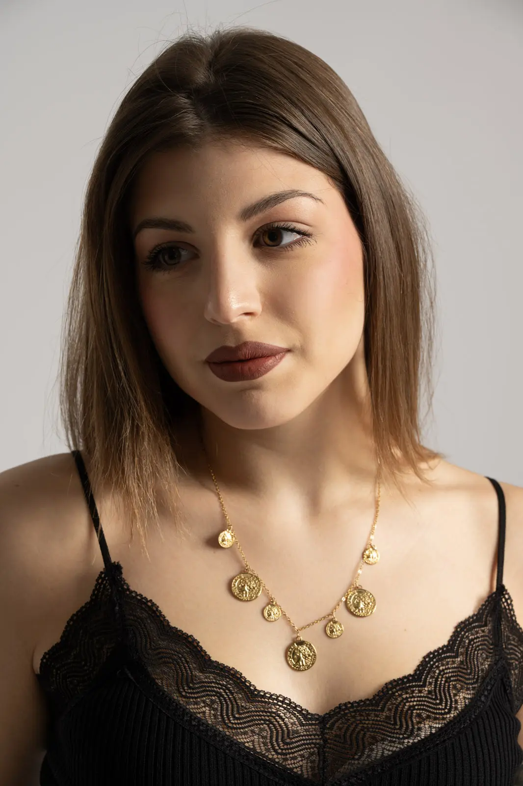 Κολιέ το οποίο αποτελείται από λεπτή αλυσίδα η οποία έχει διακοσμητικά κρεμαστά στοιχεία σε στρογγυλό σχήμα. Κλείνει με κούμπωμα. Μήκος αλυσίδας 54cm, με extra προέκταση 5cm.