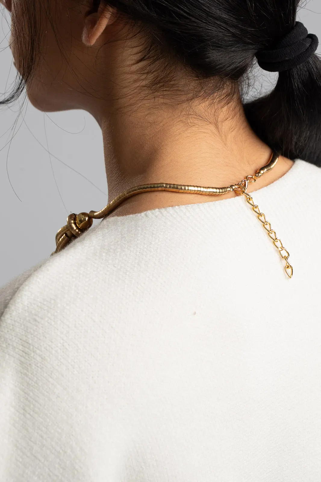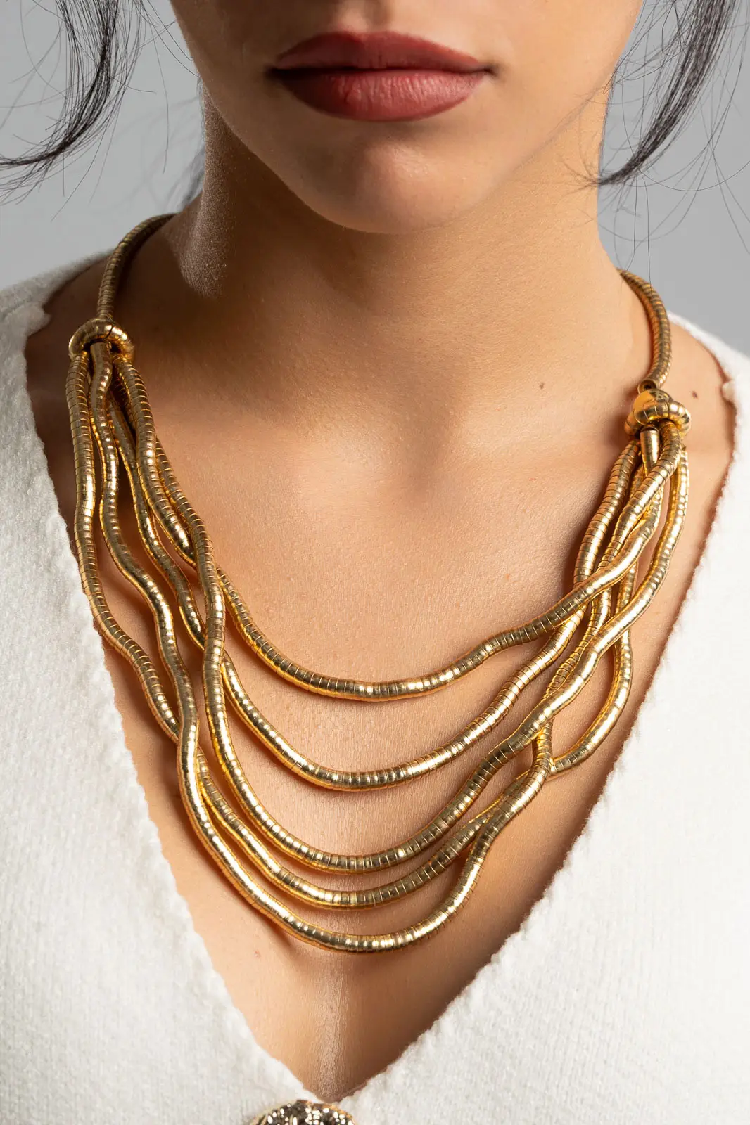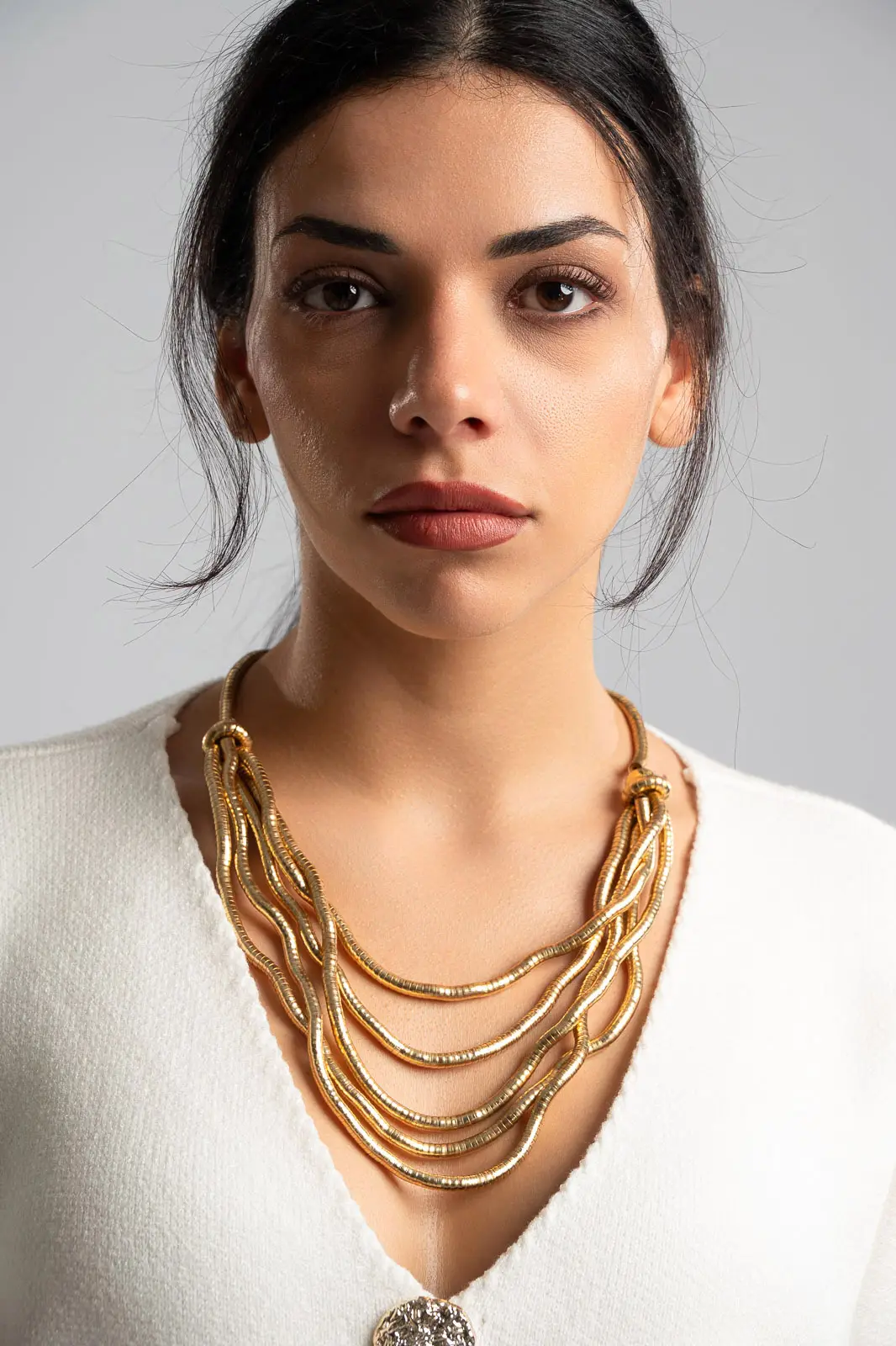 Κολιέ που διαθέτει δύο μπίλιες στα πλαινά και καταλήγει σε πολλαπλές αλυσίδες τύπου snake. Κλείνει με κούμπωμα στο πίσω μέρος. Το μεγαλύτερο μήκος είναι 53cm και το μικρότερο είναι 50cm. Διαθέτει επέκταση 7cm.