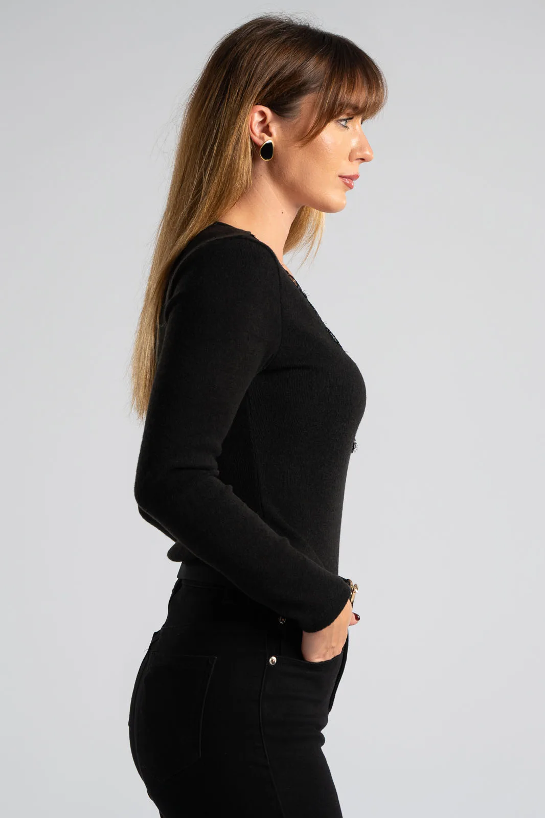 Κορμάκι νημάτινο με συμπαγή πλέξη. Έχει μακριά μανίκια και έχει V λαιμόκοψη. Στη λαιμόκοψη περιμετρικά διαθέτει δαντέλα. Έχει πολύ μαλακό ύφασμα. Οι μετρήσεις του πίνακα είναι αντιπροσωπευτικές για κάθε προϊόν. 82% polyester, 14% viscose, 4% elastan.