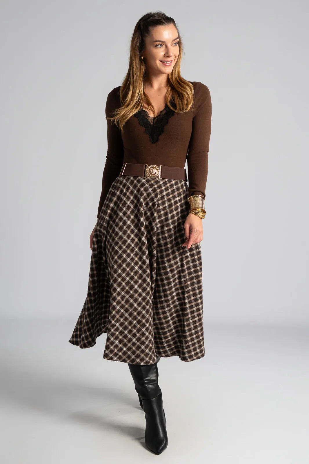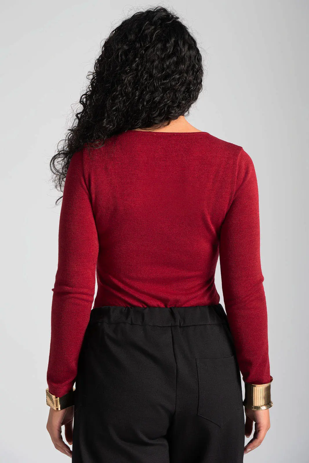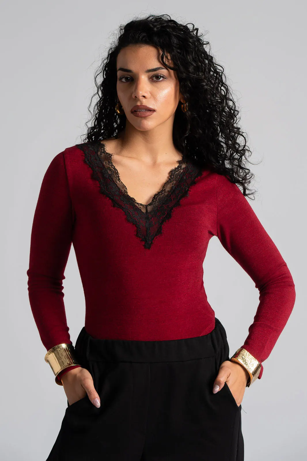 Thin knit bodysuit with compact weave. It has long sleeves and a V-neck. The neckline is trimmed with lace around the edge. The fabric is very soft. The measurements in the table are representative of each product. 82% polyester, 14% viscose, 4% elastane.