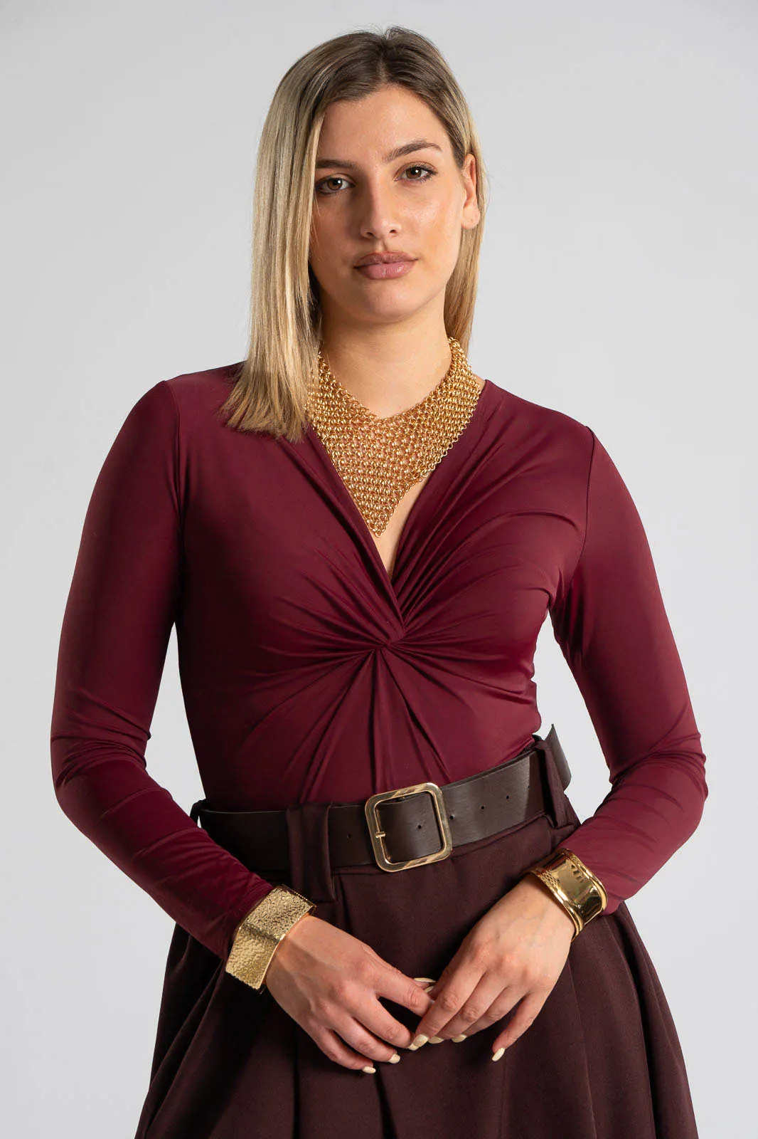 Bodysuit with a V-neckline that ends in a ruffle. It has long sleeves. It has a magipano texture. The measurements in the table are representative for each product. 95% polyamide, 5% elastane.