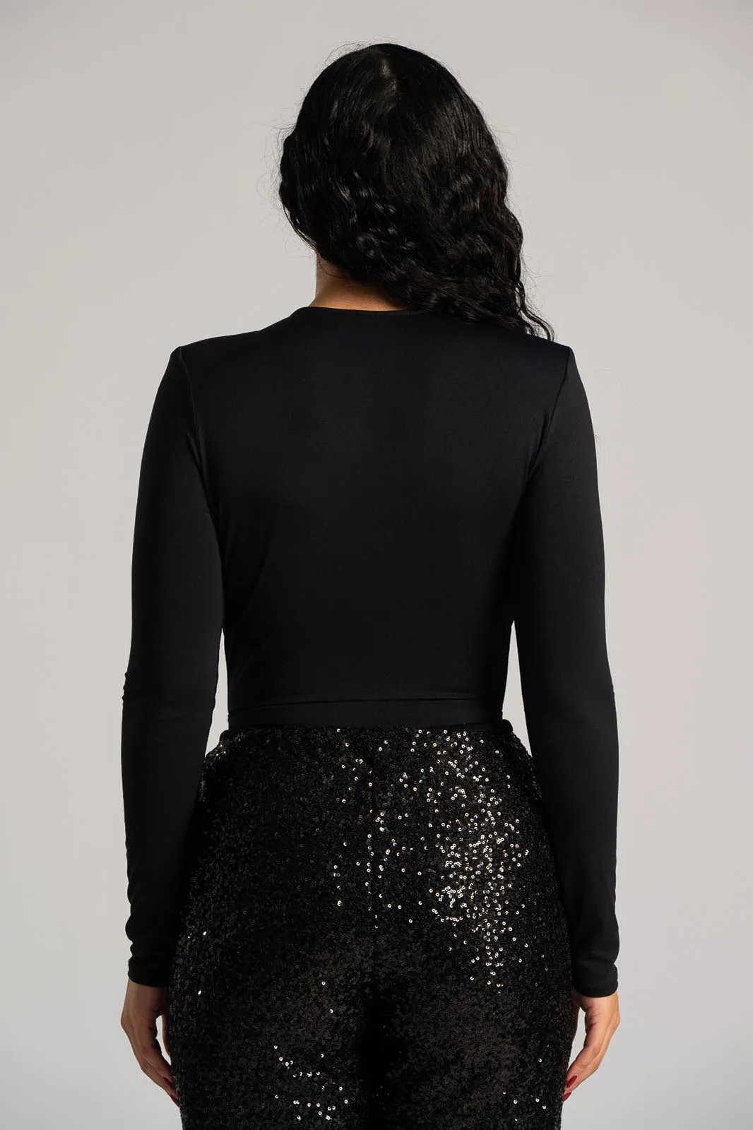 Bodysuit with a deep V-neckline at the front that ends in a bow, creating a ruffle effect. It has long sleeves and is made from very soft fabric.  The measurements in the table are representative of each product. 90% nylon, 10% elastane.