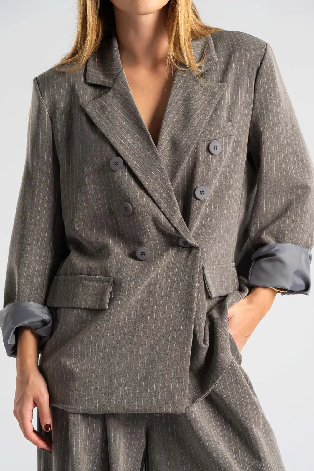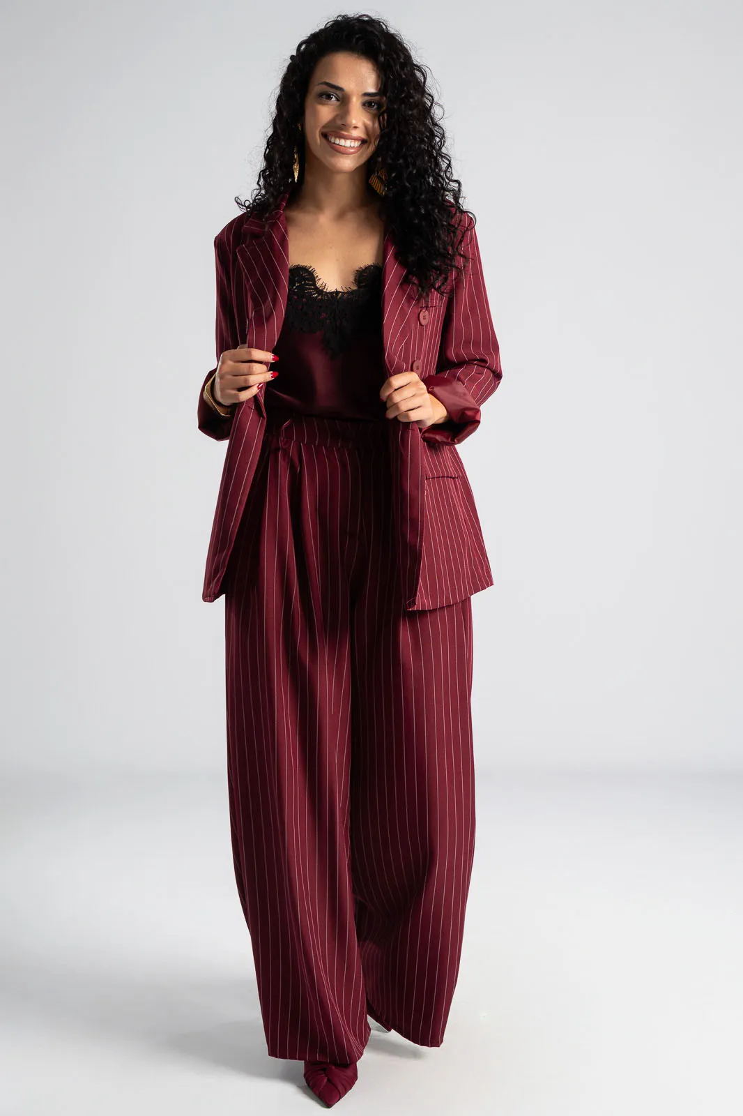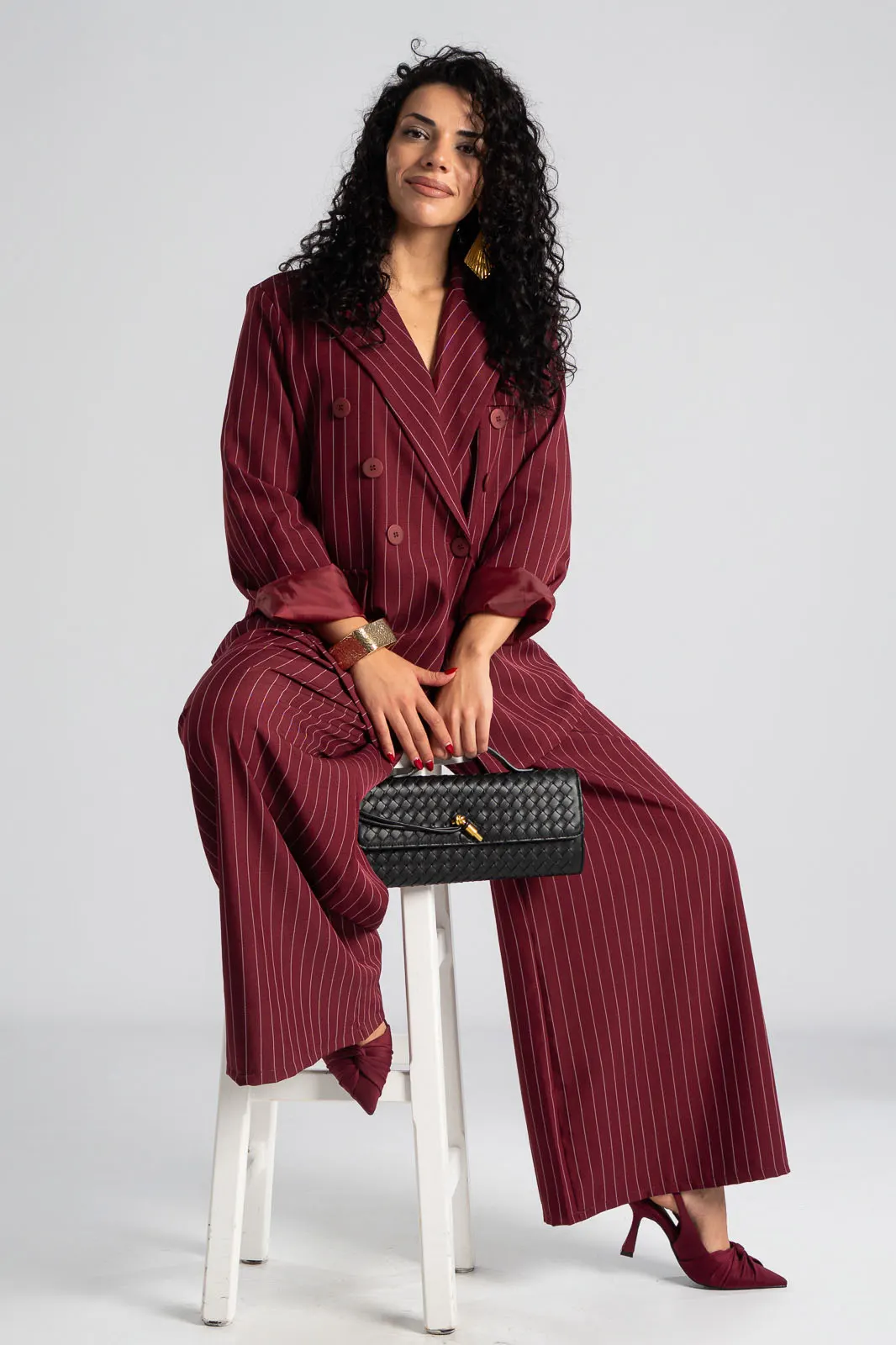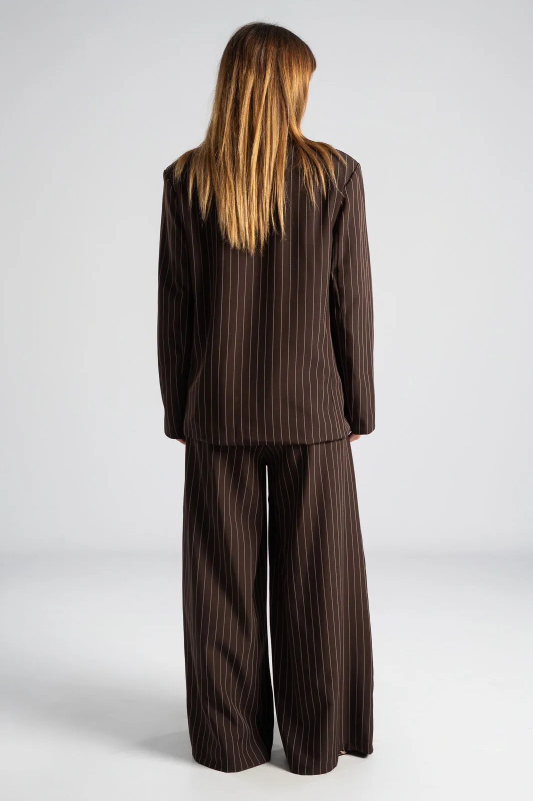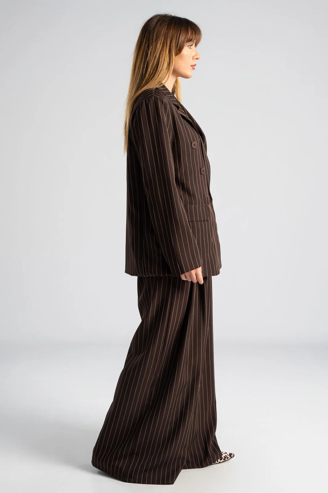 Σετ το οποίο αποτελείται απο παντελόνι και σακάκι. Σε όλη την επιφάνεια έχει κάθετες λεπτές ρίγες. Το σακάκι είναι σε ίσια γραμμή, έχει γιακά και πέτο. Έχει διακοσμητικά κουμπιά και κλείνει με ένα. Έχει διακοσμητικές τσέπες με καπάκι και μια στο επάνω μέρος με ρέλι. Διαθέτει βάτες στους ώμους. Εσωτερικά είναι φοδραρισμένο. Το παντελόνι έχει λάστιχο στη μέση. Στο μπροστινό μέρος έχει πιέτες. Κλείνει με κουμπί και φερμουάρ. Στα πλαινά έχει τσέπες. Η μέτρηση στο σακάκι έχουν γίνει με κλειστά κουμπιά. Οι μετρήσεις του πίνακα είναι αντιπροσωπευτικές για κάθε κωδικό. 100% polyester.Σακάκι: