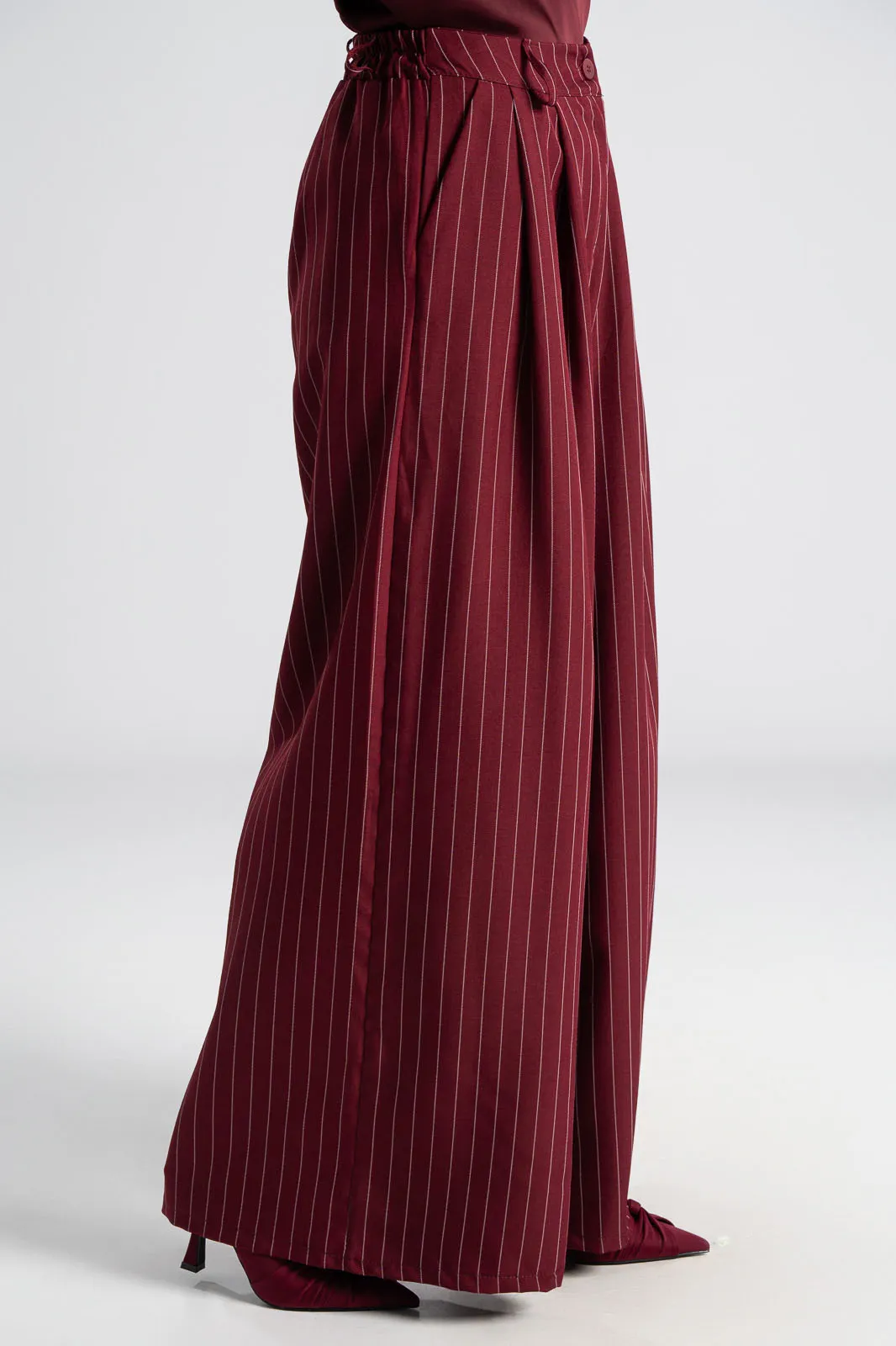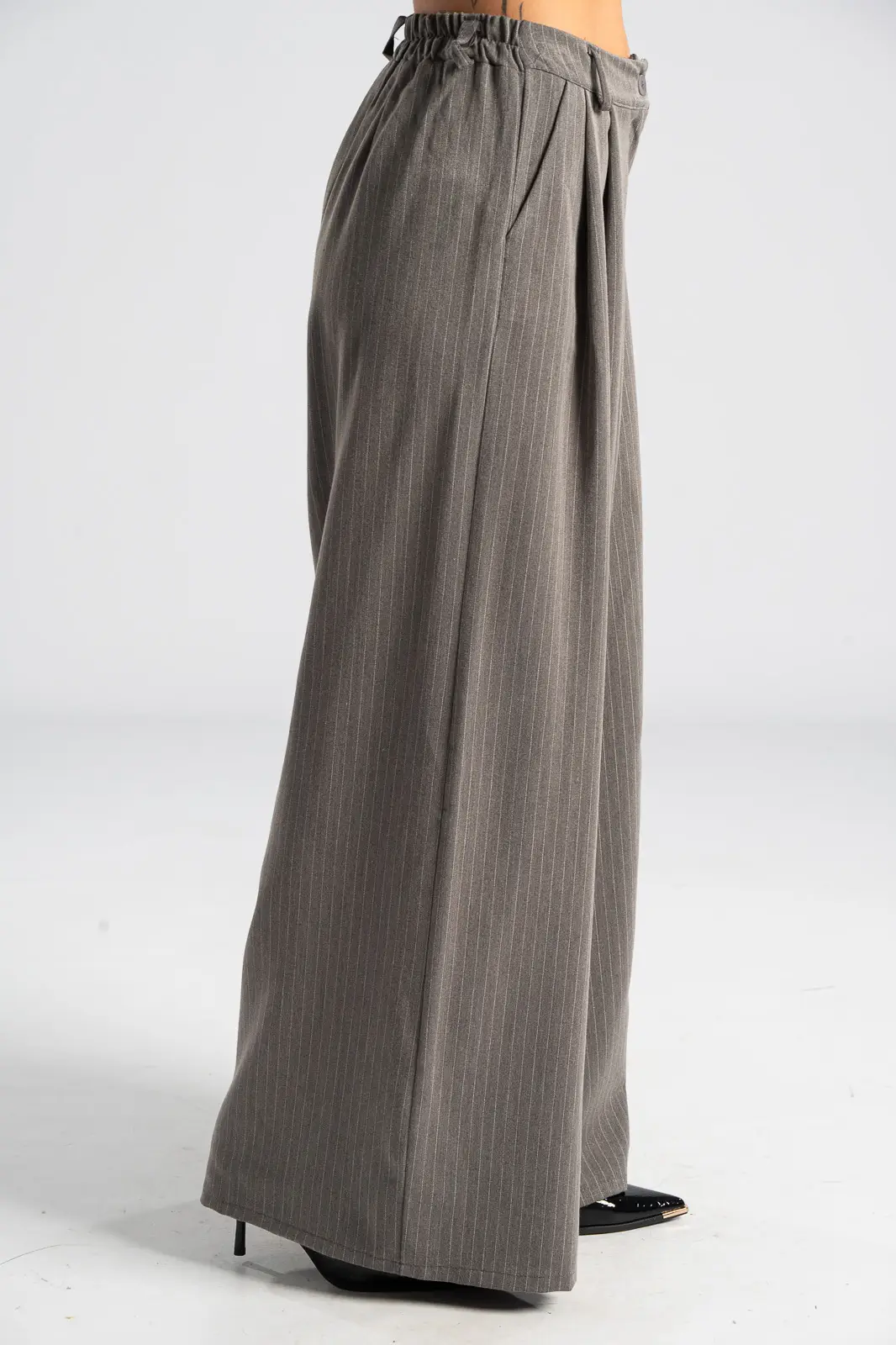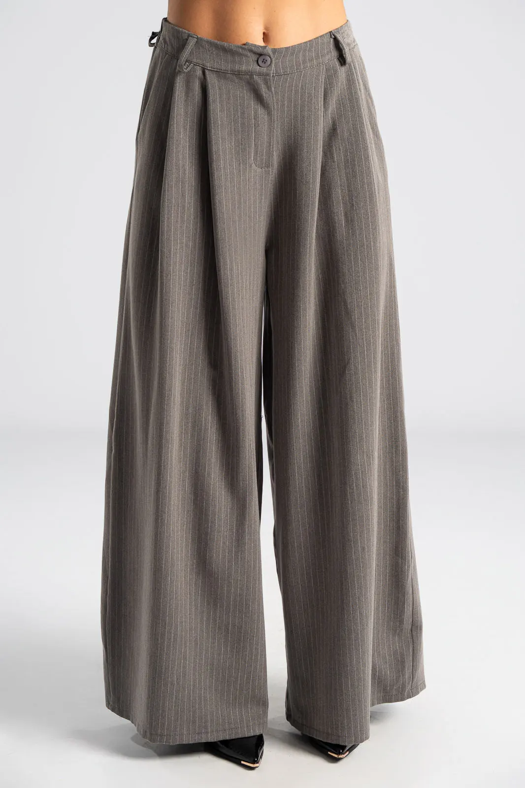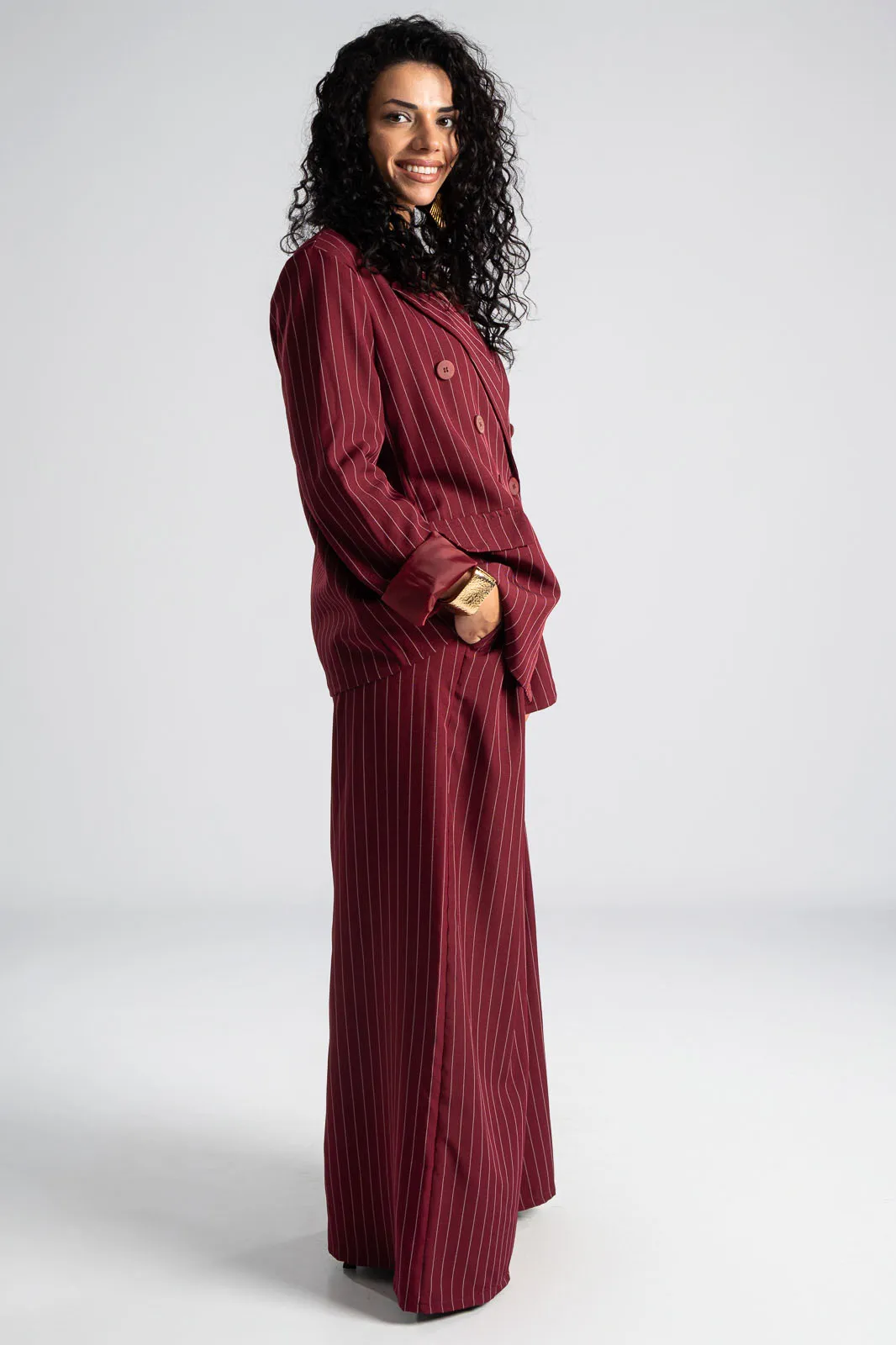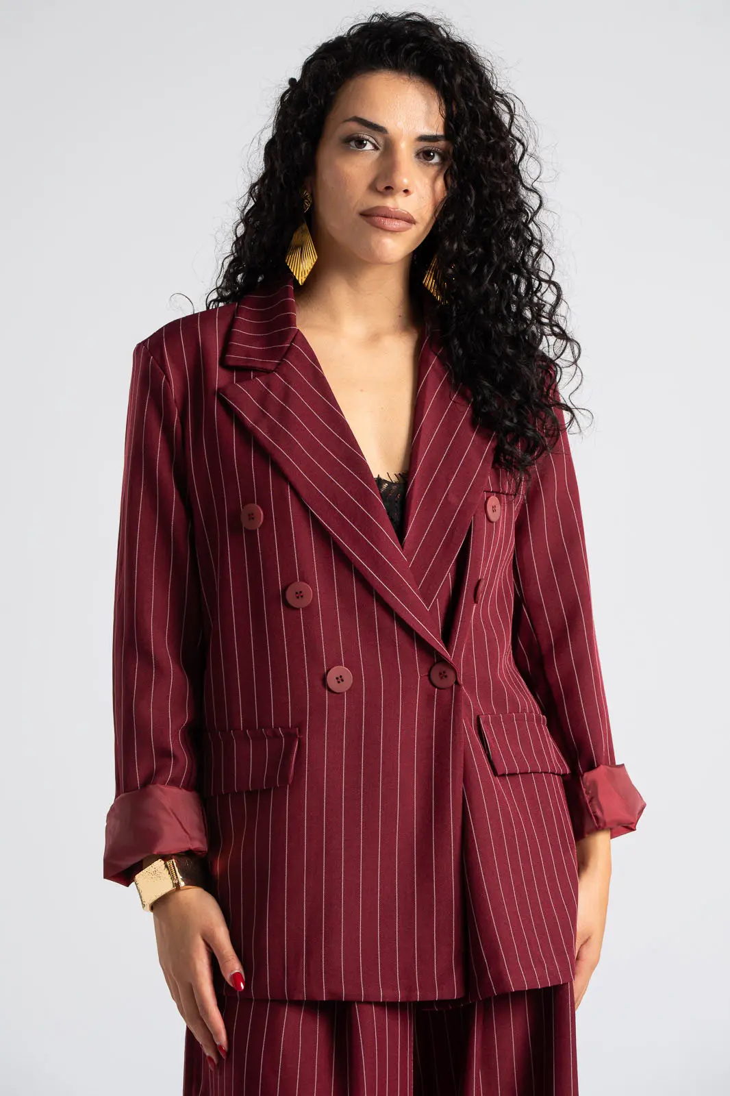 Σετ το οποίο αποτελείται απο παντελόνι και σακάκι. Σε όλη την επιφάνεια έχει κάθετες λεπτές ρίγες. Το σακάκι είναι σε ίσια γραμμή, έχει γιακά και πέτο. Έχει διακοσμητικά κουμπιά και κλείνει με ένα. Έχει διακοσμητικές τσέπες με καπάκι και μια στο επάνω μέρος με ρέλι. Διαθέτει βάτες στους ώμους. Εσωτερικά είναι φοδραρισμένο. Το παντελόνι έχει λάστιχο στη μέση. Στο μπροστινό μέρος έχει πιέτες. Κλείνει με κουμπί και φερμουάρ. Στα πλαινά έχει τσέπες. Η μέτρηση στο σακάκι έχουν γίνει με κλειστά κουμπιά. Οι μετρήσεις του πίνακα είναι αντιπροσωπευτικές για κάθε κωδικό. 100% polyester.Σακάκι: