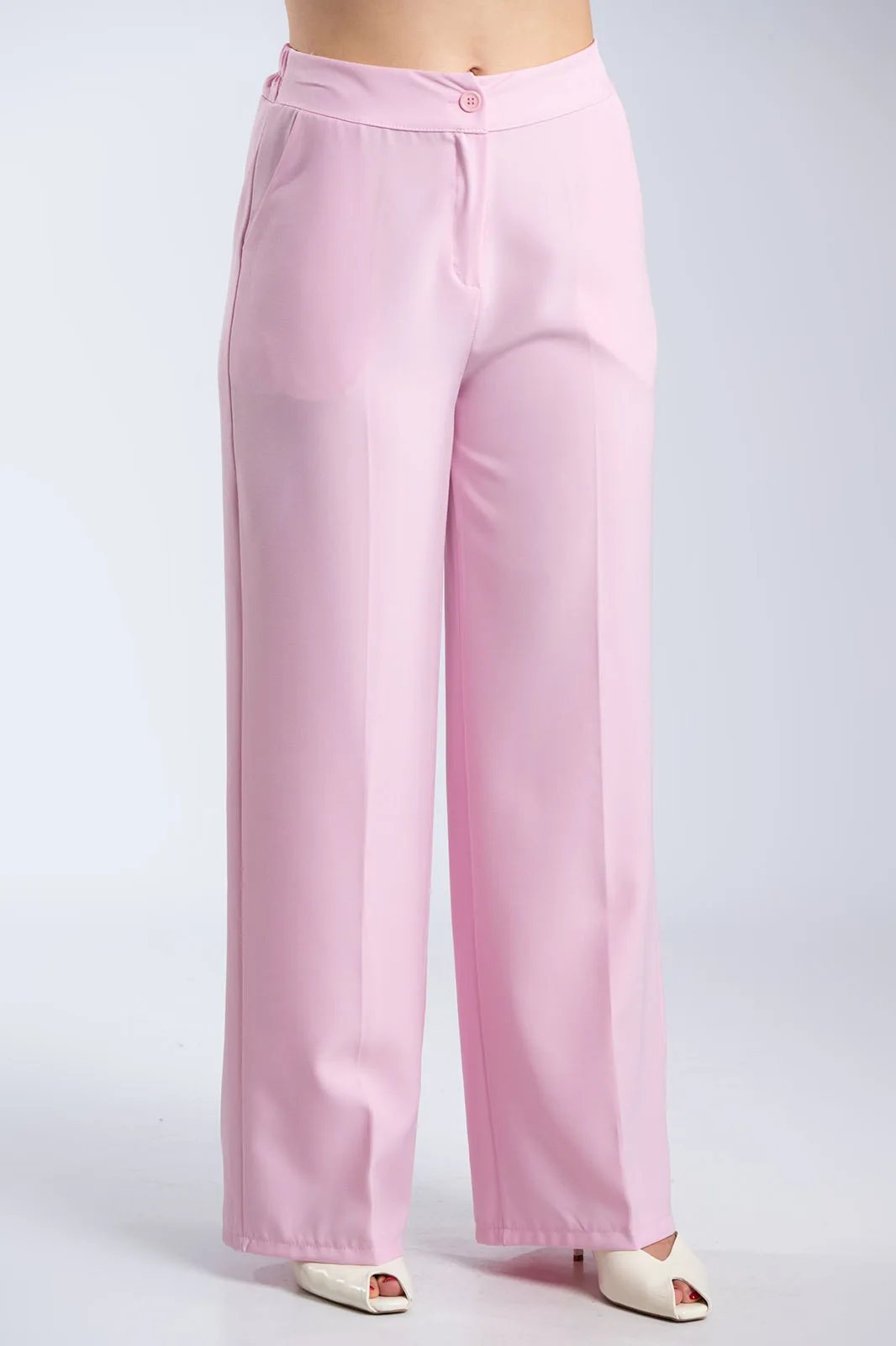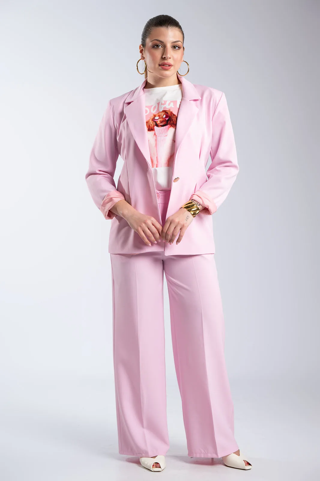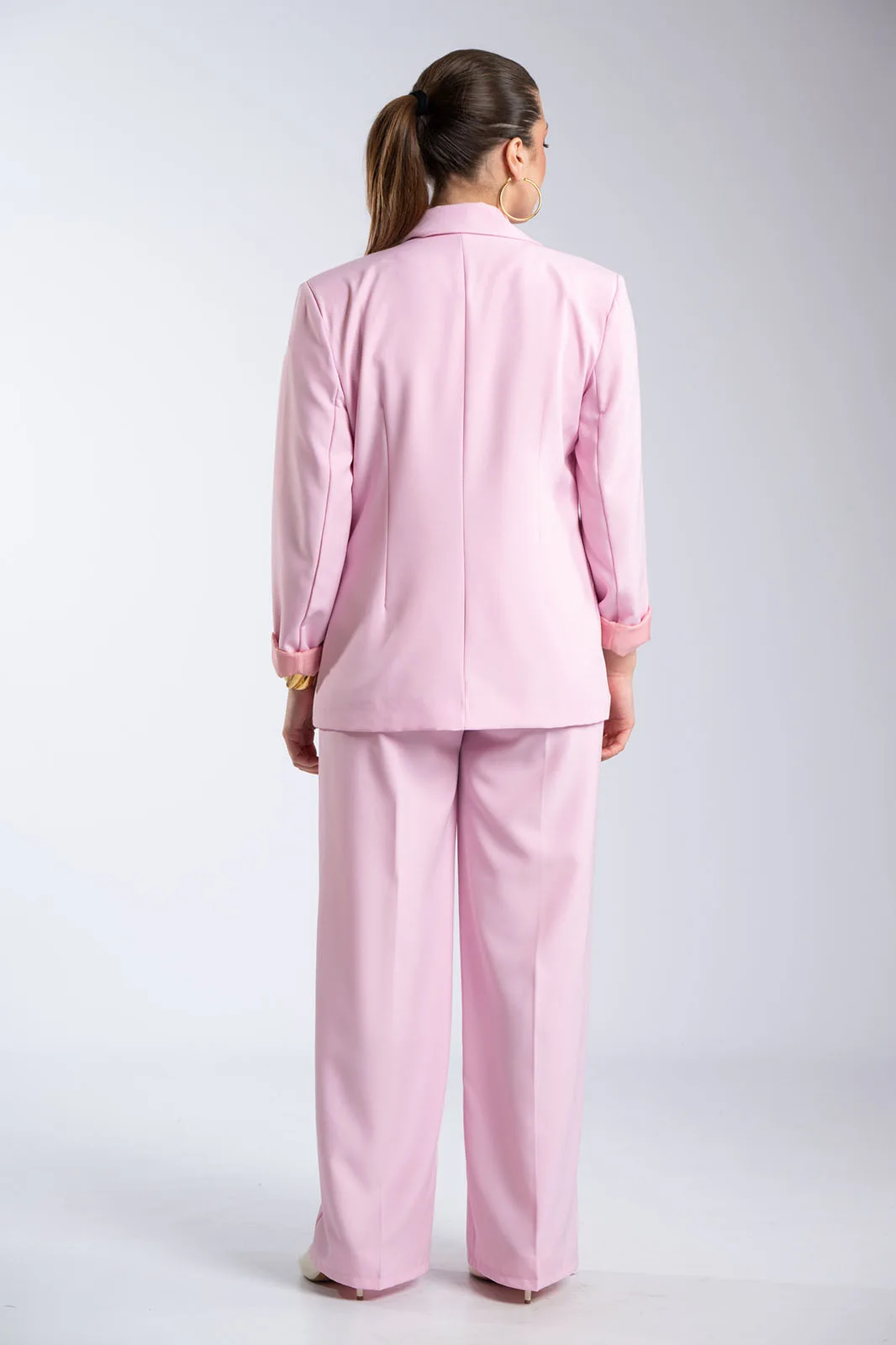 A two-piece suit that exudes timeless elegance and contemporary femininity. The jacket features a classic lapel and single button at the front, creating a clean and balanced line. It has a straight fit with a subtle waistline, offering an elegant and refined result. The trousers have a high Waist and a straight, long line that brings harmony to the whole and highlights the silhouette in an elegant way. The fabric is smooth and stable, allowing the suit to maintain its shape and exude a refined aesthetic. It is made of 71% polyester, 17% viscose, and 12% elastane.