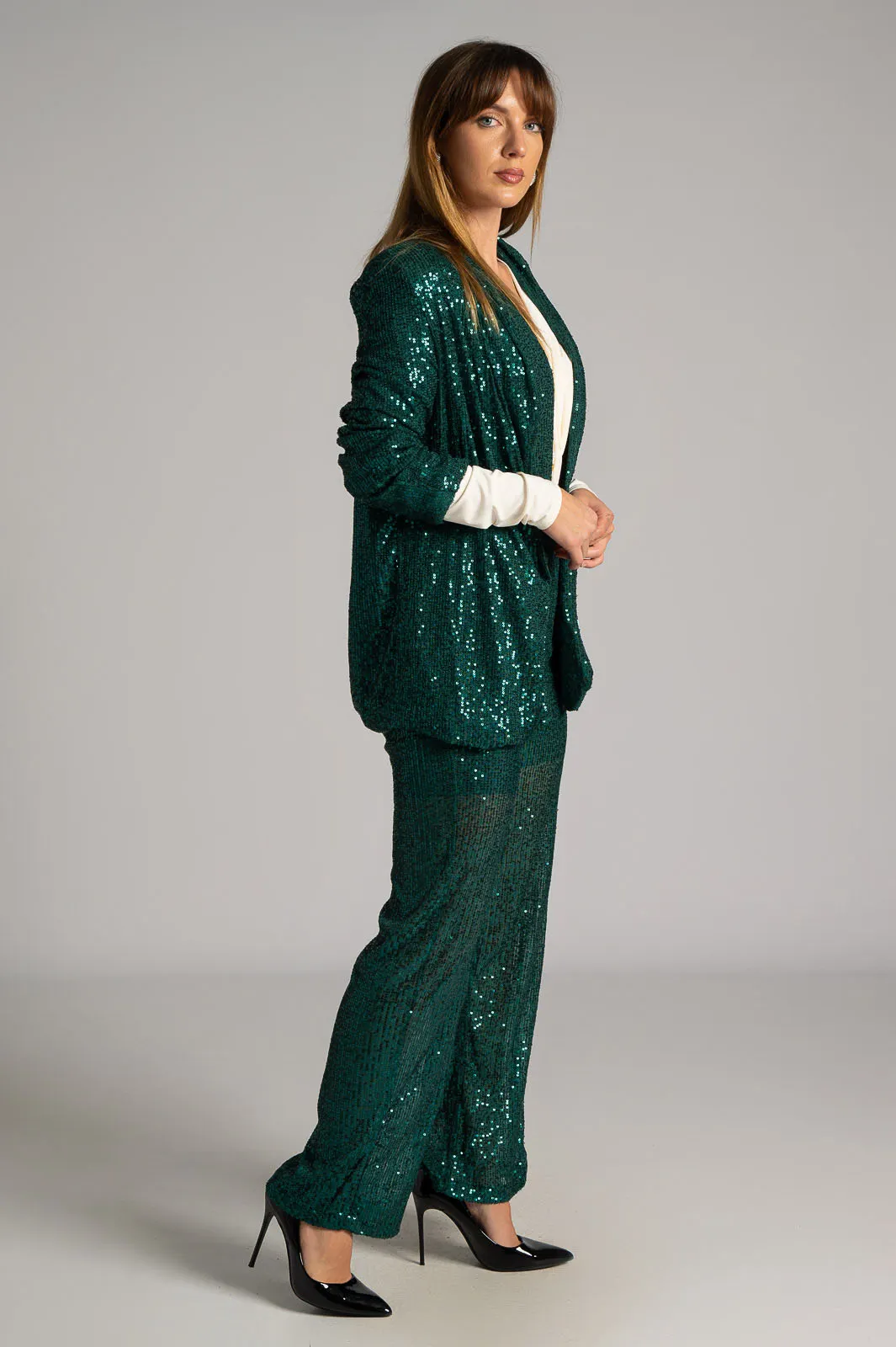 Blazer-pants set in green background with sequins in the same shade all over the surface. The jacket has a collar and lapel. It does not close. The inside is lined. The shoulders are padded. It has been measured with a palm opening. The trousers have an elastic waistband. The inside is lined with shorts. It's a straight fit. It has excellent quality. The measurements in the table are representative of each code.97% polyester, 3% spandex.
