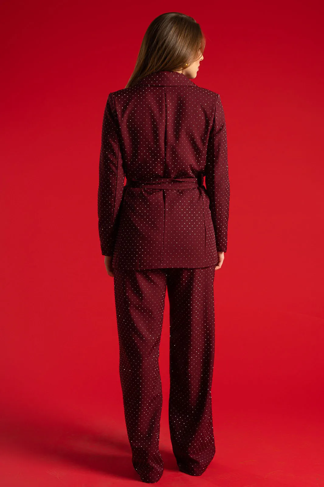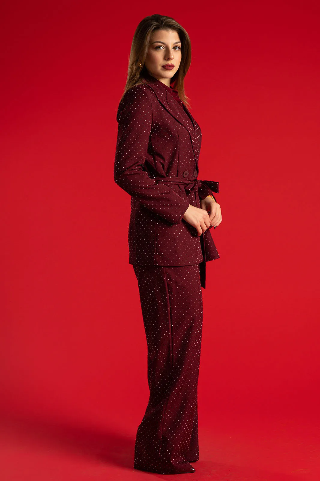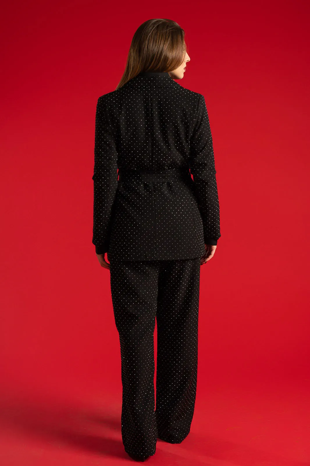 Set consisting of trousers and jacket. The entire surface is decorated with troux. The jacket is straight cut, with a collar and lapels. It has decorative buttons and fastens with one button. It has decorative pockets with flaps and one on the top with a flap. It has shoulder pads and fastens with a belt. It is lined on the inside. The trousers have elastic at the back of the waist. They fasten with a zipper and button. They have a belt on the sides. The measurements on the jacket are taken with the buttons closed. The measurements in the table are representative for each code. 95% polyester, 5% elastane.