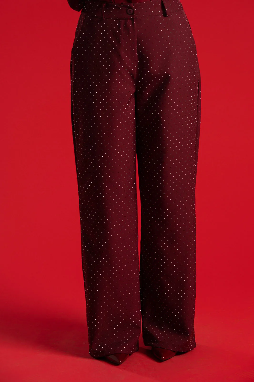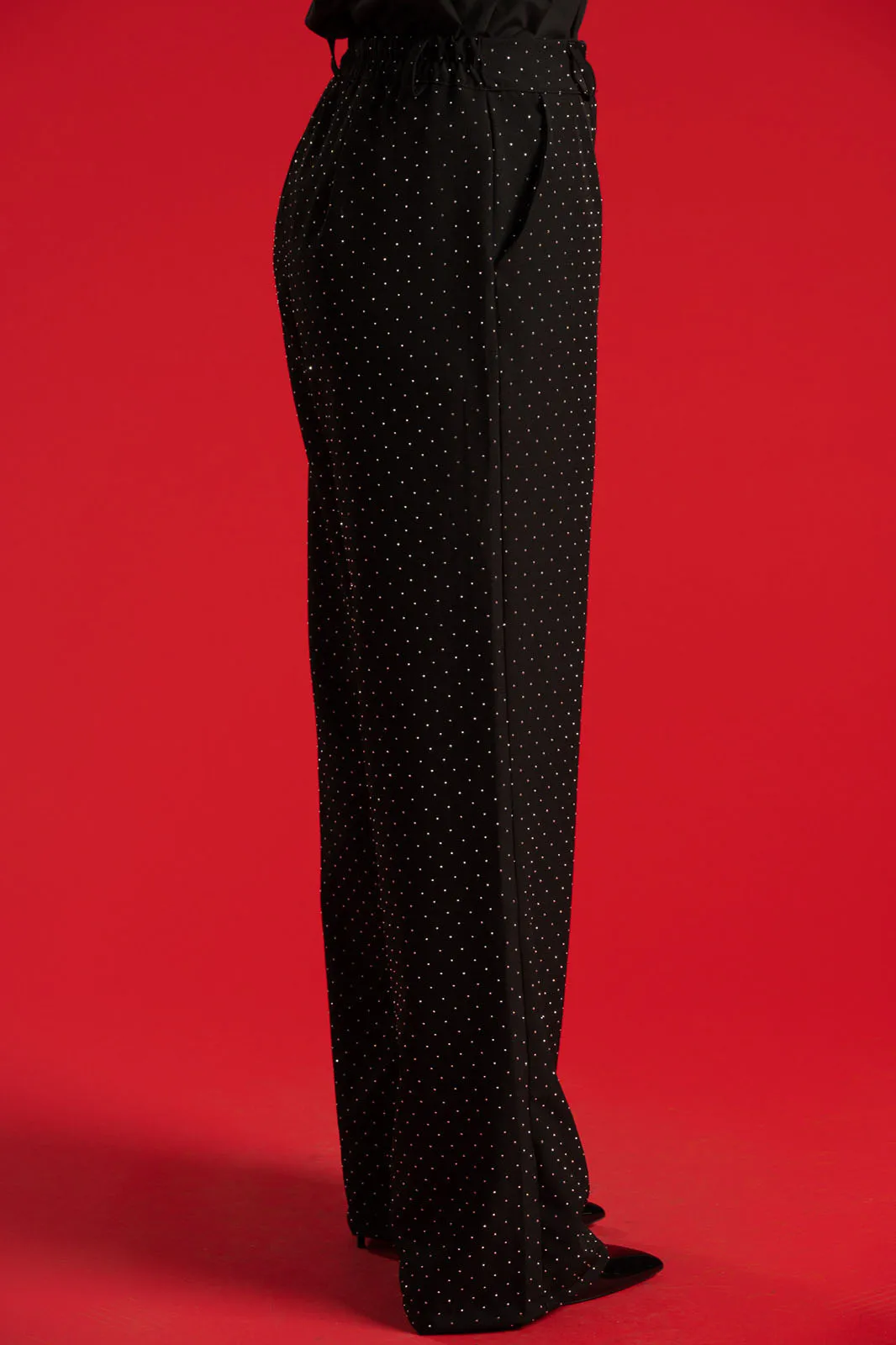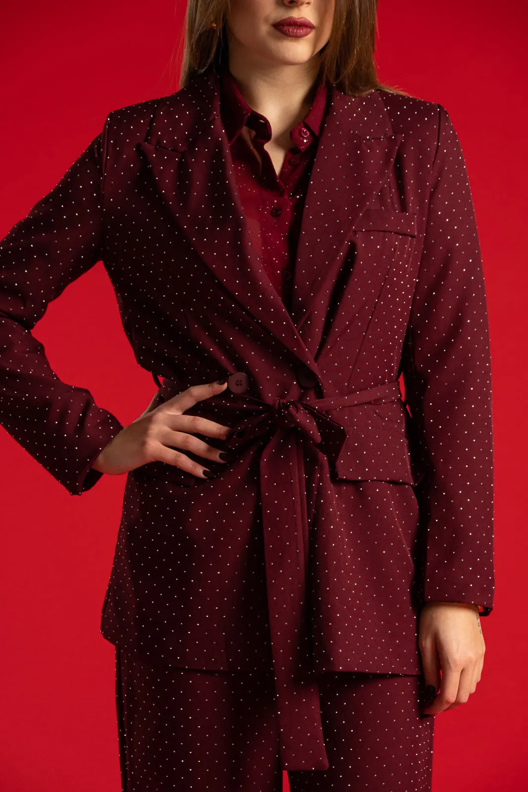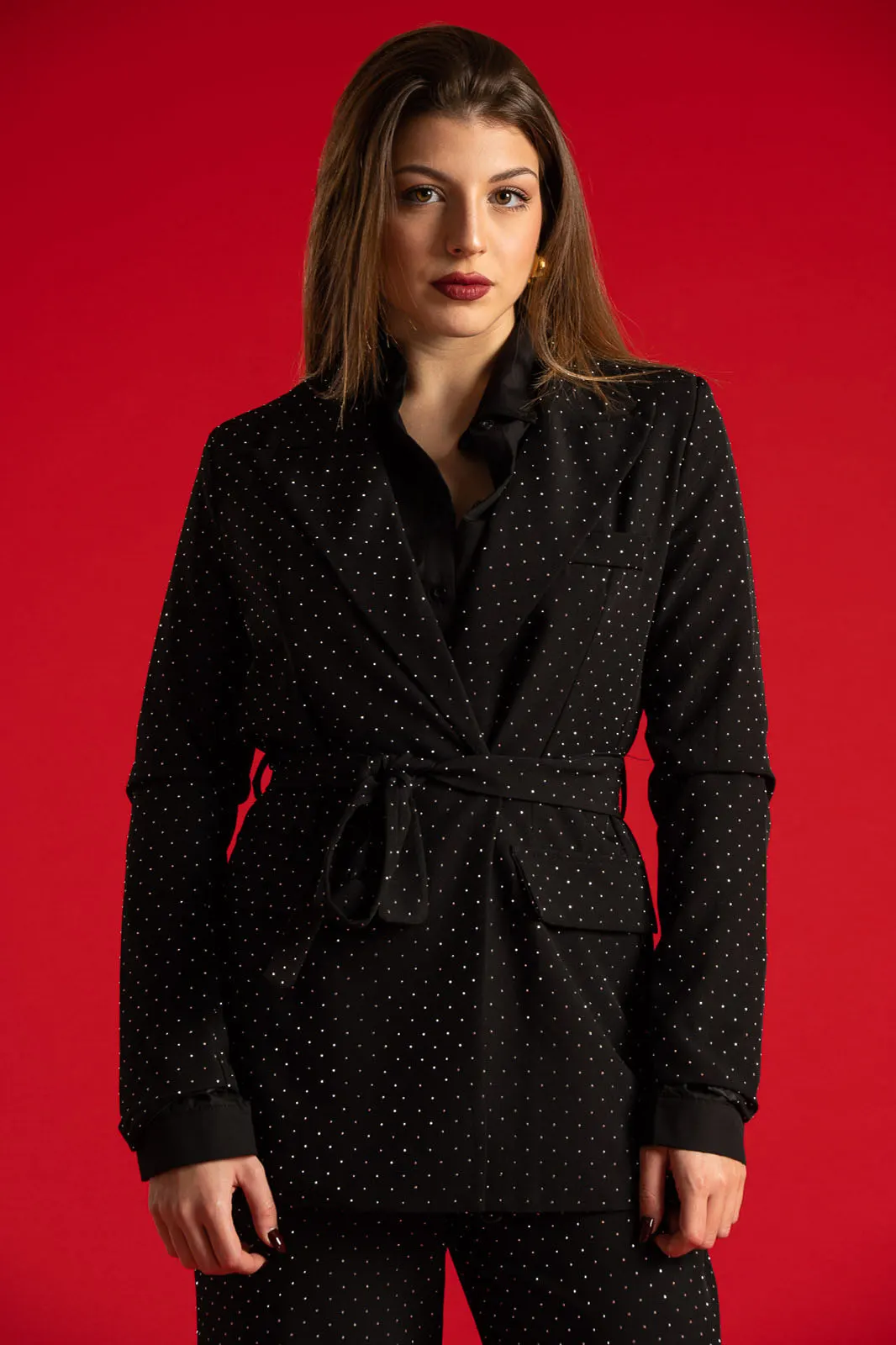 Set consisting of trousers and jacket. The entire surface is decorated with troux. The jacket is straight cut, with a collar and lapels. It has decorative buttons and fastens with one button. It has decorative pockets with flaps and one on the top with a flap. It has shoulder pads and fastens with a belt. It is lined on the inside. The trousers have elastic at the back of the waist. They fasten with a zipper and button. They have a belt on the sides. The measurements on the jacket are taken with the buttons closed. The measurements in the table are representative for each code. 95% polyester, 5% elastane.