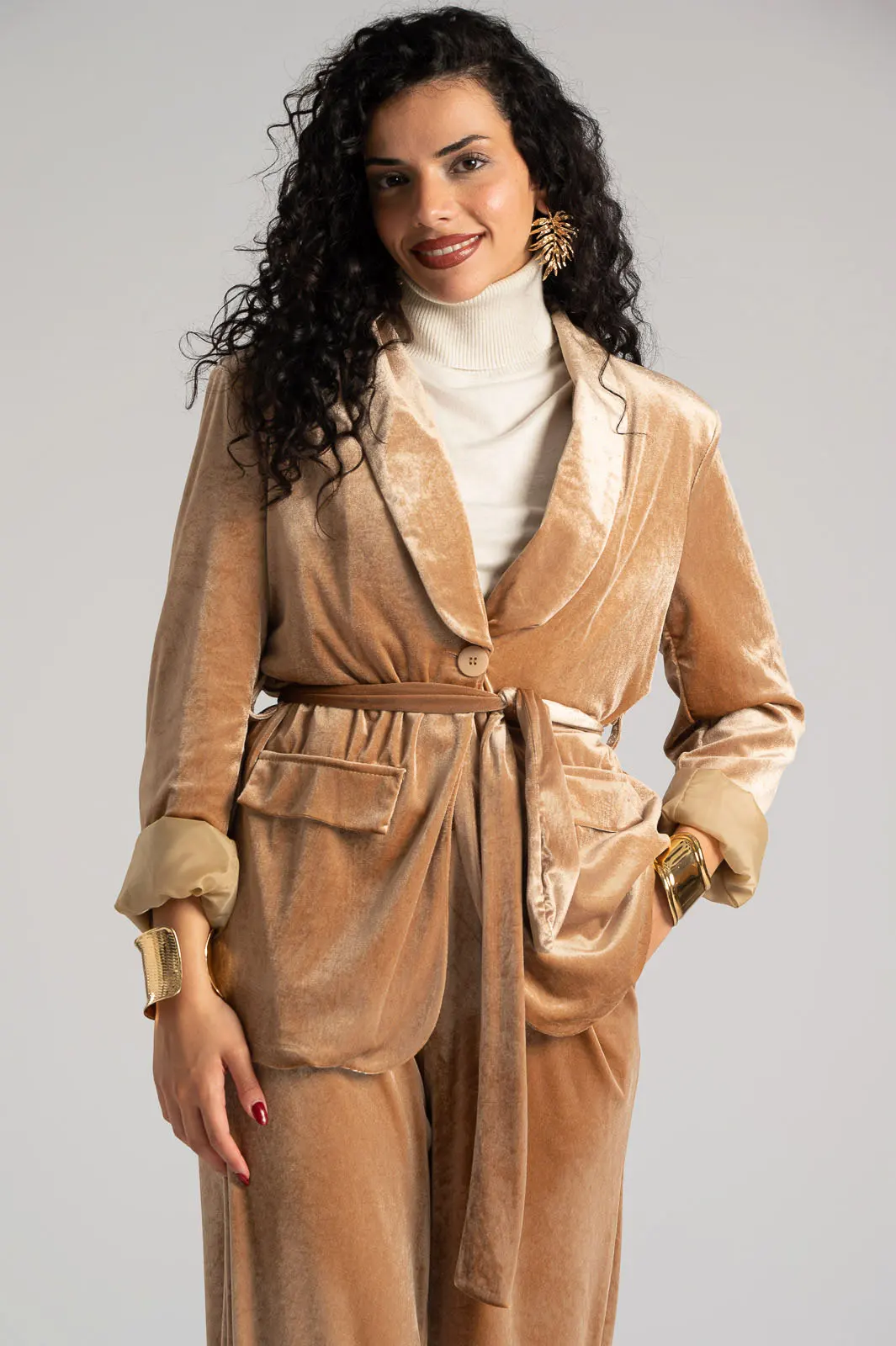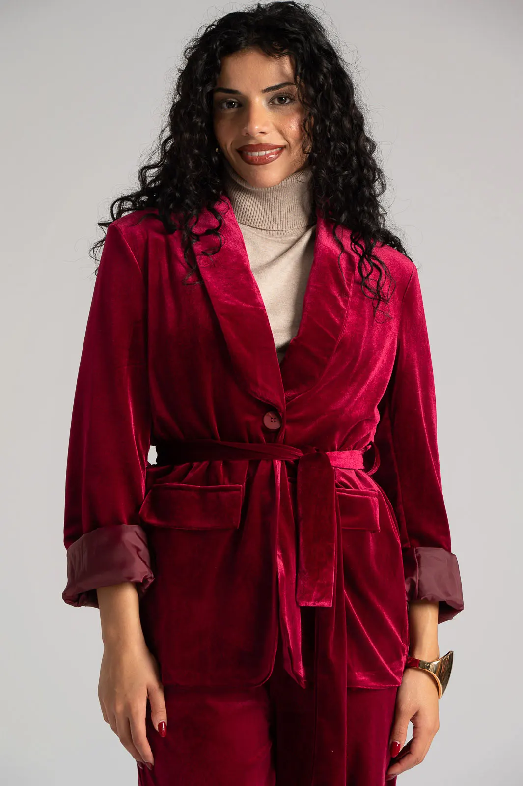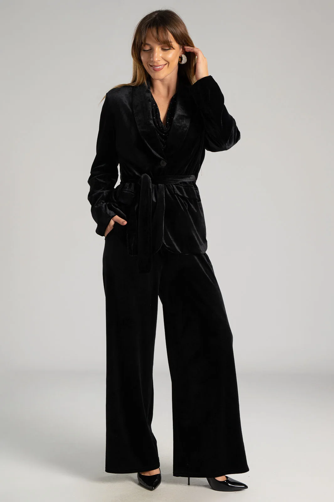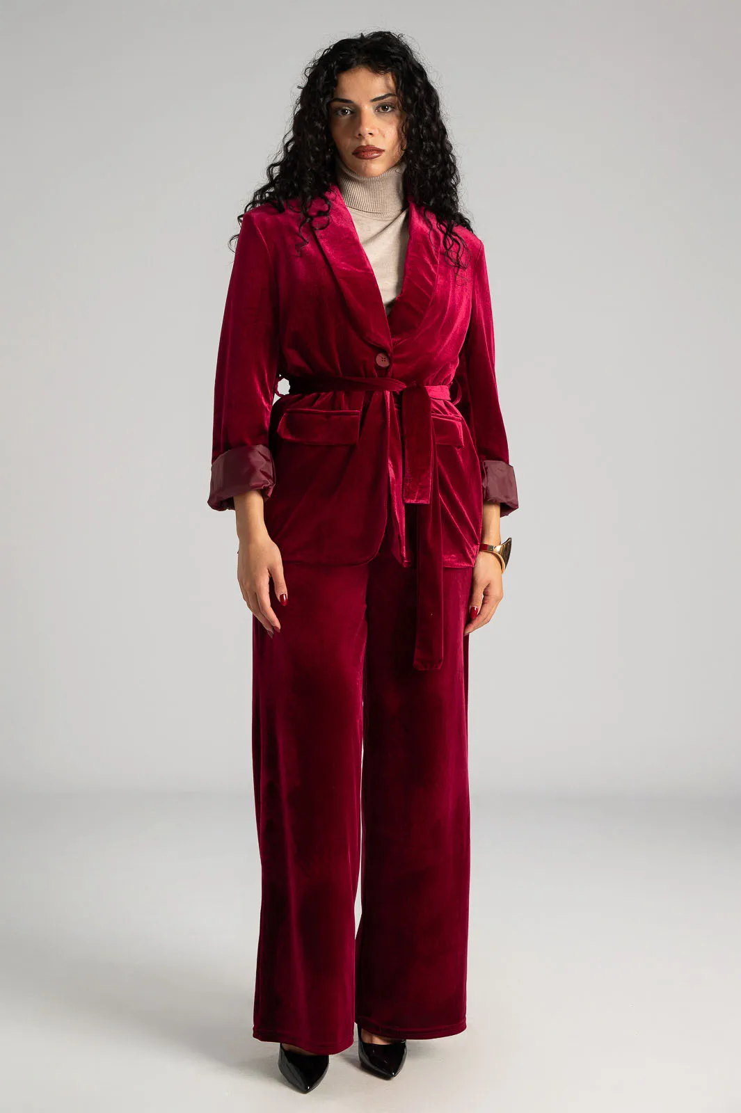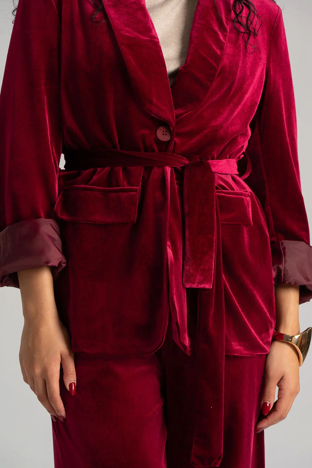Σετ που αποτελείται από σακάκι και παντελόνι. Είναι σε velvet υφή. Το σακάκι έχει γιακά και πέτο. Κλείνει με ένα κουμπί και διαθέτει και δική του ζώνη στην ίδια υφή. Είναι φοδραρισμένο. Στην μπροστινή μεριά έχει εικονικές τσέπες με καπάκι. Έχει βάτες στους ώμους. Το παντελόνι είναι σε ίσια γραμμή. Στη μέση διαθέτει περιμετρικά λάστιχο με κορδόνι για καλύτερη εφαρμογή. Είναι σε ίσια γραμμή. Έχει πλαινές τσέπες. Οι μετρήσεις του πίνακα είναι αντιπροσωπευτικές για κάθε προϊόν. 95% polyester, 5% elastan.