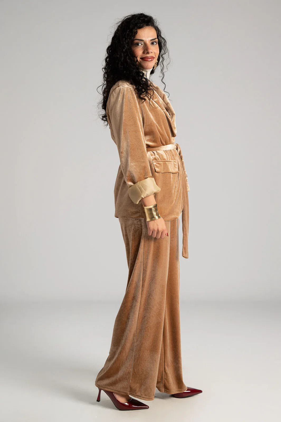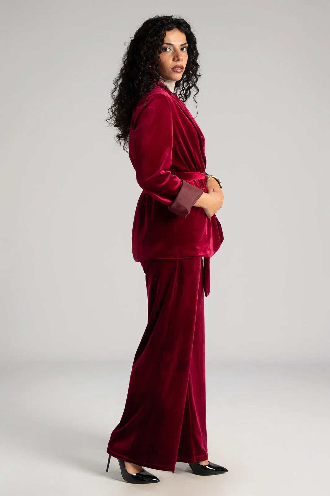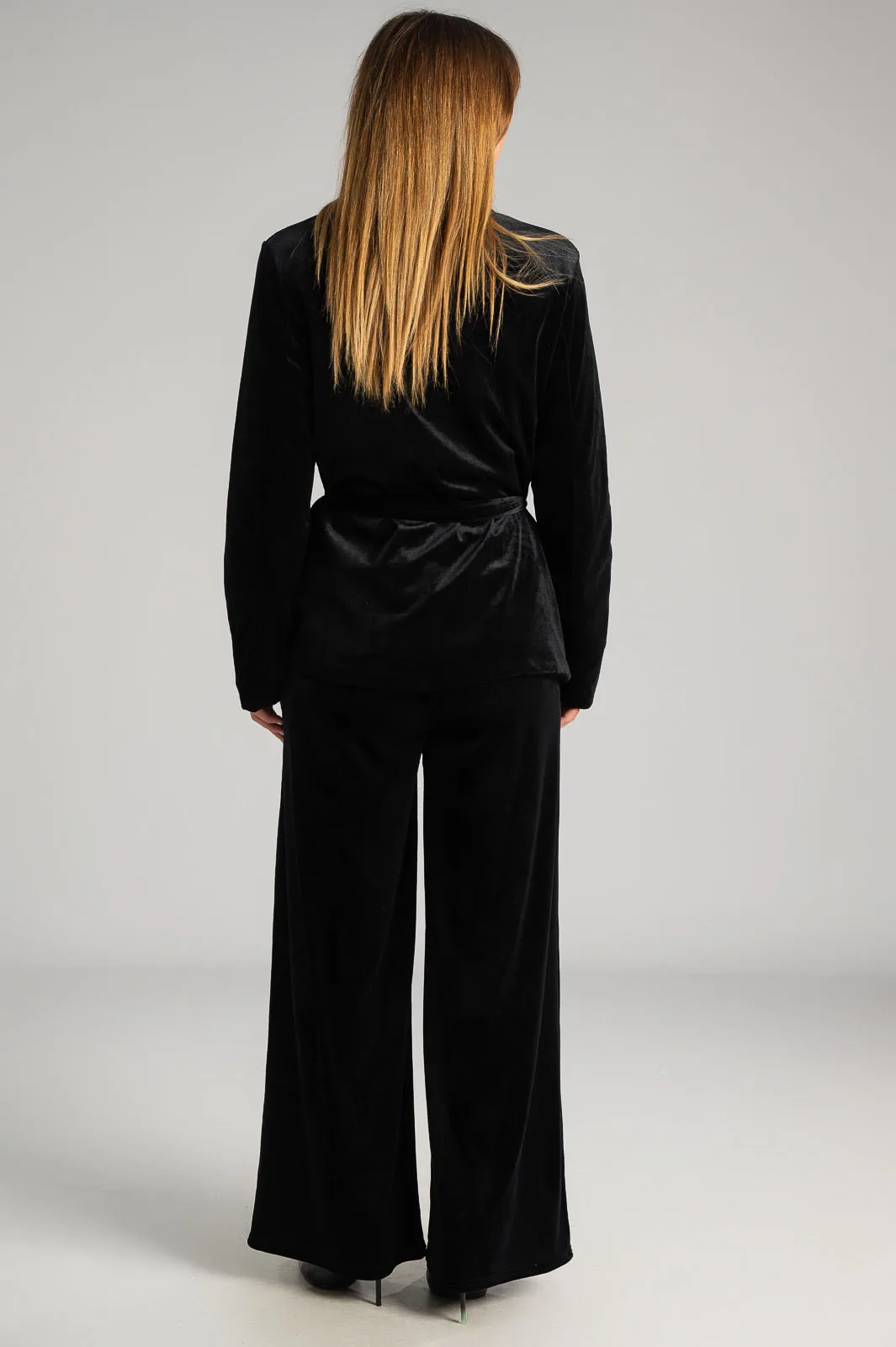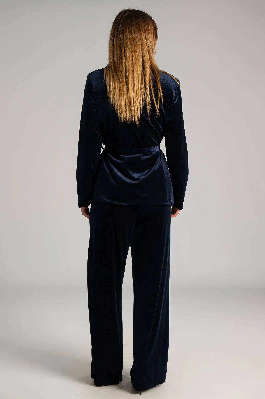 Σετ που αποτελείται από σακάκι και παντελόνι. Είναι σε velvet υφή. Το σακάκι έχει γιακά και πέτο. Κλείνει με ένα κουμπί και διαθέτει και δική του ζώνη στην ίδια υφή. Είναι φοδραρισμένο. Στην μπροστινή μεριά έχει εικονικές τσέπες με καπάκι. Έχει βάτες στους ώμους. Το παντελόνι είναι σε ίσια γραμμή. Στη μέση διαθέτει περιμετρικά λάστιχο με κορδόνι για καλύτερη εφαρμογή. Είναι σε ίσια γραμμή. Έχει πλαινές τσέπες. Οι μετρήσεις του πίνακα είναι αντιπροσωπευτικές για κάθε προϊόν. 95% polyester, 5% elastan.