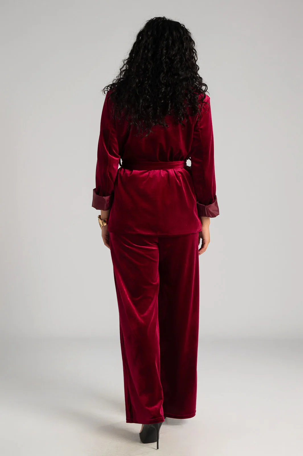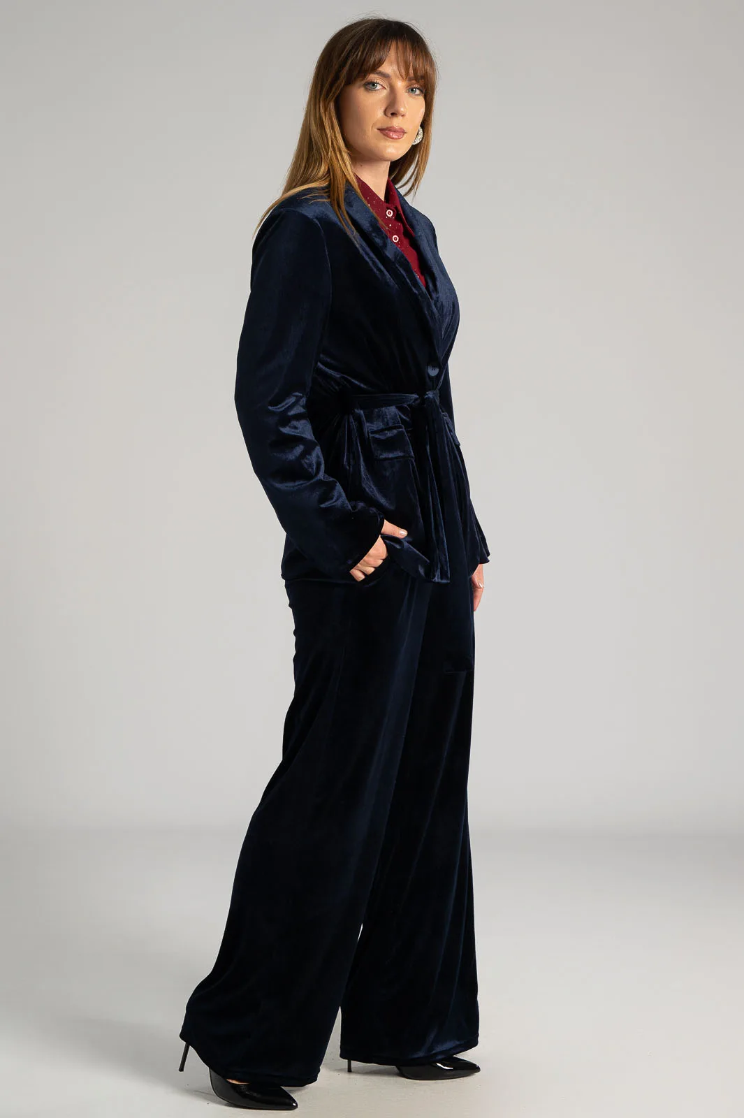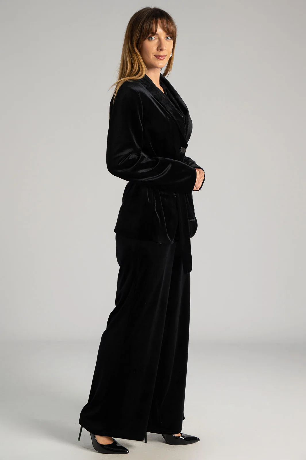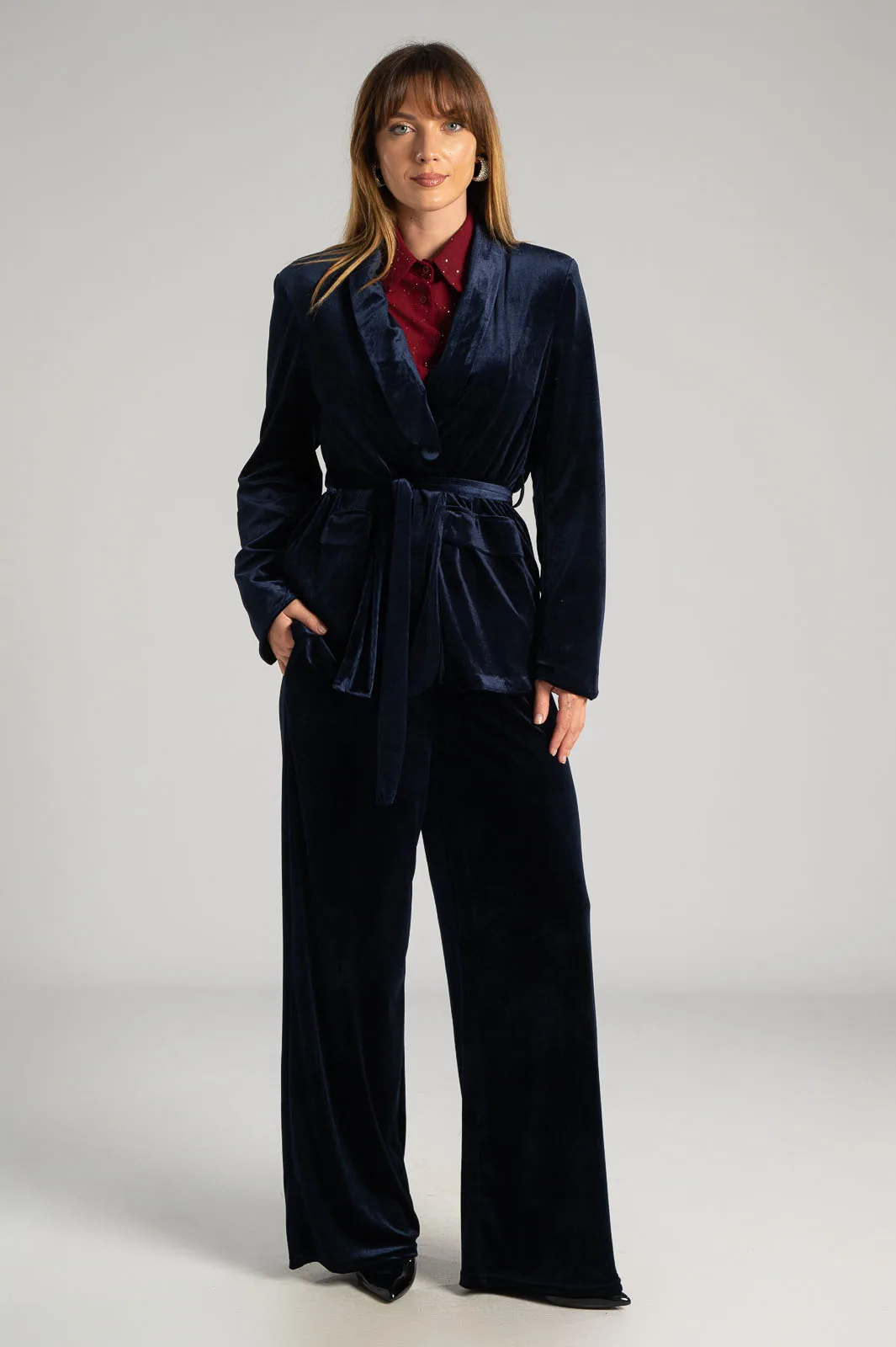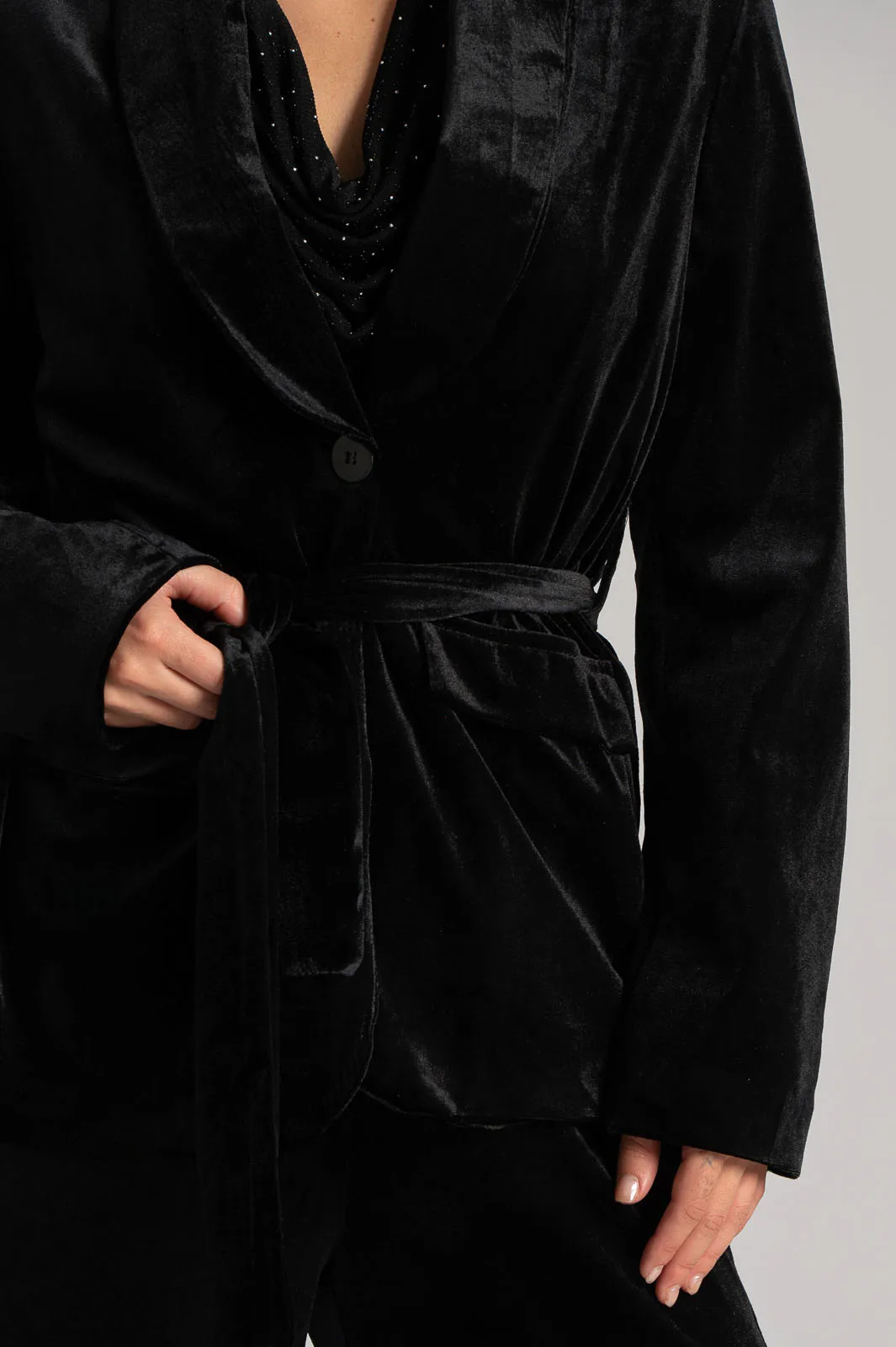 Σετ που αποτελείται από σακάκι και παντελόνι. Είναι σε velvet υφή. Το σακάκι έχει γιακά και πέτο. Κλείνει με ένα κουμπί και διαθέτει και δική του ζώνη στην ίδια υφή. Είναι φοδραρισμένο. Στην μπροστινή μεριά έχει εικονικές τσέπες με καπάκι. Έχει βάτες στους ώμους. Το παντελόνι είναι σε ίσια γραμμή. Στη μέση διαθέτει περιμετρικά λάστιχο με κορδόνι για καλύτερη εφαρμογή. Είναι σε ίσια γραμμή. Έχει πλαινές τσέπες. Οι μετρήσεις του πίνακα είναι αντιπροσωπευτικές για κάθε προϊόν. 95% polyester, 5% elastan.