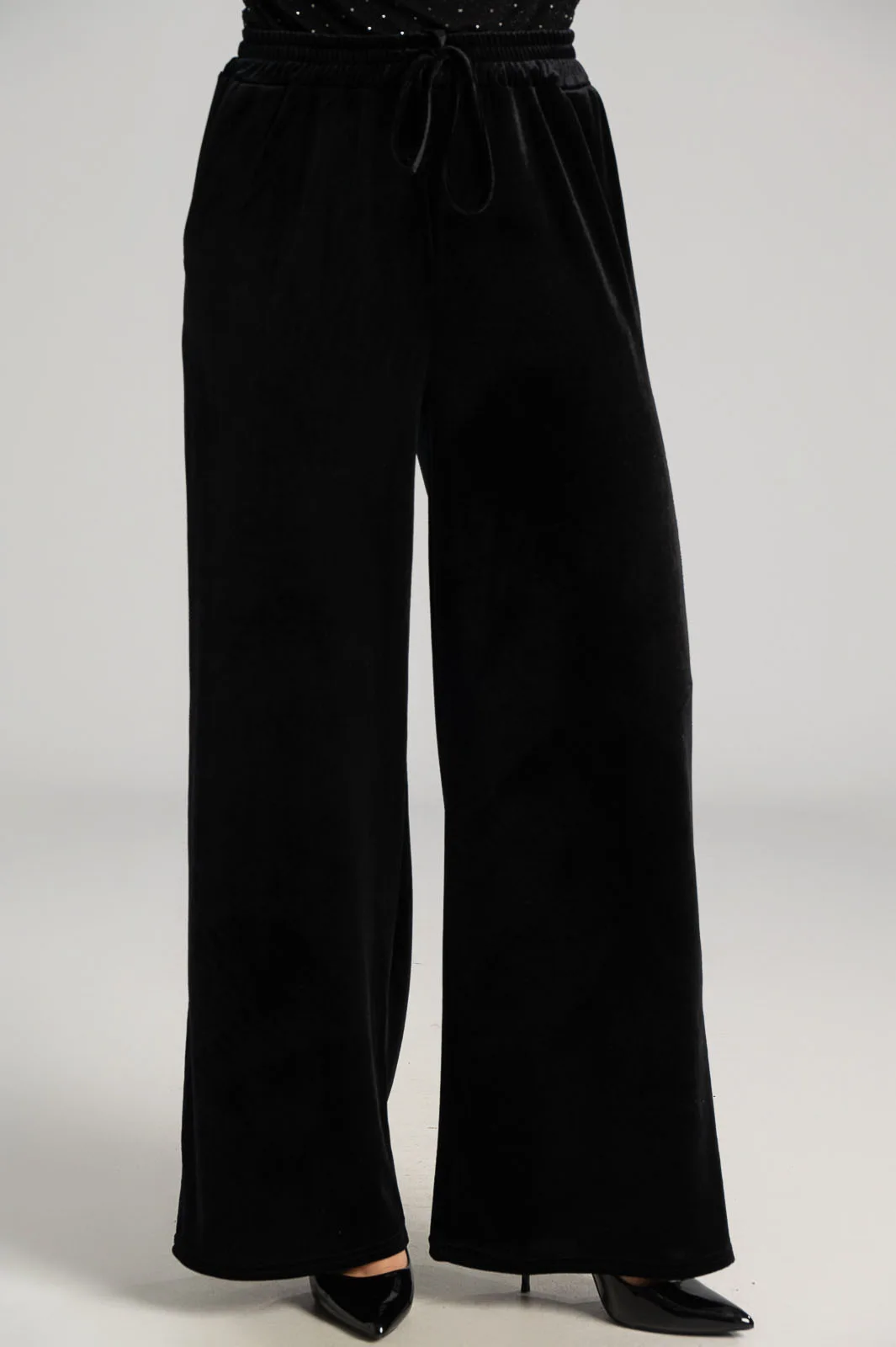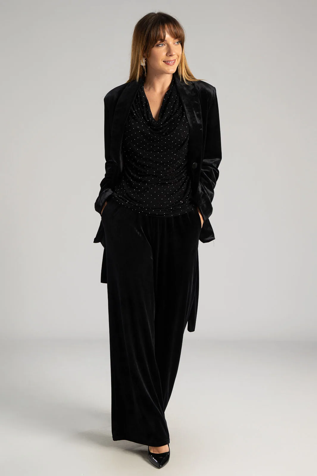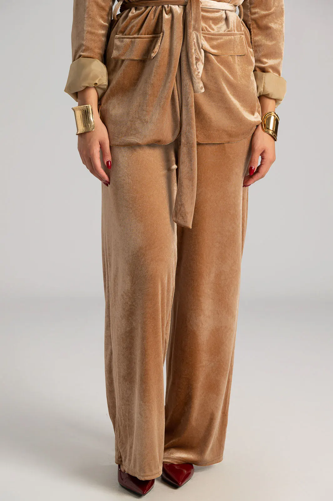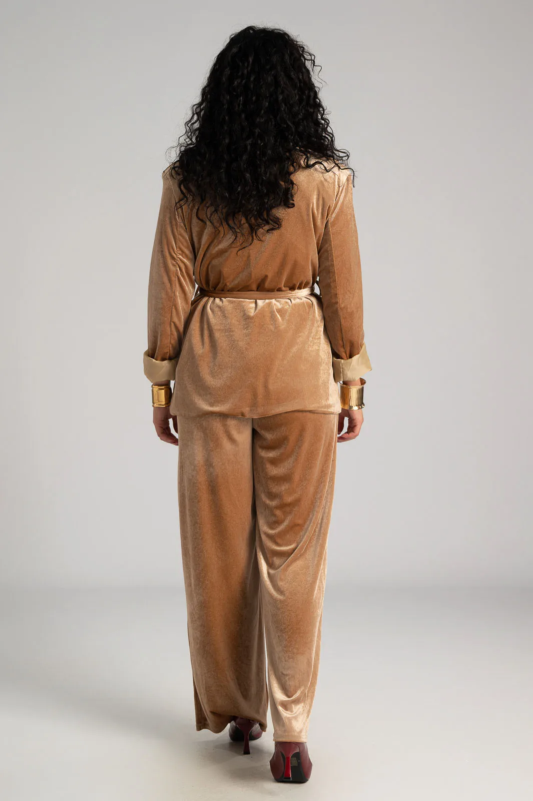Σετ που αποτελείται από σακάκι και παντελόνι. Είναι σε velvet υφή. Το σακάκι έχει γιακά και πέτο. Κλείνει με ένα κουμπί και διαθέτει και δική του ζώνη στην ίδια υφή. Είναι φοδραρισμένο. Στην μπροστινή μεριά έχει εικονικές τσέπες με καπάκι. Έχει βάτες στους ώμους. Το παντελόνι είναι σε ίσια γραμμή. Στη μέση διαθέτει περιμετρικά λάστιχο με κορδόνι για καλύτερη εφαρμογή. Είναι σε ίσια γραμμή. Έχει πλαινές τσέπες. Οι μετρήσεις του πίνακα είναι αντιπροσωπευτικές για κάθε προϊόν. 95% polyester, 5% elastan.