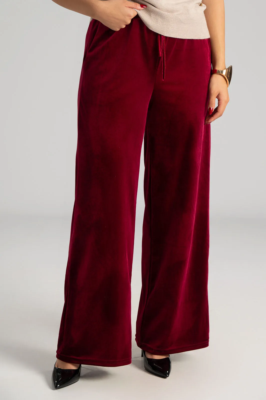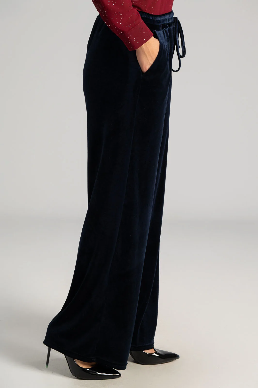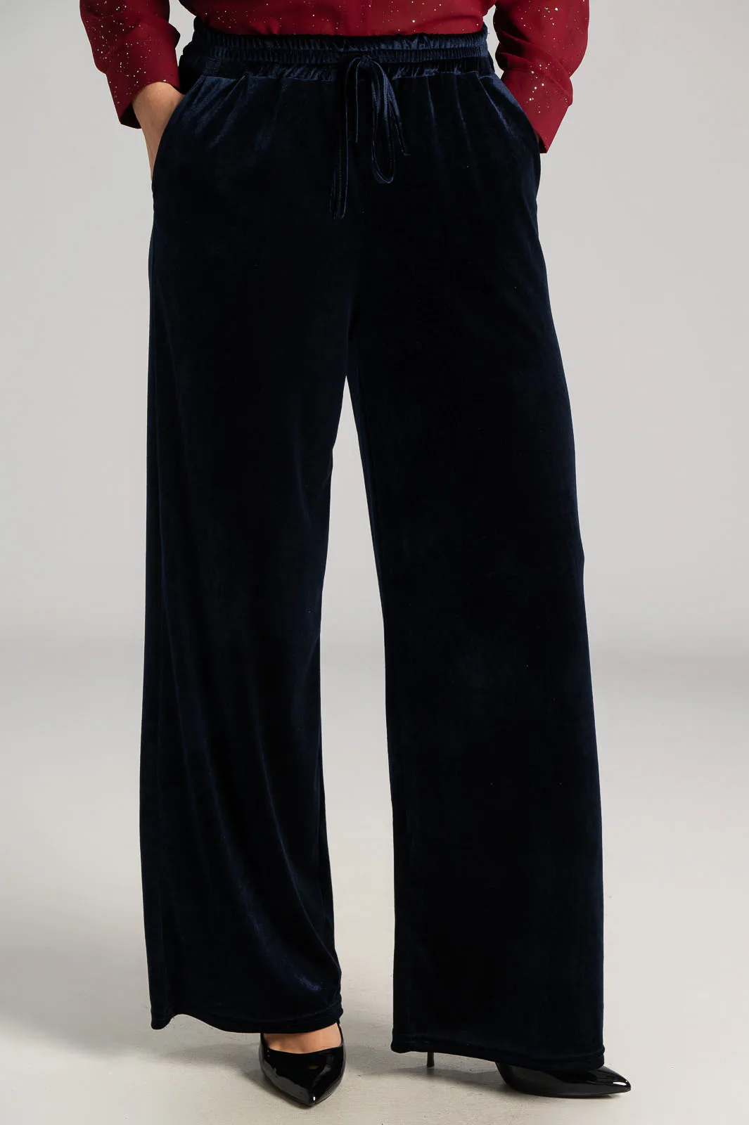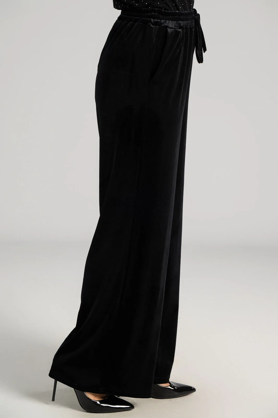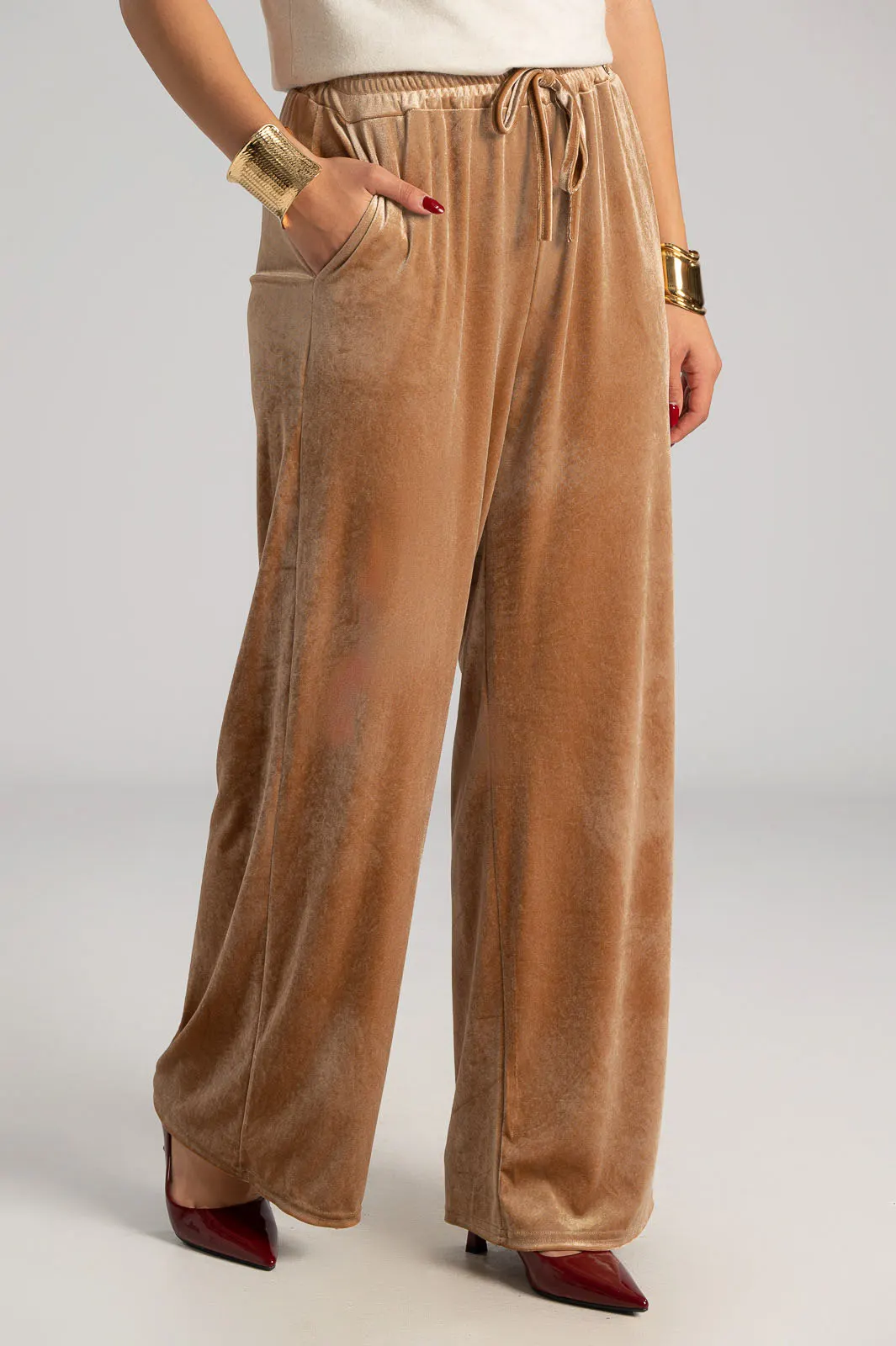 Σετ που αποτελείται από σακάκι και παντελόνι. Είναι σε velvet υφή. Το σακάκι έχει γιακά και πέτο. Κλείνει με ένα κουμπί και διαθέτει και δική του ζώνη στην ίδια υφή. Είναι φοδραρισμένο. Στην μπροστινή μεριά έχει εικονικές τσέπες με καπάκι. Έχει βάτες στους ώμους. Το παντελόνι είναι σε ίσια γραμμή. Στη μέση διαθέτει περιμετρικά λάστιχο με κορδόνι για καλύτερη εφαρμογή. Είναι σε ίσια γραμμή. Έχει πλαινές τσέπες. Οι μετρήσεις του πίνακα είναι αντιπροσωπευτικές για κάθε προϊόν. 95% polyester, 5% elastan.