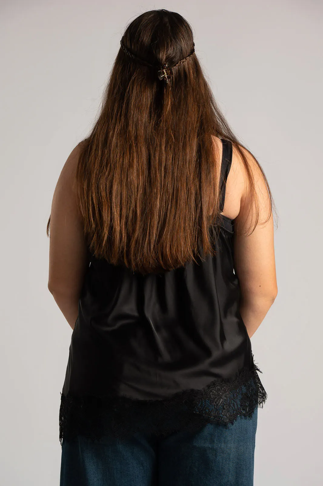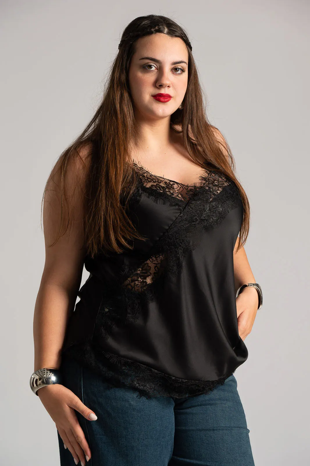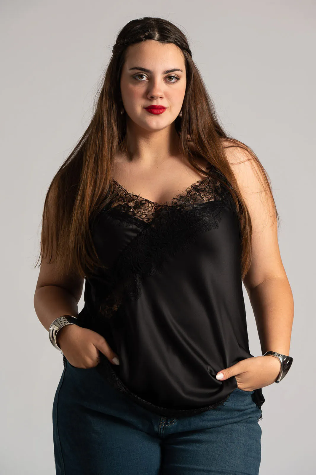 Satin lingerie with a V-neckline. It has a thin, stable strap at the back is elastic for a better fit. Decorative lace around the neckline and on the surface. The measurements in the table are representative for each product. 100% polyester.